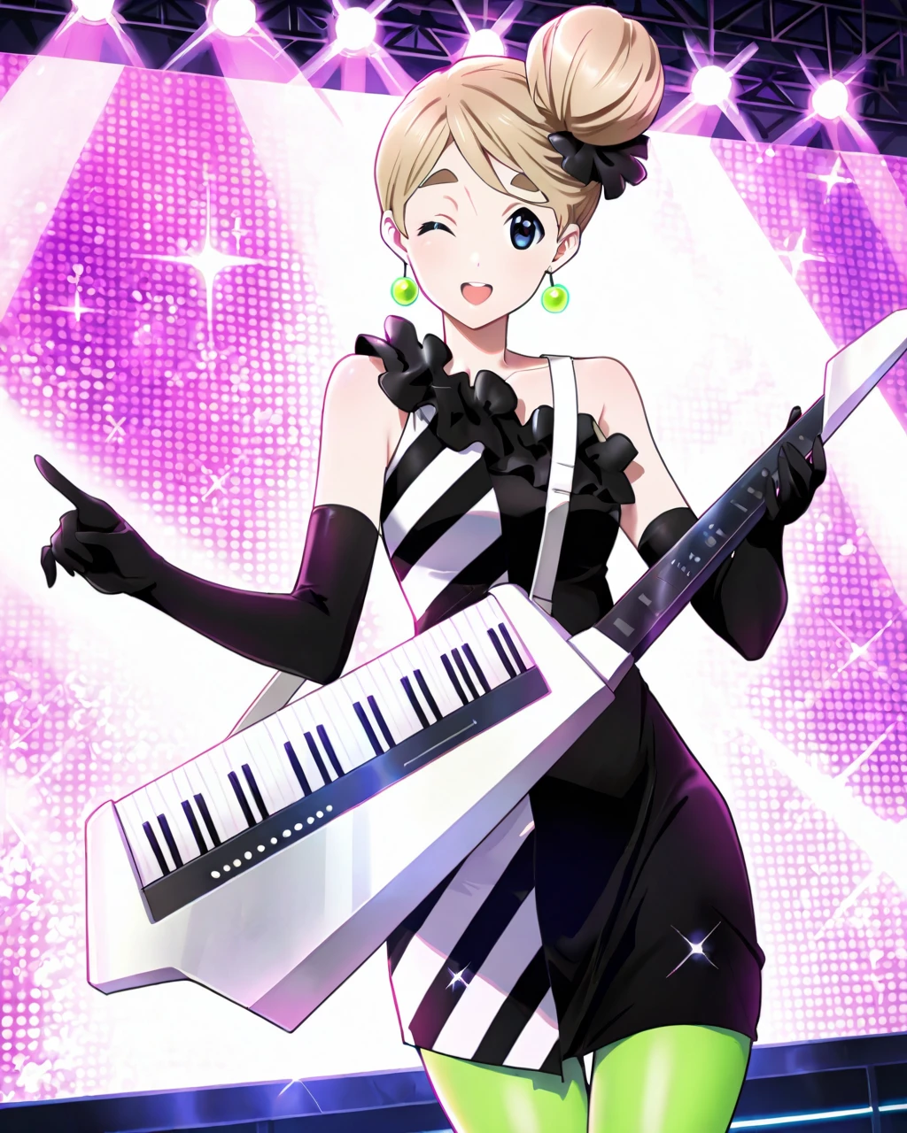 blonde_hair, short hair, blue_eyes, thick_eyebrows, hair_bun, black_hair_bow, green_earrings, black_gloves, elbow gloves, striped dress, green pantyhose