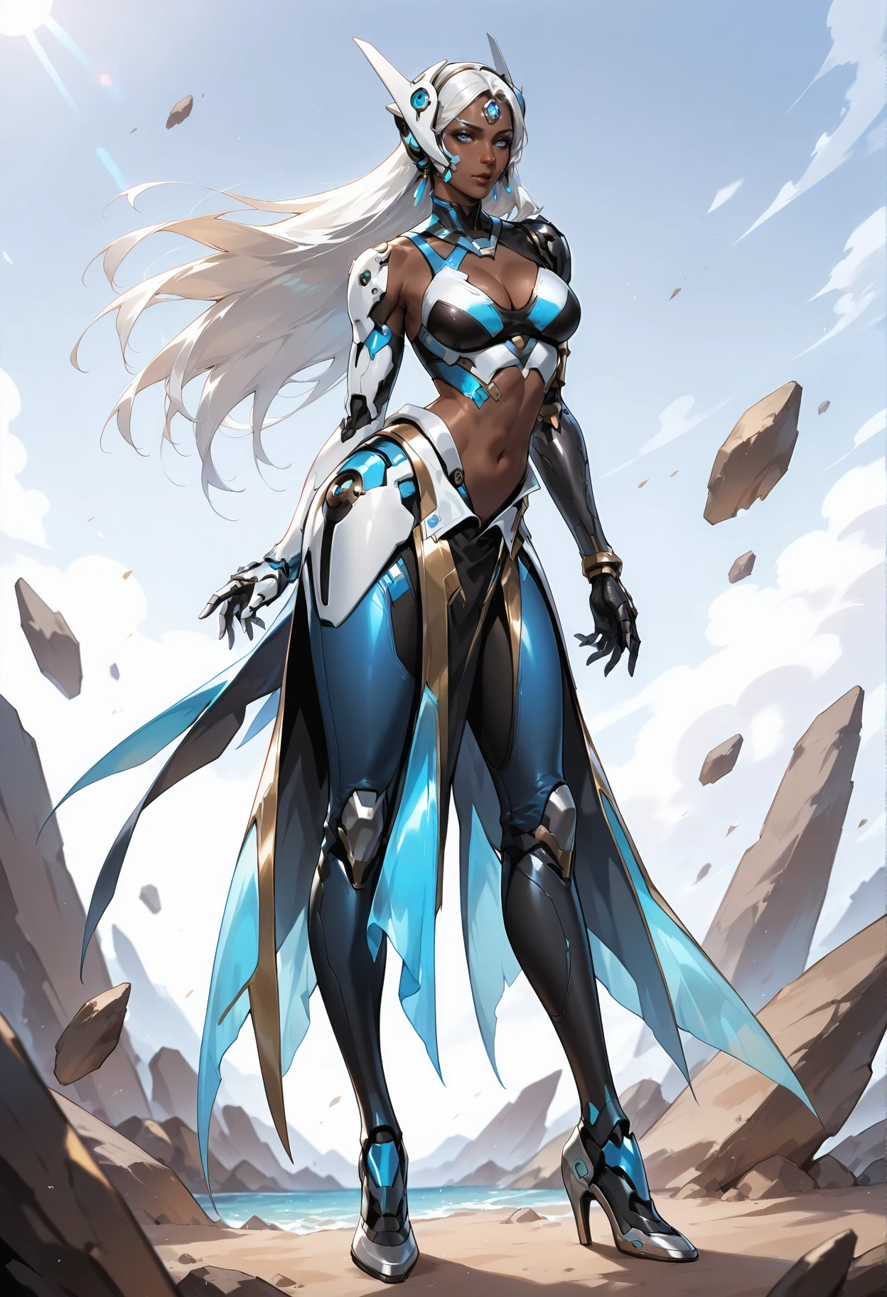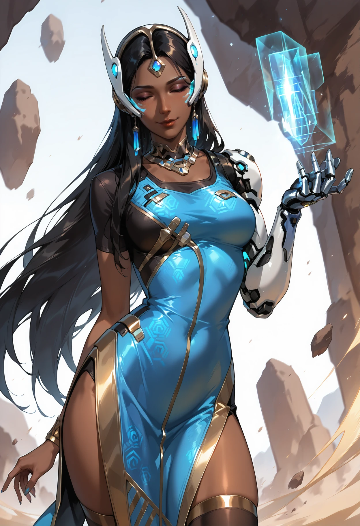 thighhighs,single mechanical arm,mechanical arms,jewelry,headgear,dress,earrings,cyborg,high heels,black thighhighs,pelvic curtain,necklace,blue dress,breasts,nail polish,medium breasts,side slit,high heel boots,aqua nails,blue nails