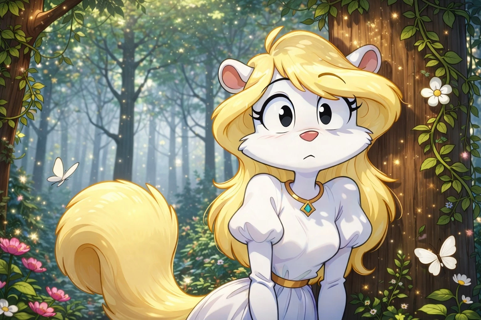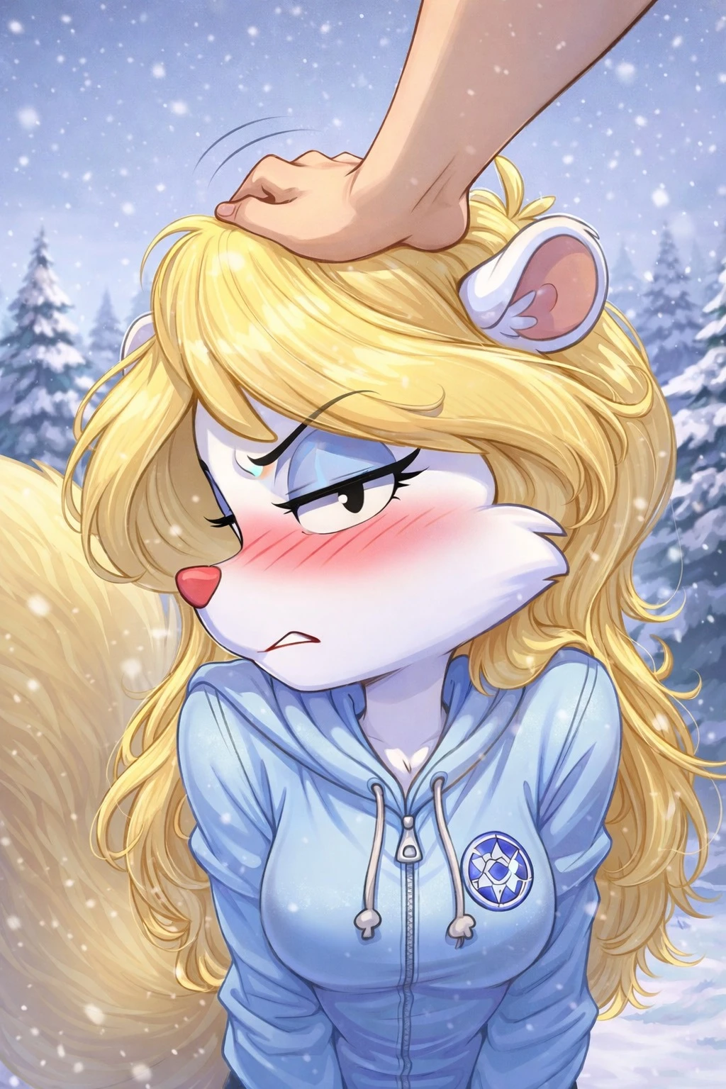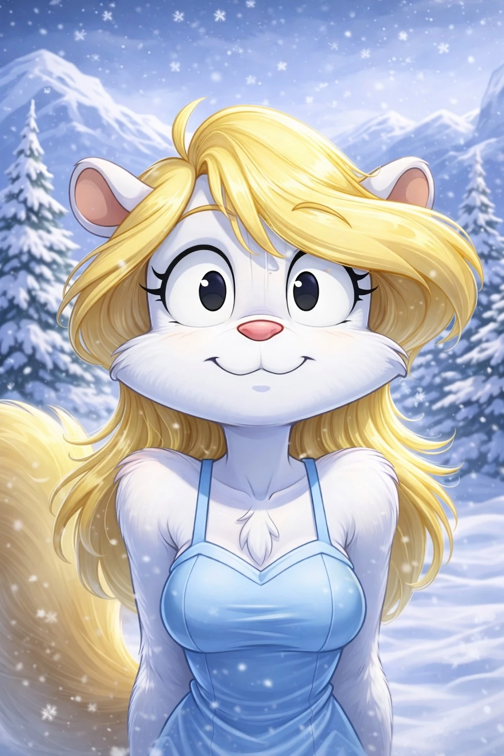 minerva_mink, 1girl, solo, furry, furry female, blonde hair, long hair, white fur, animal ears, animal nose, tail,