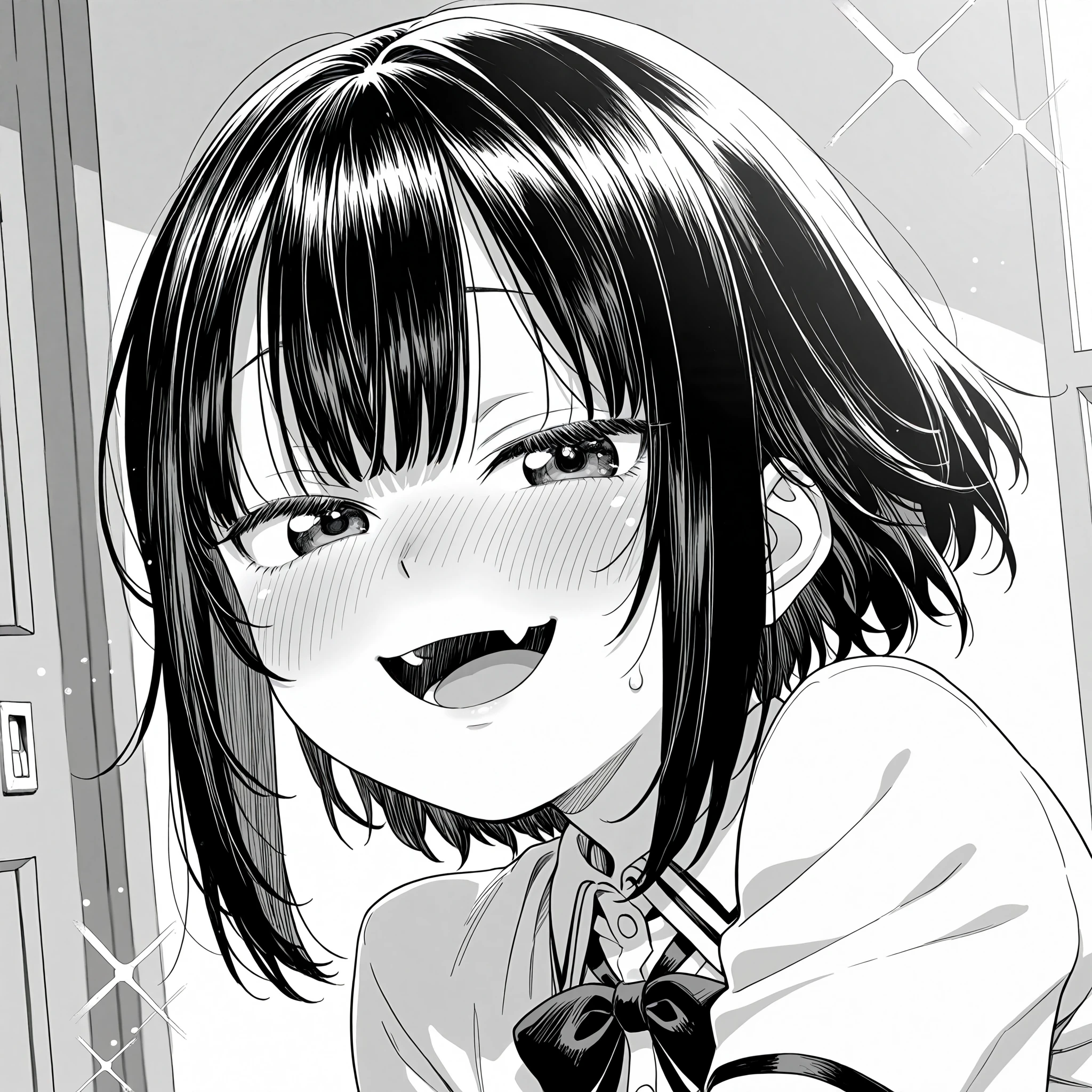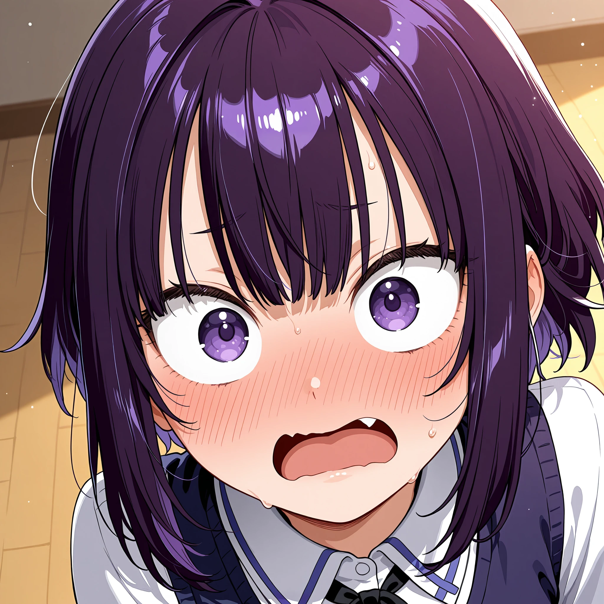 Useful keywords: fuwa, short hair, black_hair, bright purple eyes, petite, big eyes, fang