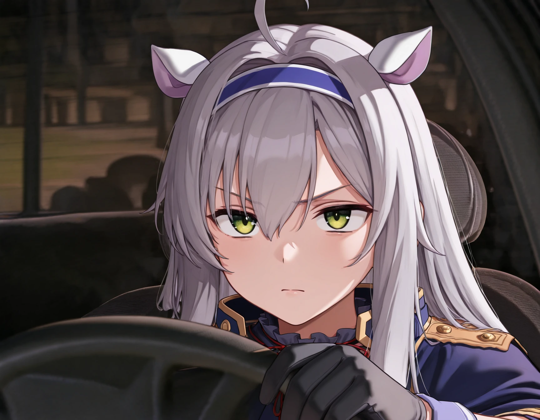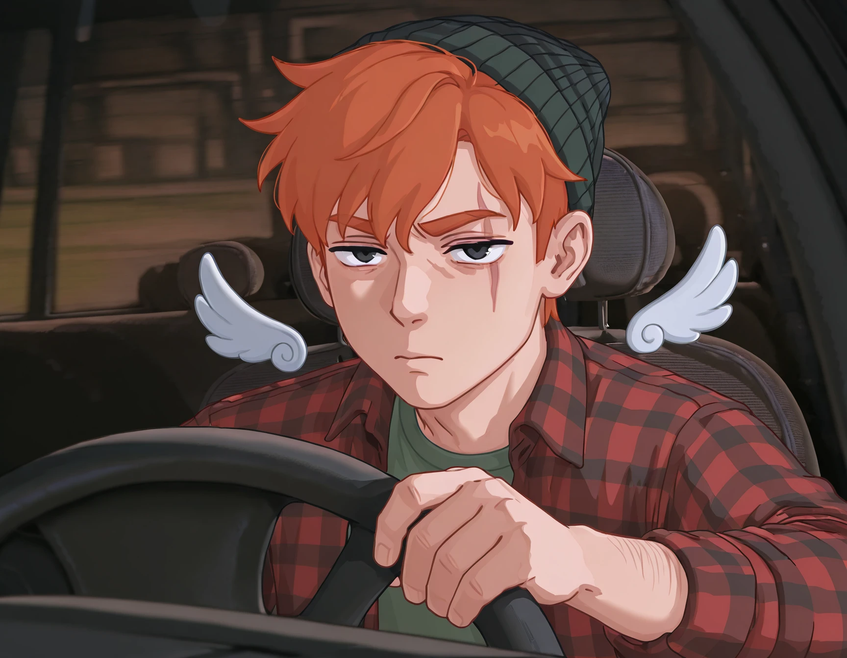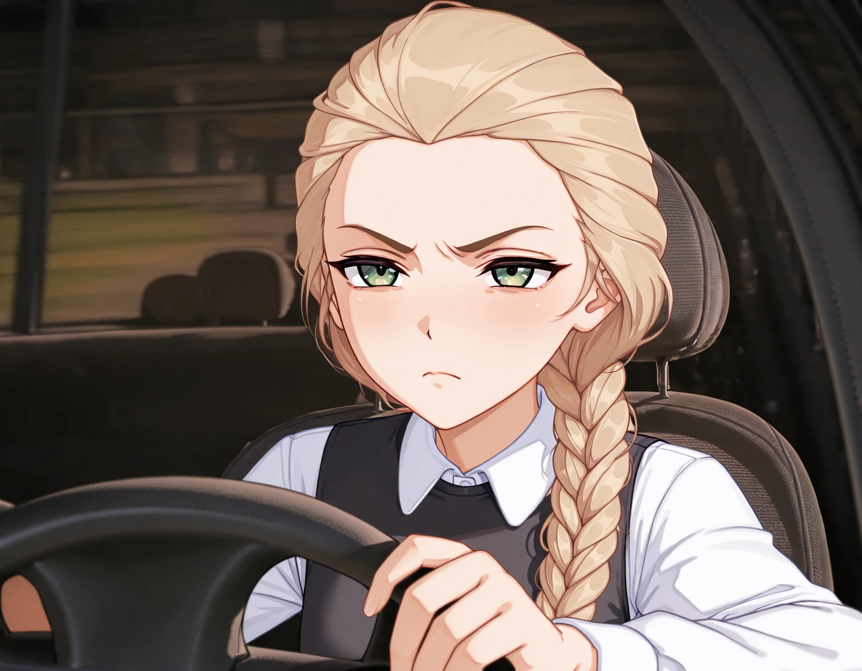 CntPr0v31t, serious expression, focused face, in car, hand on steering wheel, looking forward, concentrated look, closed mouth, suspicious look