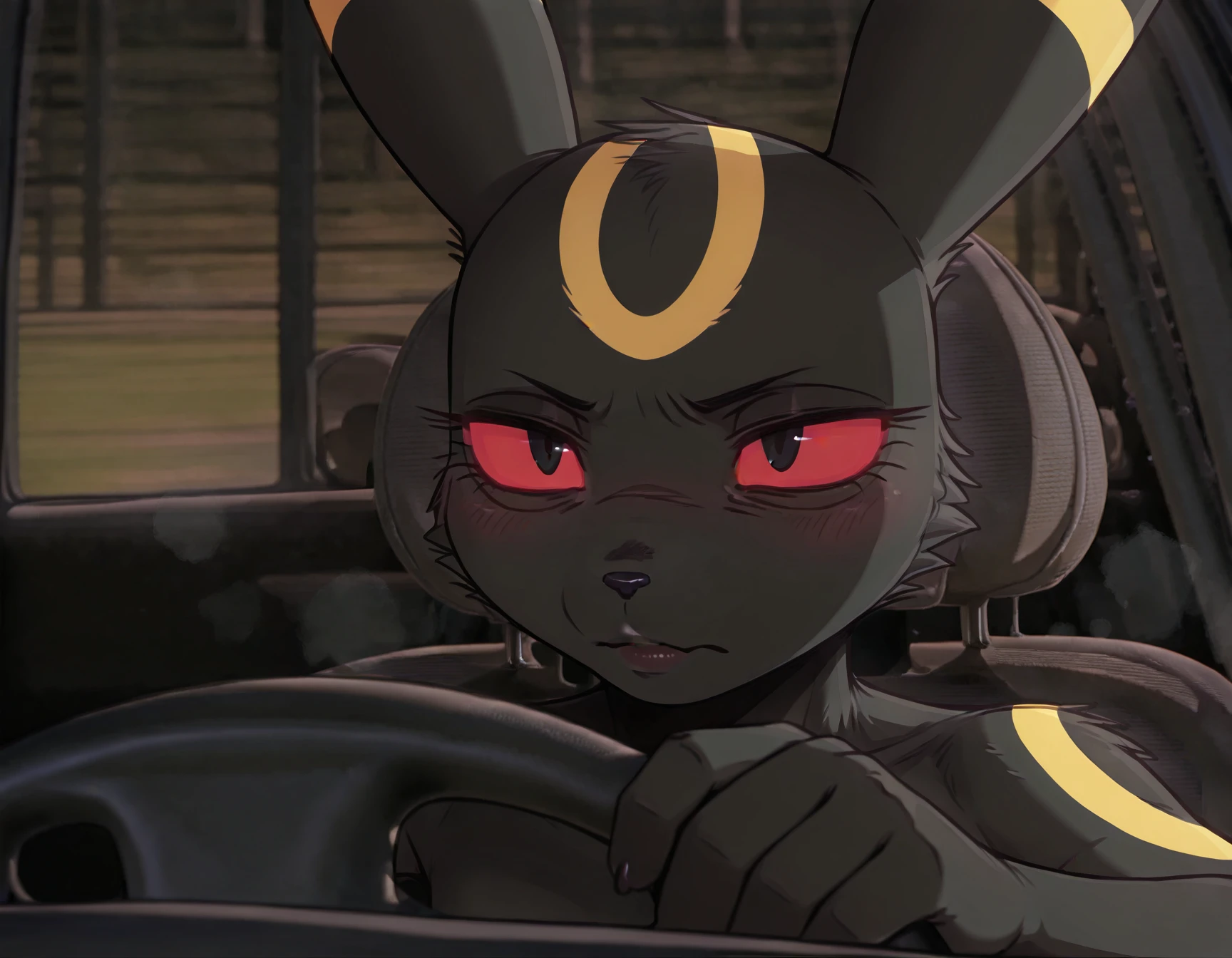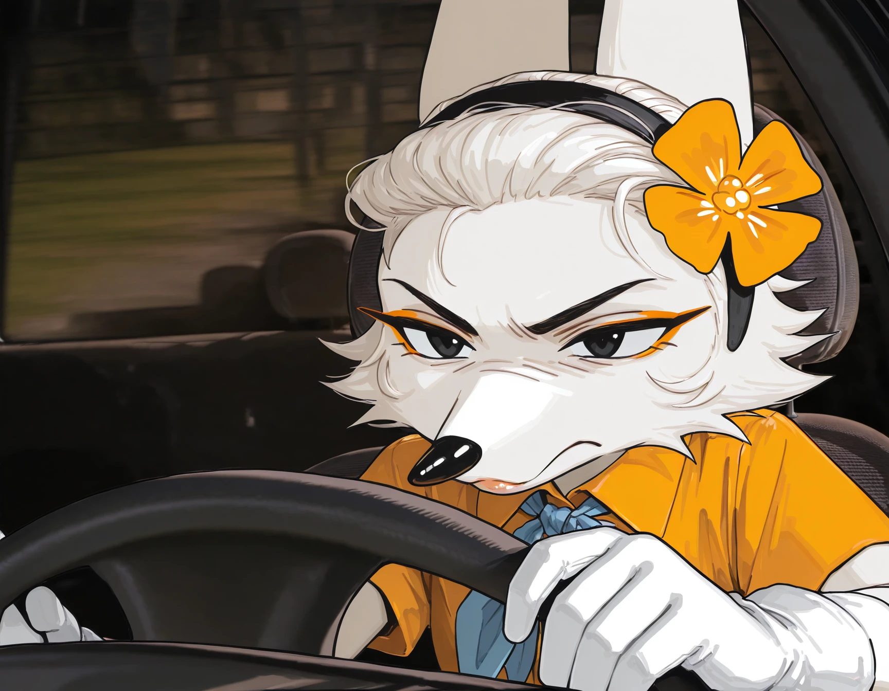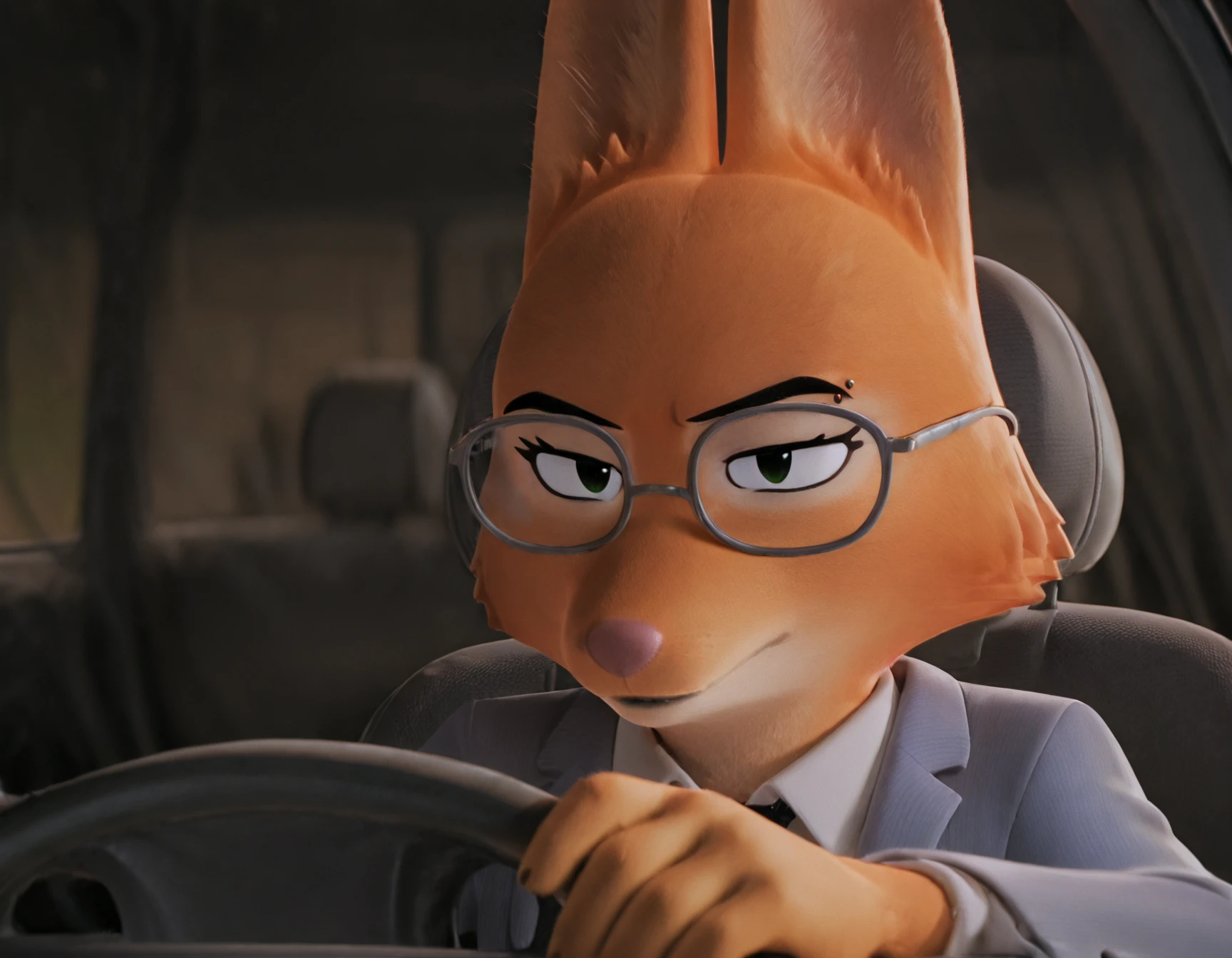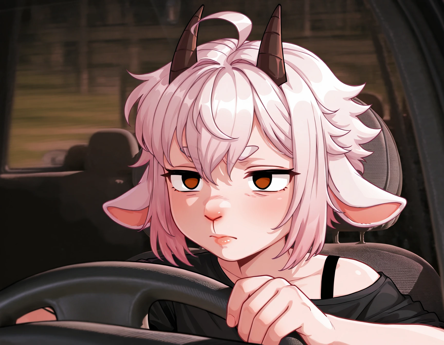 CntPr0v31t, serious expression, focused face, in car, hand on steering wheel, looking forward, concentrated look, closed mouth, suspicious look