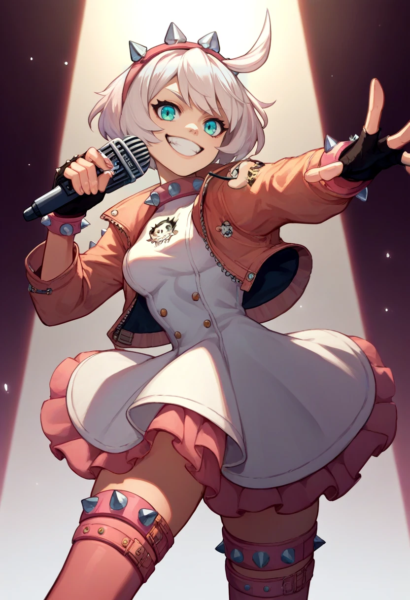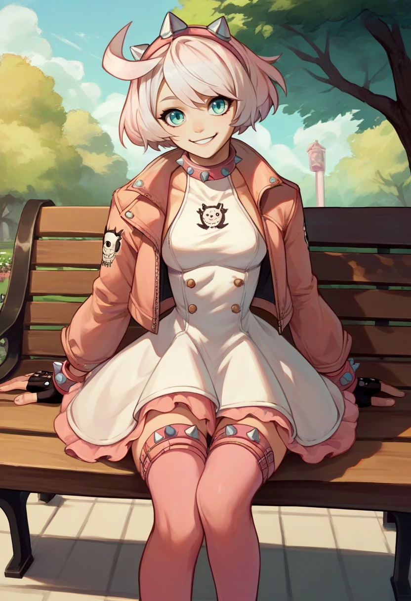 Default Outfit: jacket, dress, fingerless gloves, pink thighhighs, spiked collar, spiked bracelet