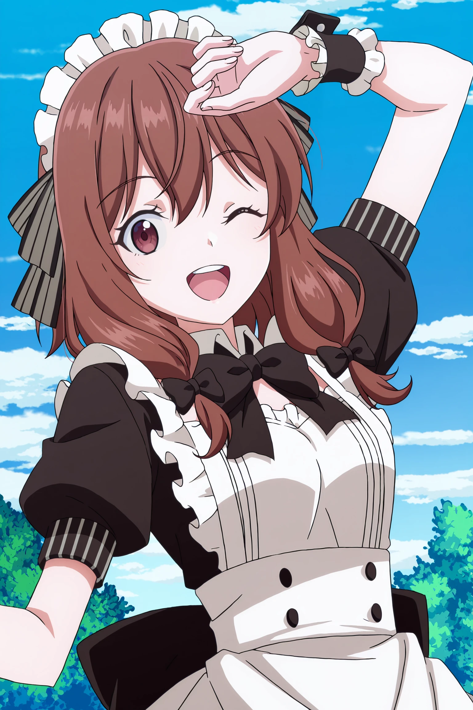 puffy sleeves,wrist cuffs,back bow,maid headdress,choker,maid apron,puffy short sleeves,black bow,waist apron,white apron,frills,hair bow,black dress,---------------------->