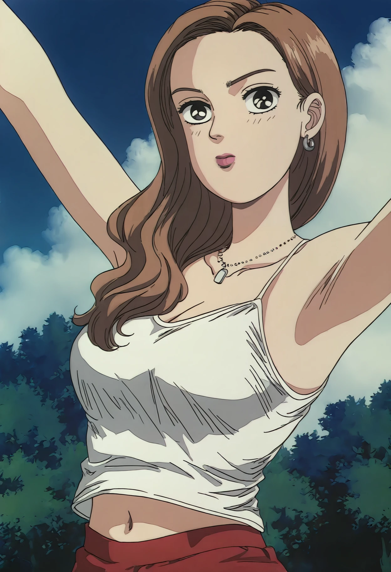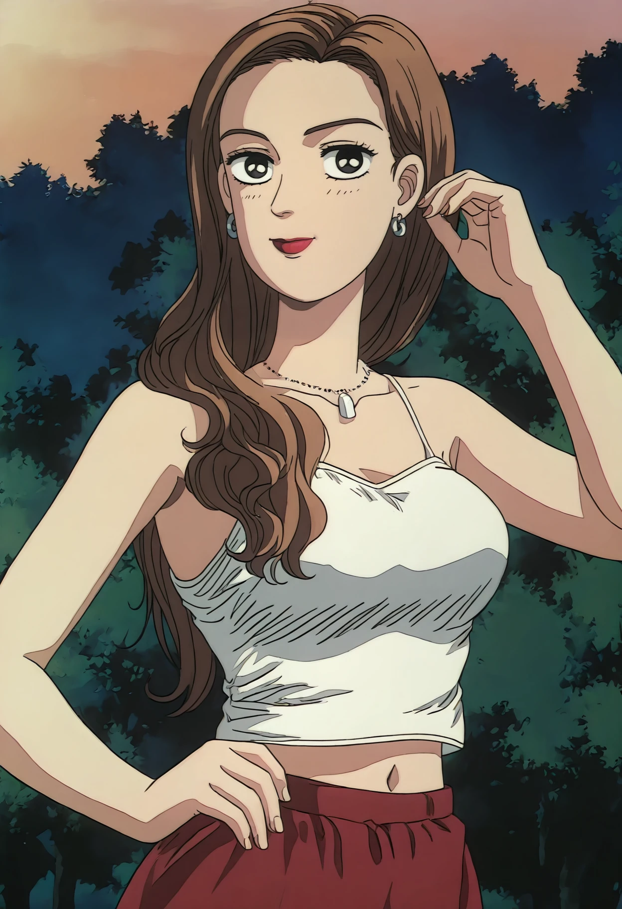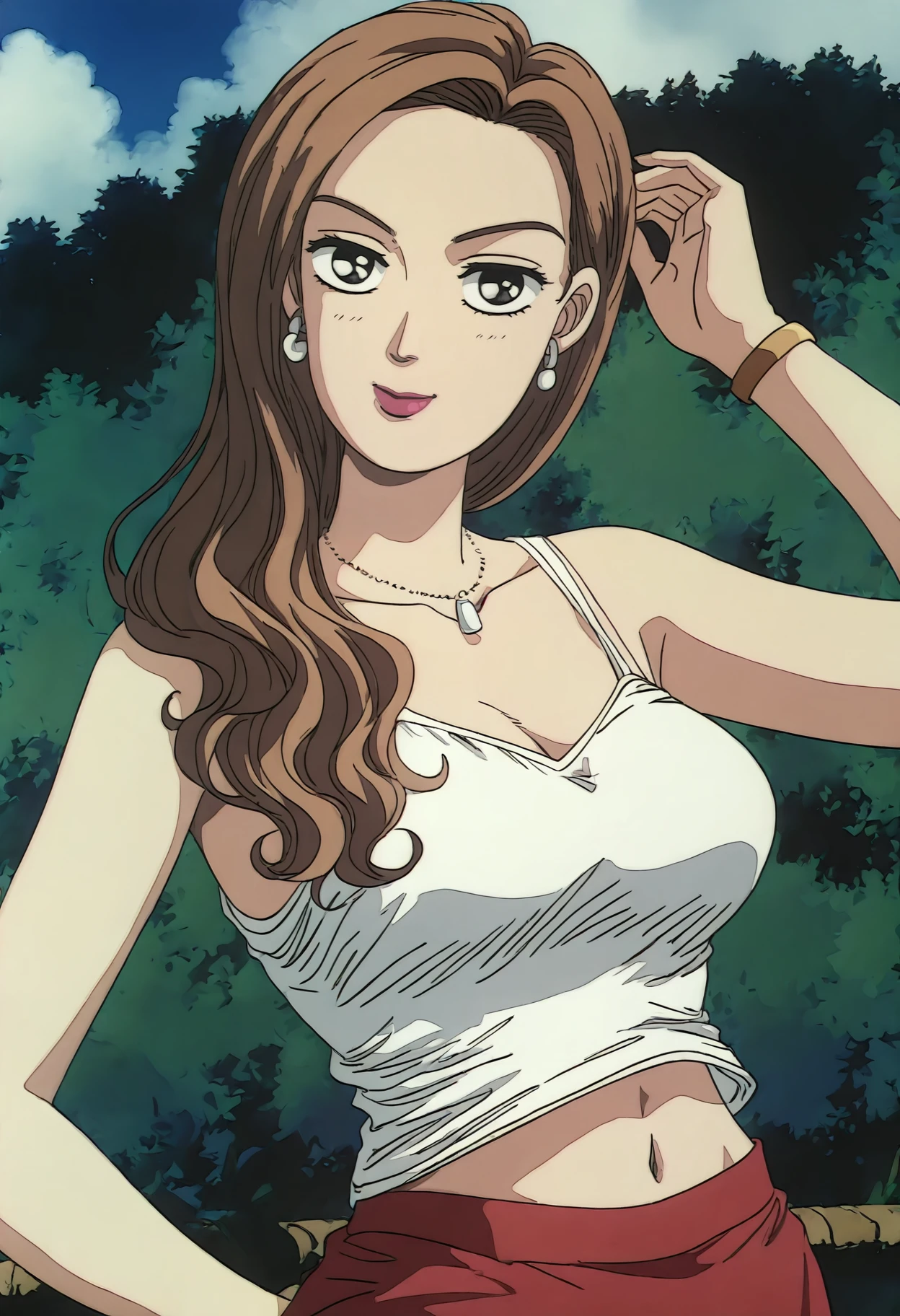1girl,solo,Sayuki,brown hair,long hair,black eyes,necklace,jewelry,earrings,tank top,navel,red skirt,