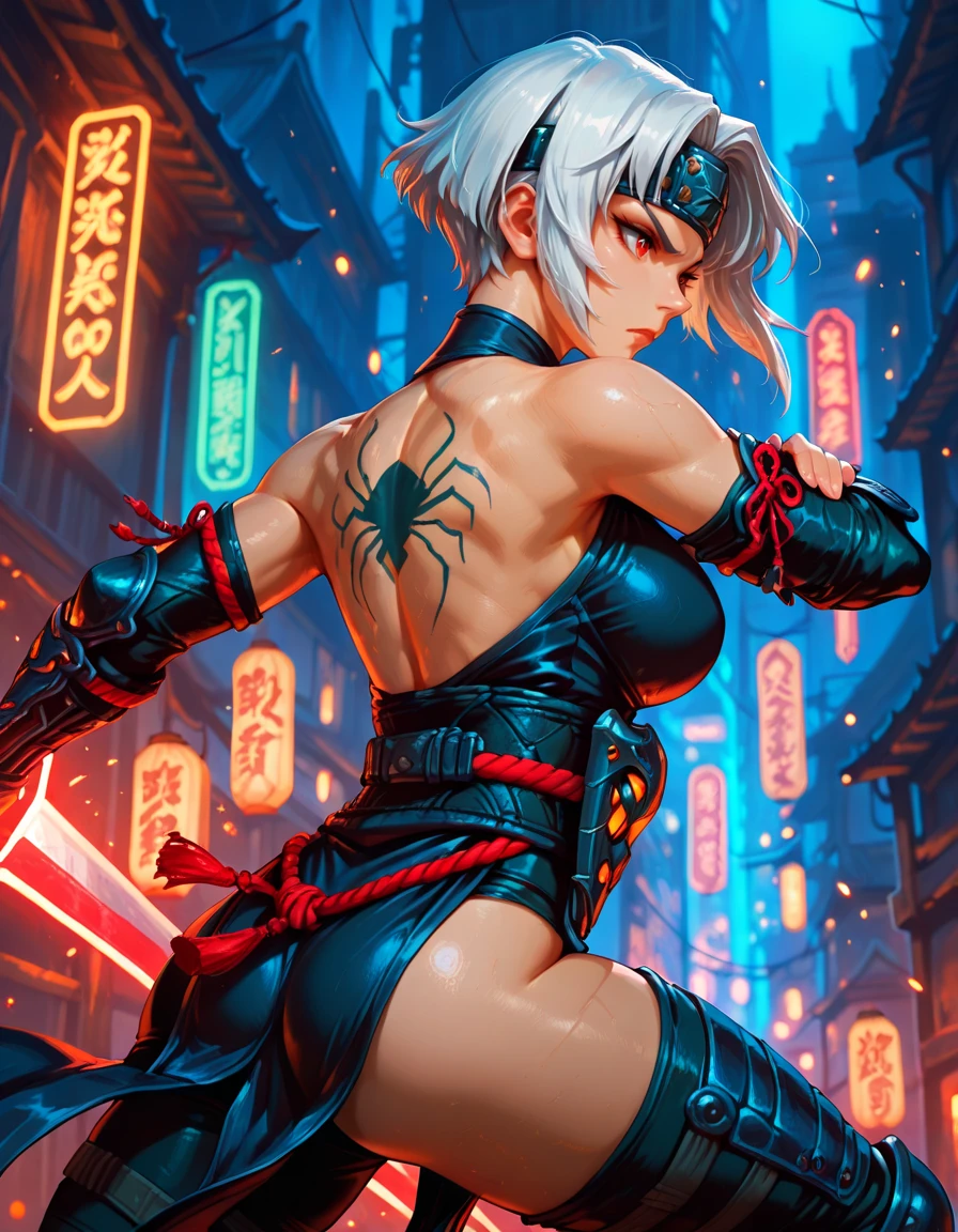 forehead protector, armor, ninja, pelvic curtain, fingerless gloves, bracers, back tattoo, halterneck,
