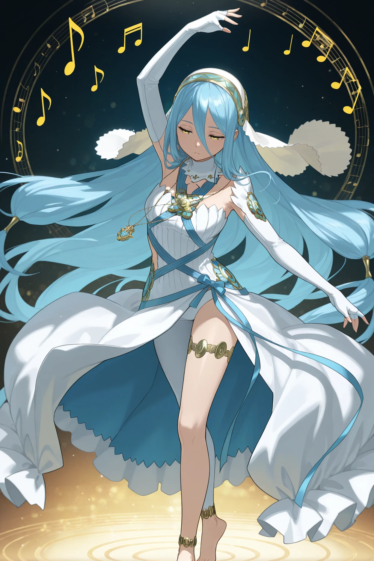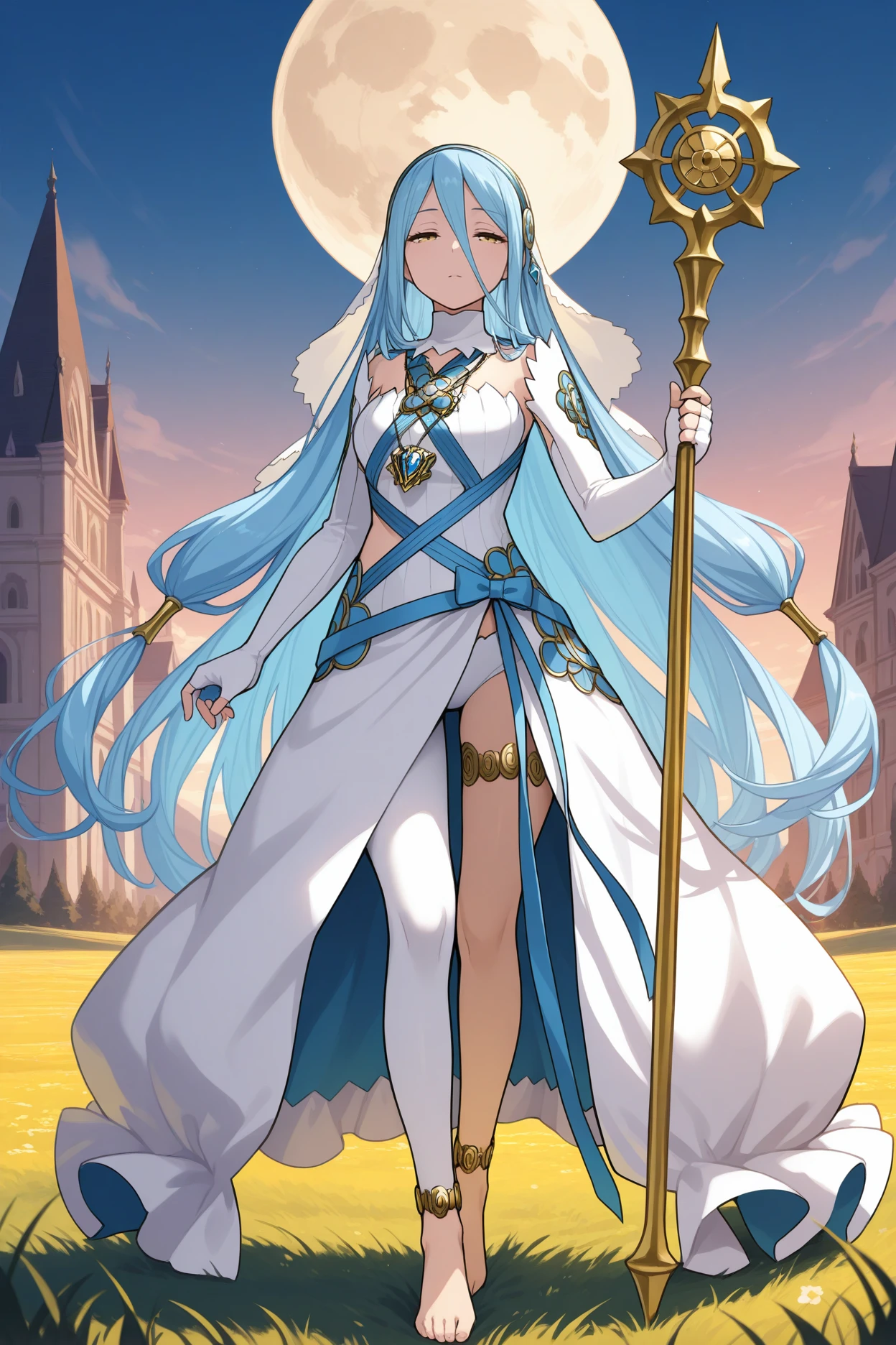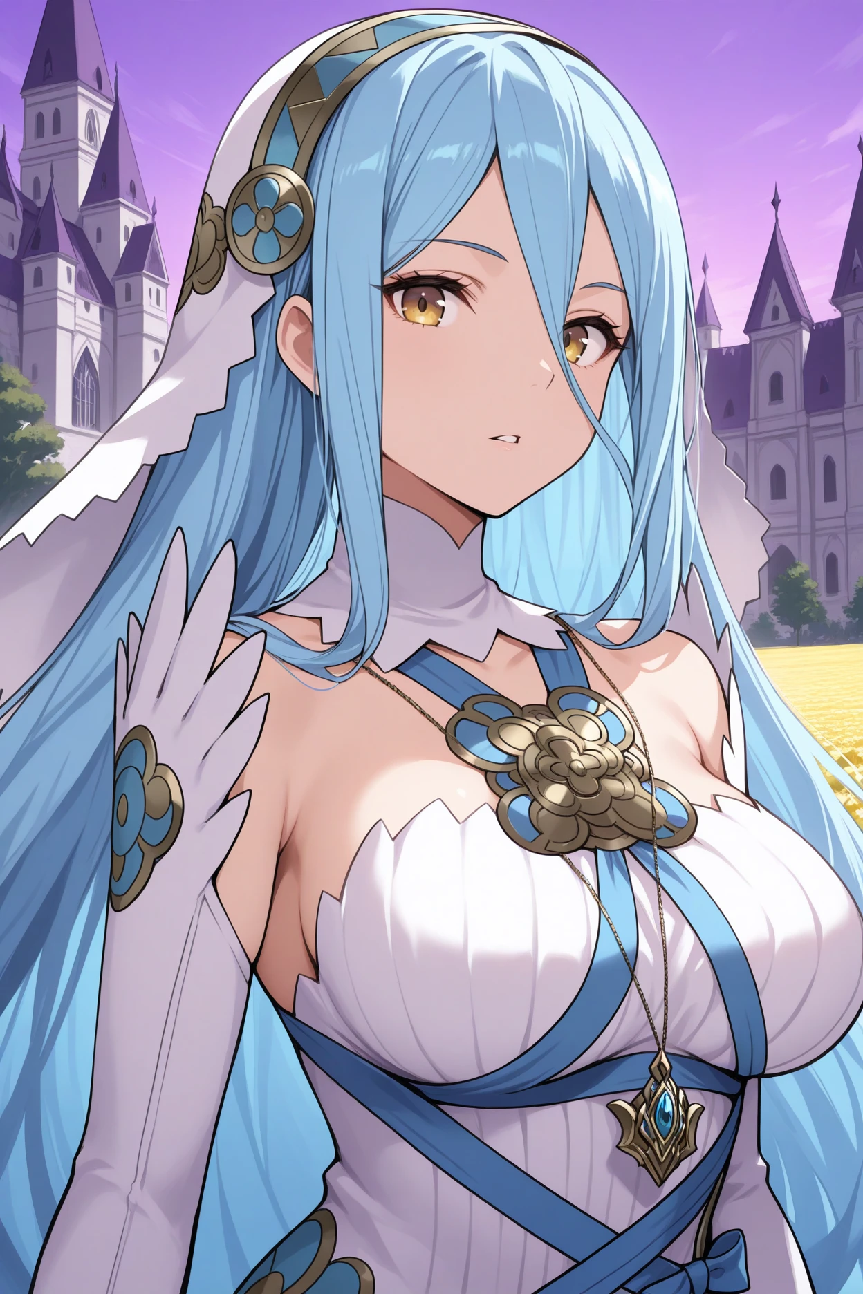 Add "base4zur, blue hair, very long hair, hair between eyes, yellow eyes, white veil, gold and blue hairband, detached collar, pendant, white dress, blue ribbon, clothing cutout, detached sleeves, long sleeves, white gloves, elbow gloves, fingerless gloves, single leg pantyhose, white pantyhose, thighlet, anklet, barefoot" for her standard appearance.