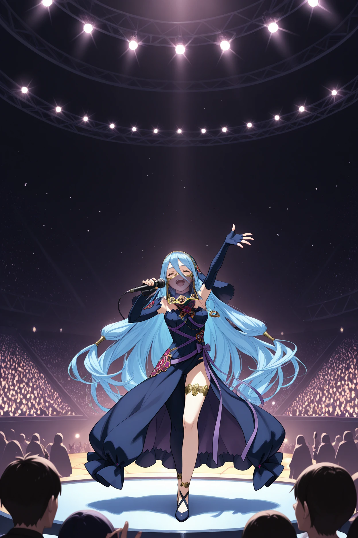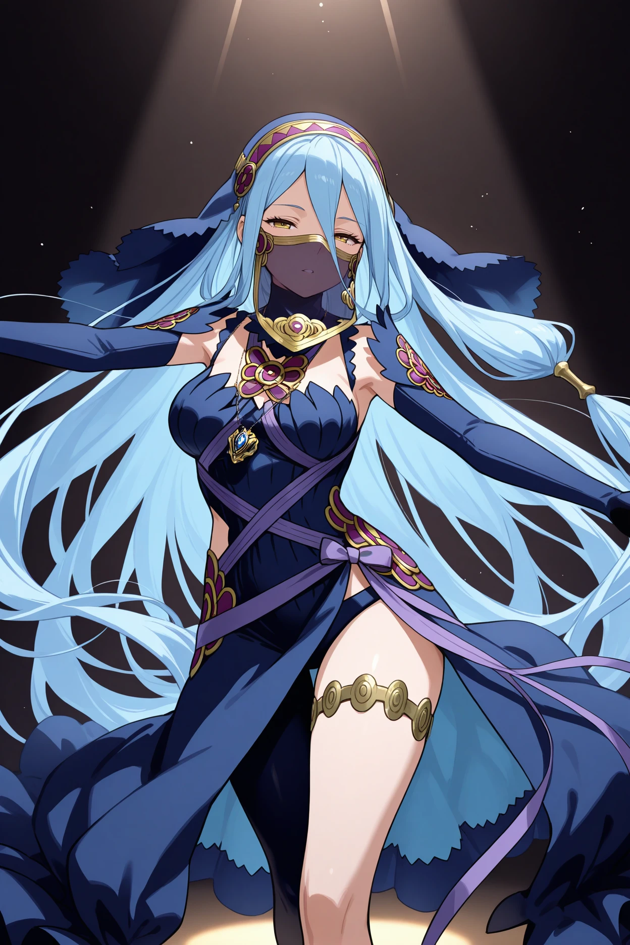 Add "pfm4zur, blue hair, very long hair, hair between eyes, yellow eyes, dark blue veil, mouth veil, see-through, pendant, dark blue dress, purple ribbon, long sleeves, dark blue sleeves, detached sleeves, elbow gloves, fingerless gloves, thighlet, single leg pantyhose, black pantyhose" for Performing Azura.