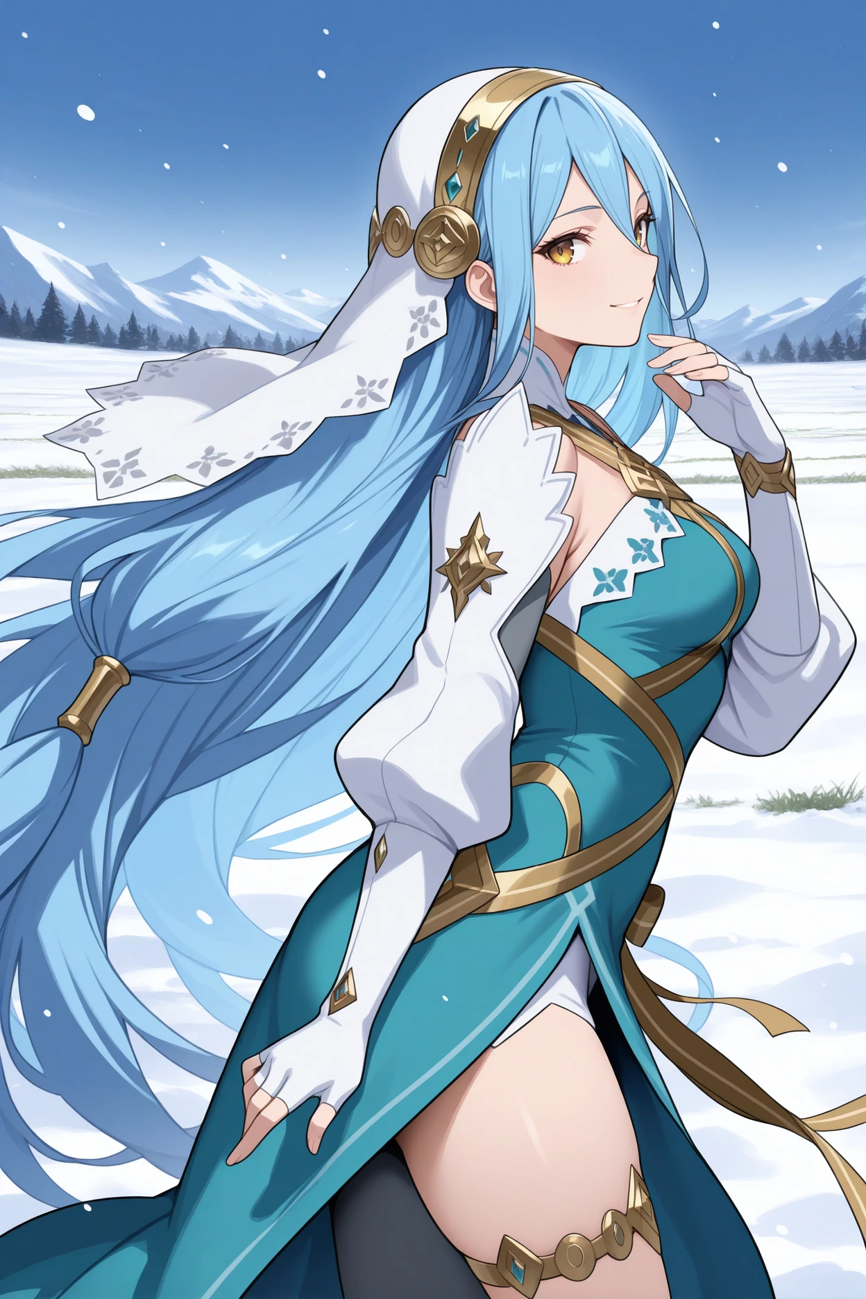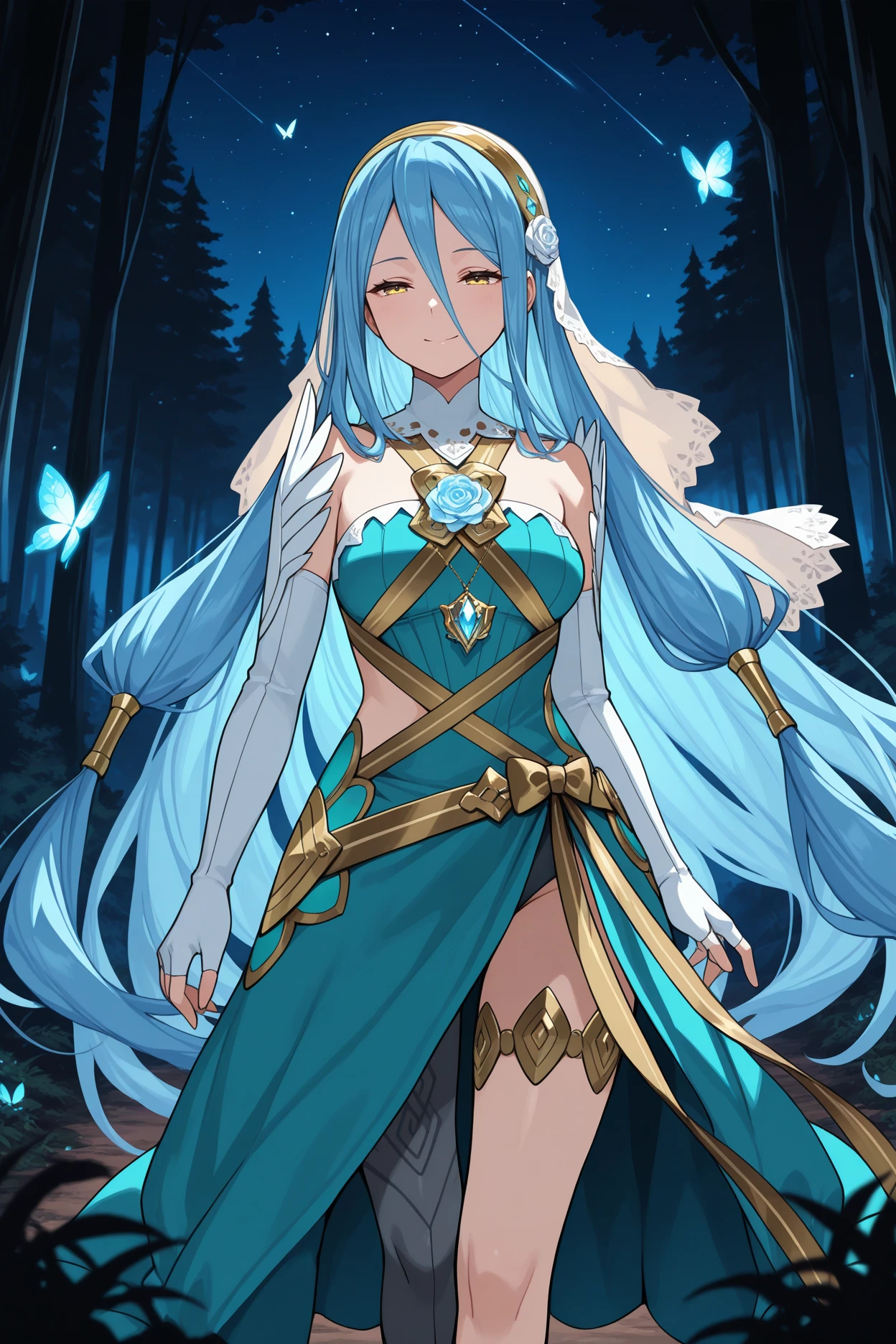 Add "aned4zur, blue hair, very long hair, hair between eyes, yellow eyes, white veil, black hairband, headdress, white shirt, gold brooch, black juliet sleeves, long sleeves, black gloves, fingerless gloves, blue sash, blue showgirl skirt, single thighhigh, white thighhigh, gold thigh strap" for Attuned Azura.