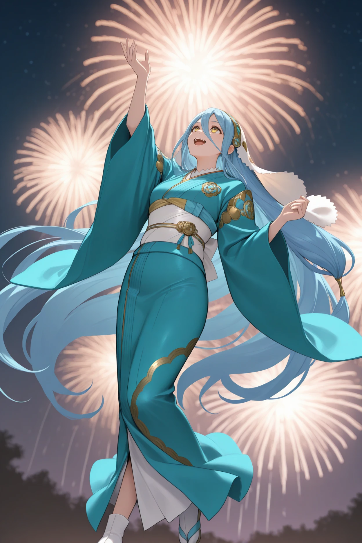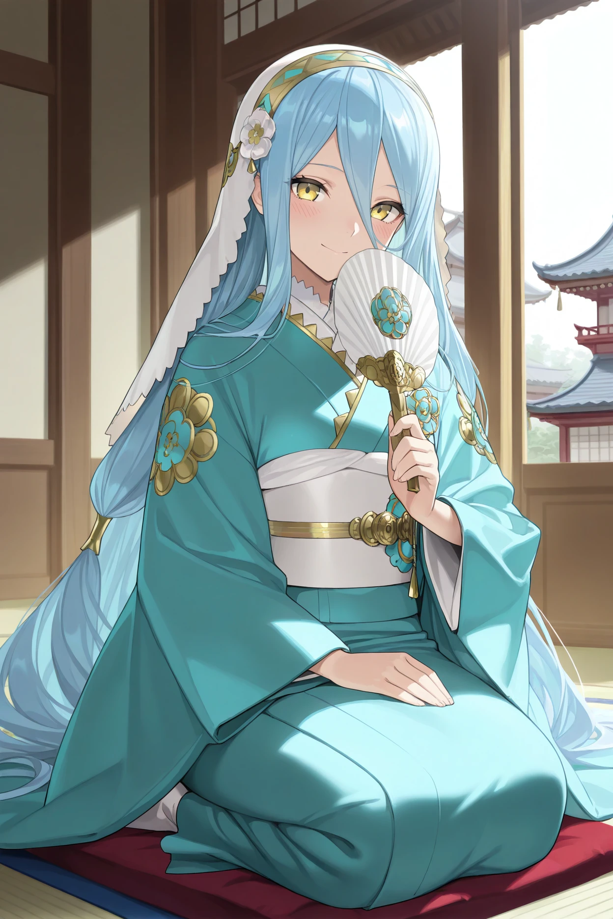 Add "nyr4zur, blue hair, very long hair, hair between eyes, yellow eyes, white veil, gold and blue hairband, aqua kimono, white sash, wide sleeves, tabi" for New Year Azura.