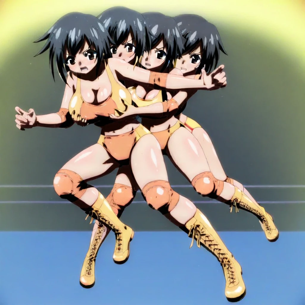 makiko_(sora_no_otoshimono), 1girl, short_hair, black_eyes, black_hair, midriff, large_, cleavage, navel, knee_pads, sports_bra, , elbow_pads, cross-laced_footwear, buruma, boots, wrestling_outfit