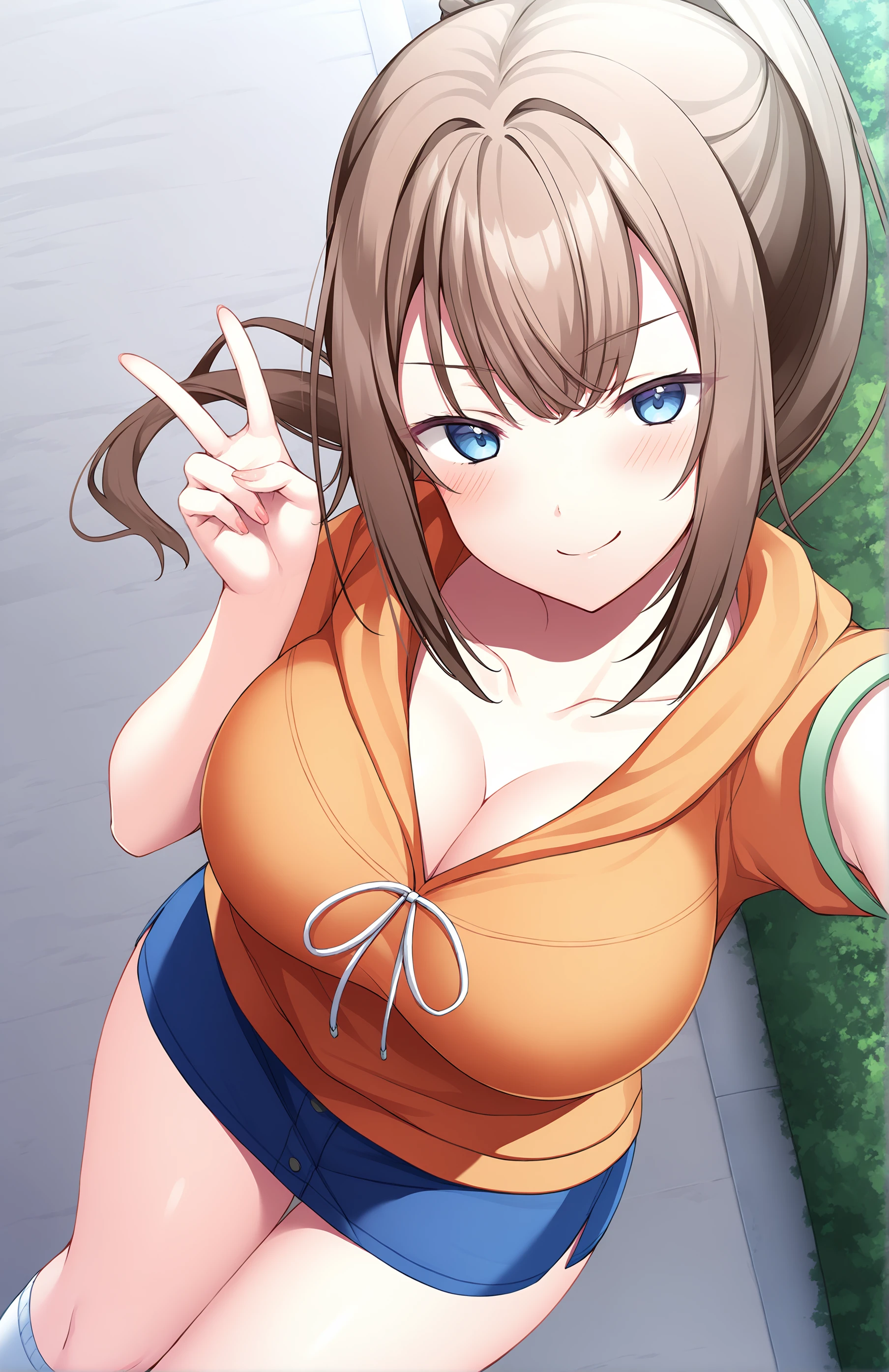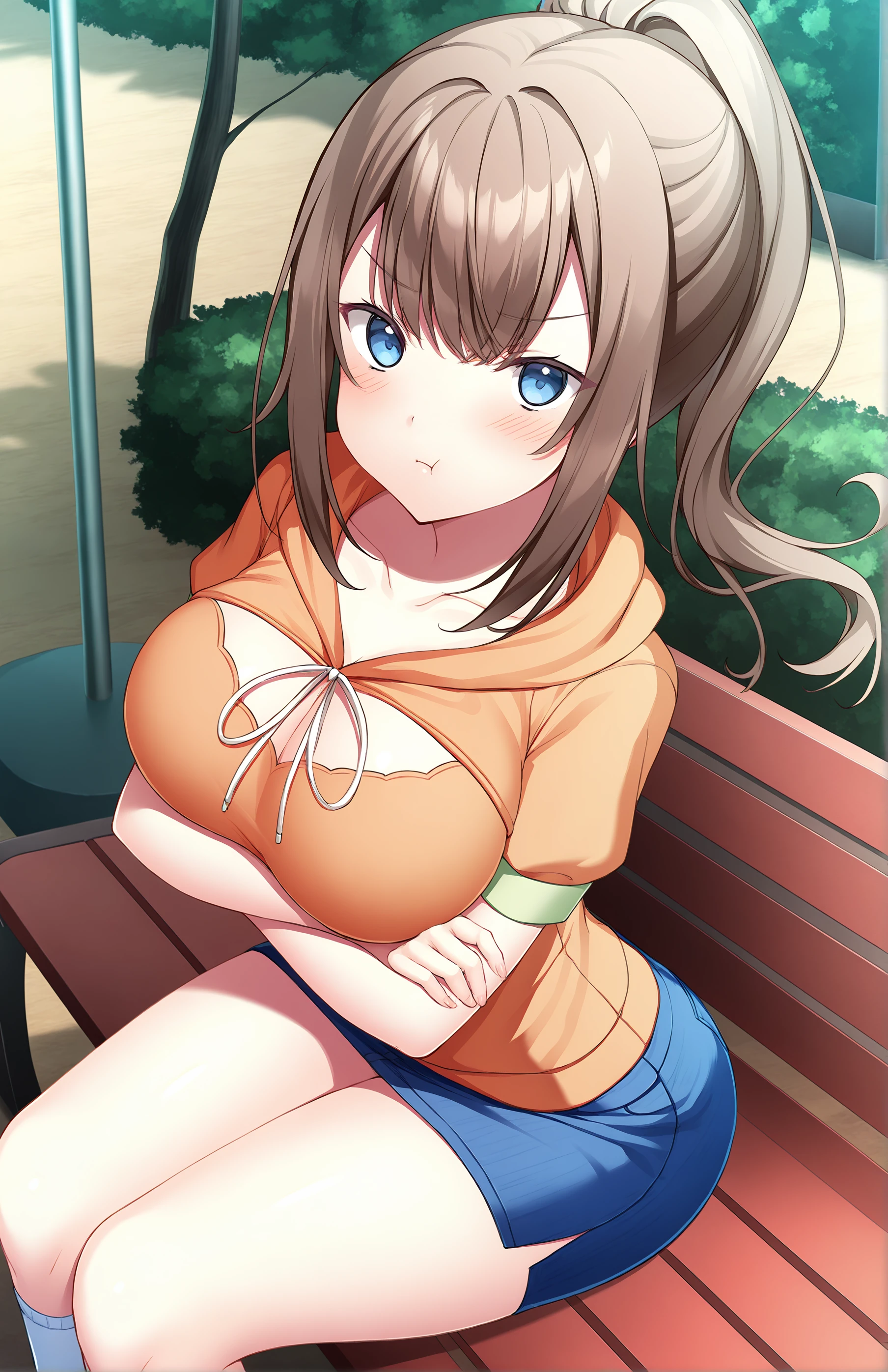 HomanYui, long hair, breasts, bangs, blue eyes, skirt, large breasts, brown hair, cleavage, collarbone, ponytail, short sleeves, sidelocks, socks, hood, miniskirt, blue skirt, kneehighs, orange hoodie, denim, white socks, denim skirt