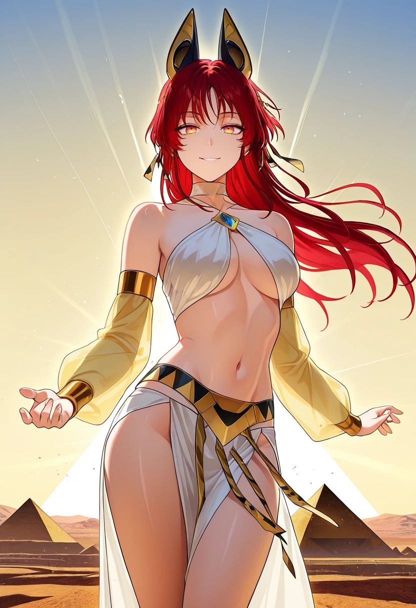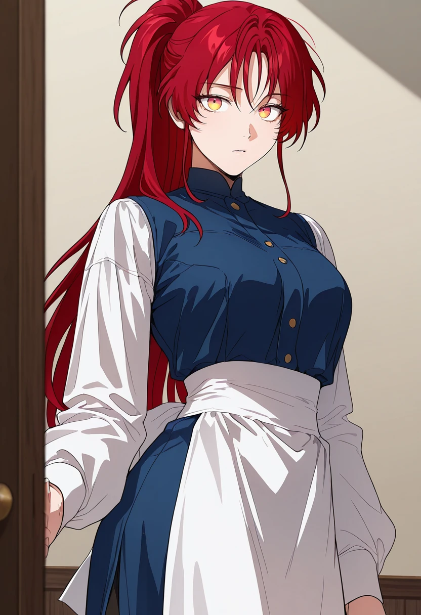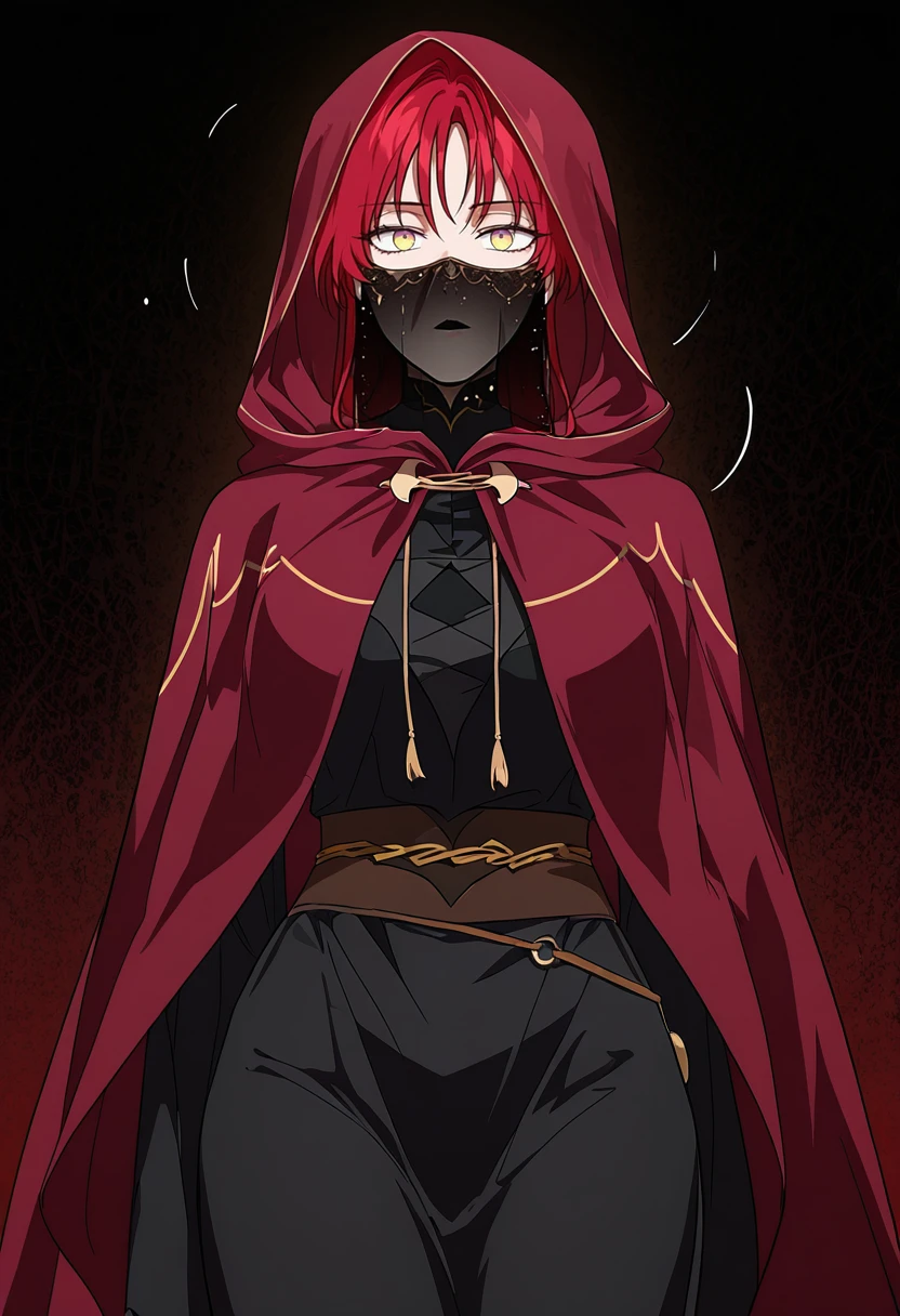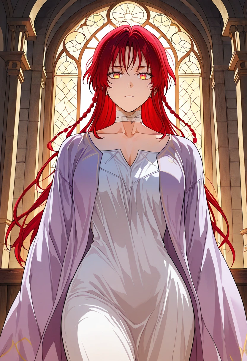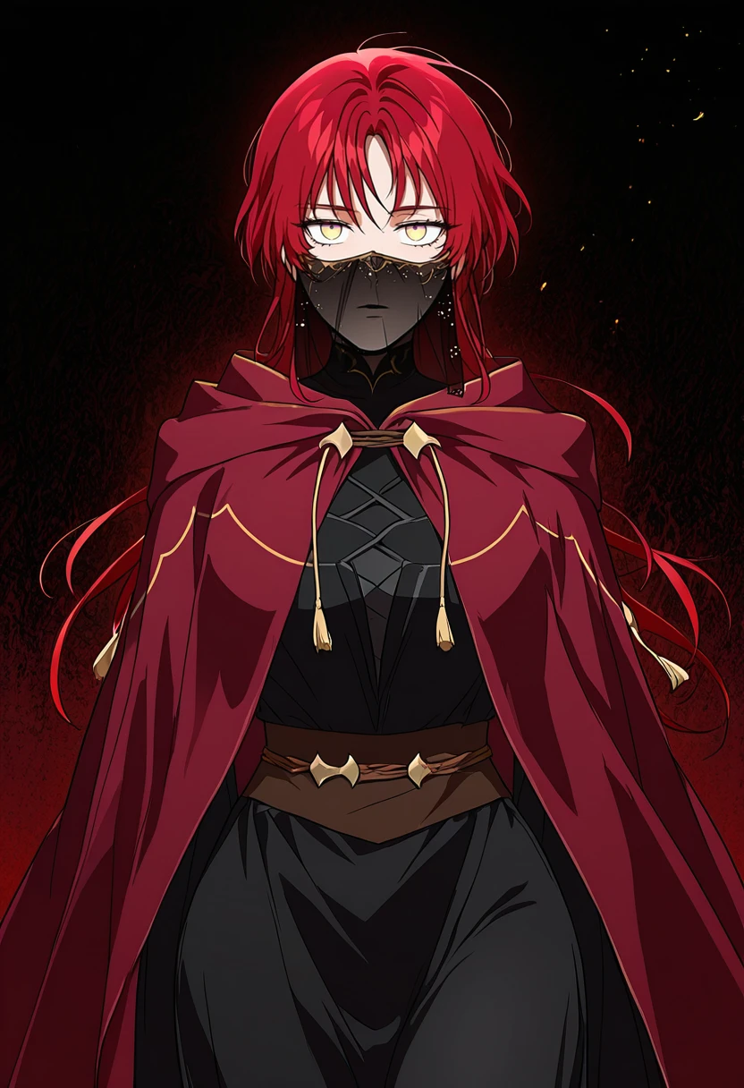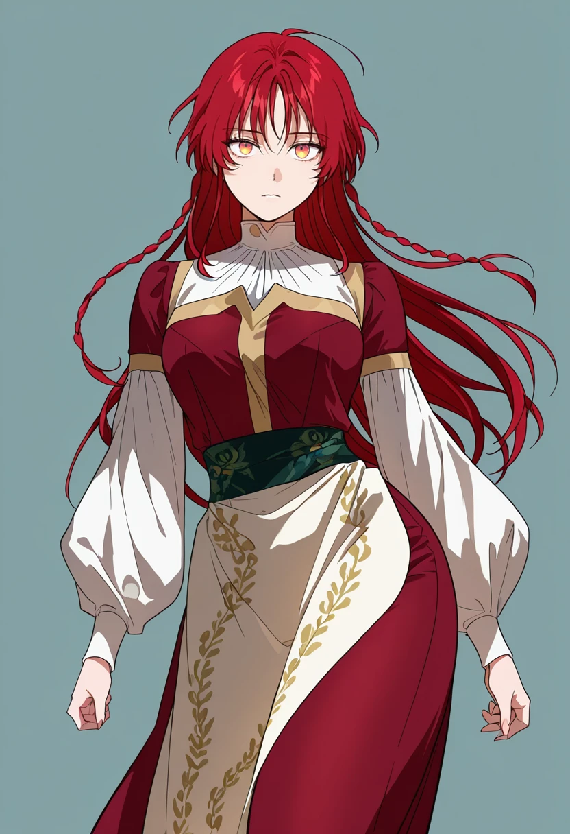 HildegardAelius, red hair, red eyes, yellow eyes, gradient eyes, bangs, long hair,