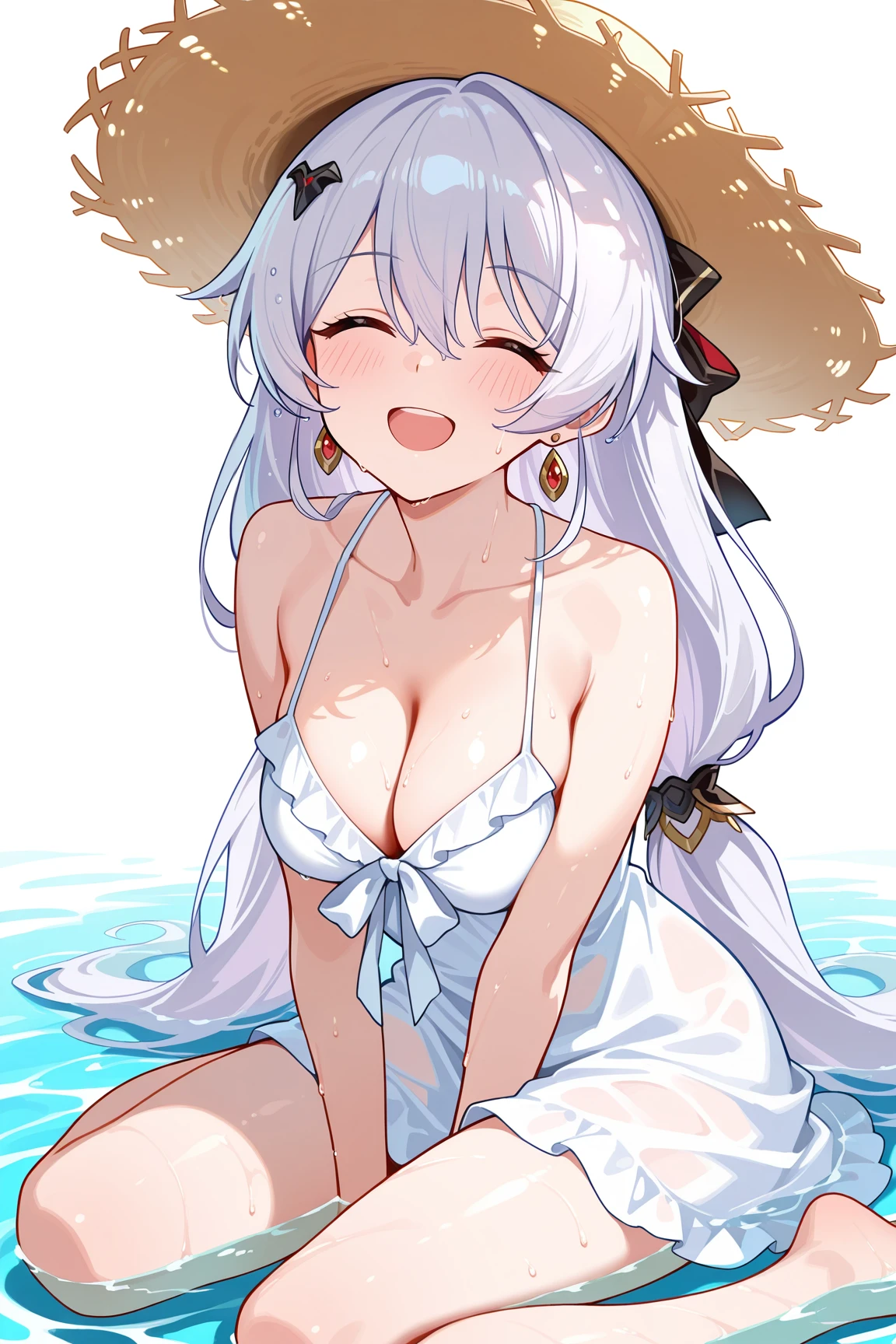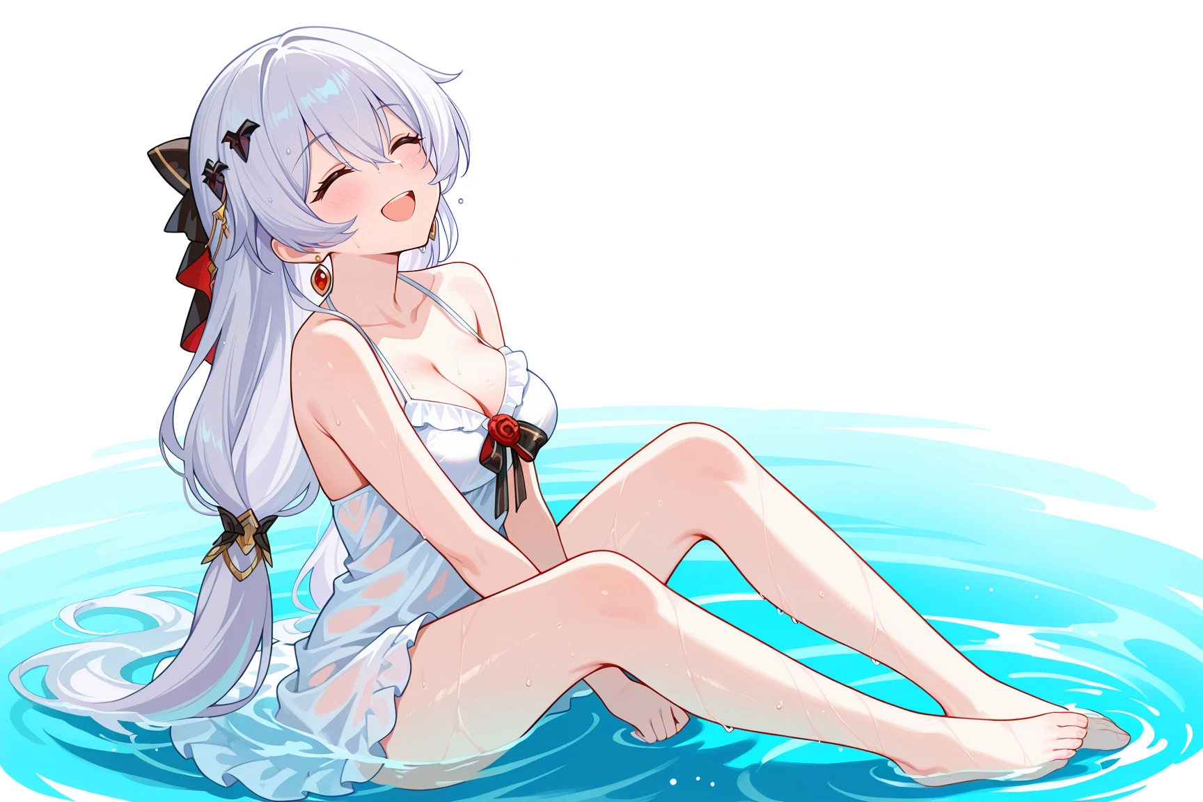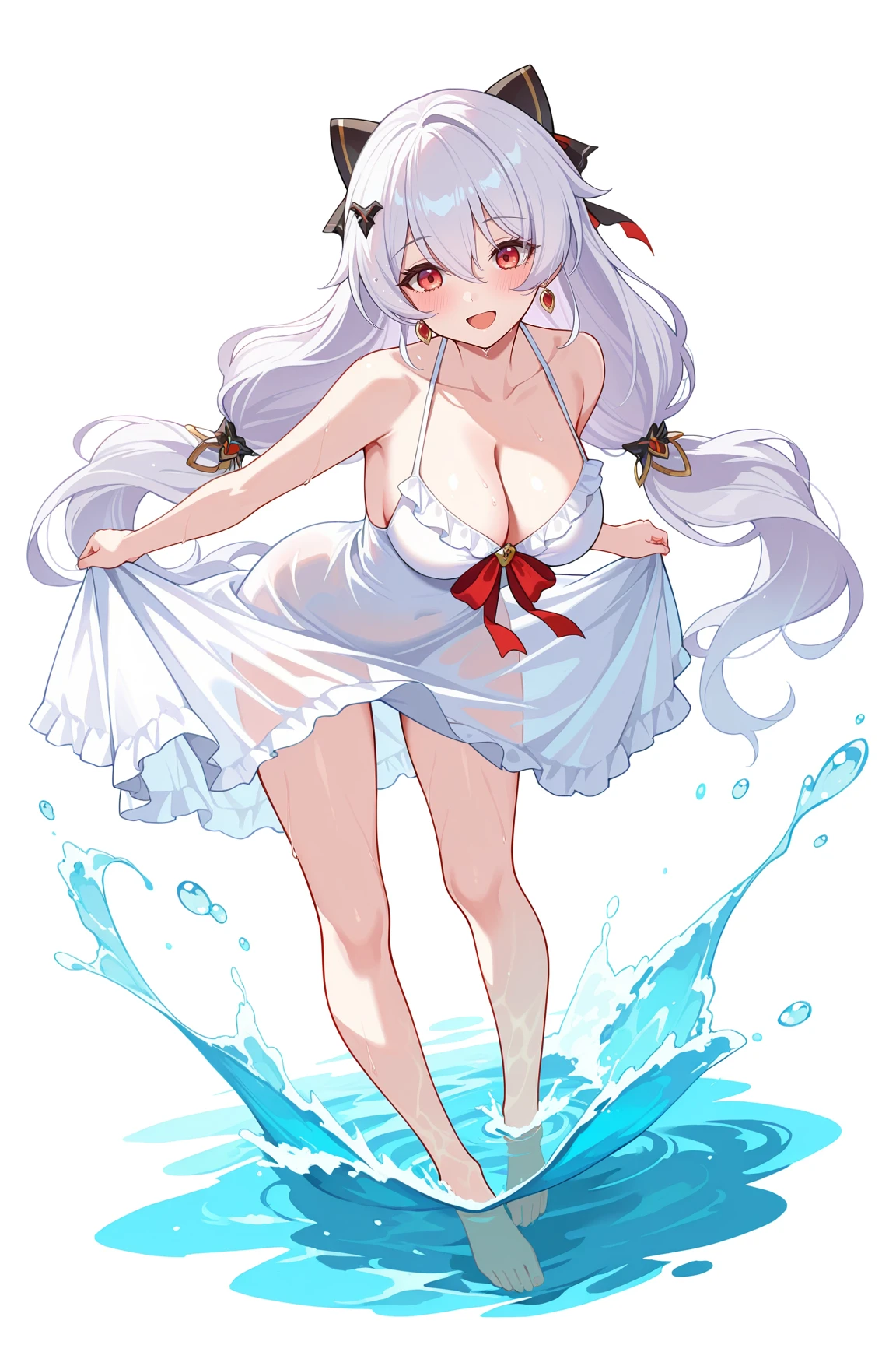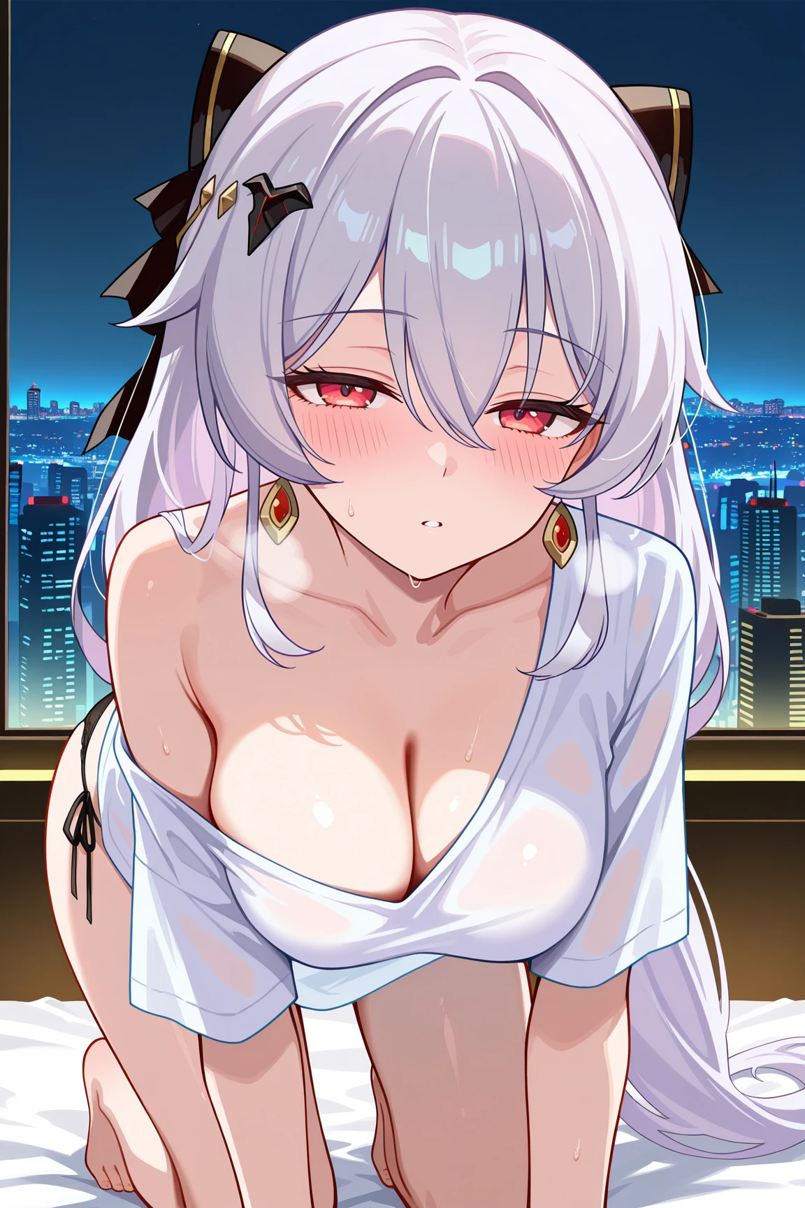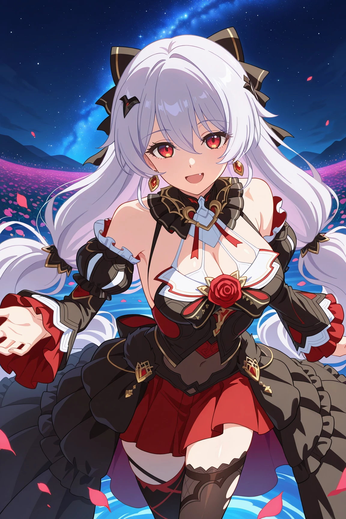 LunaTheresa, red eyes, white hair, long hair, hair ornament, hair between eyes, earrings, hair_bow,