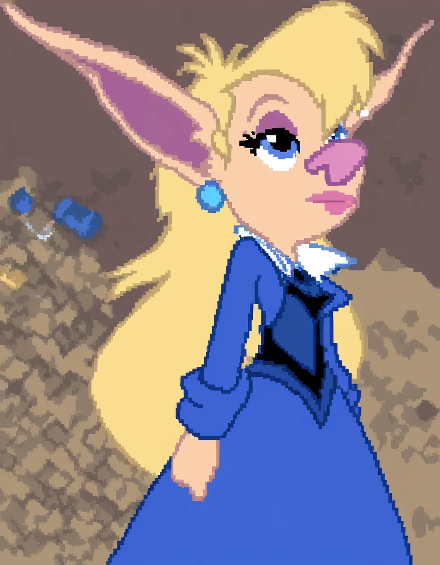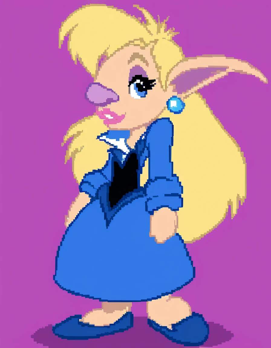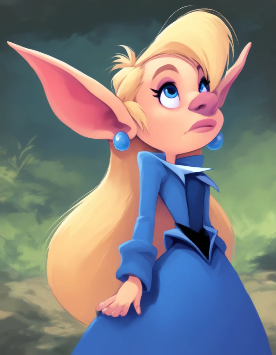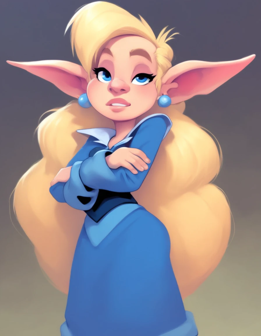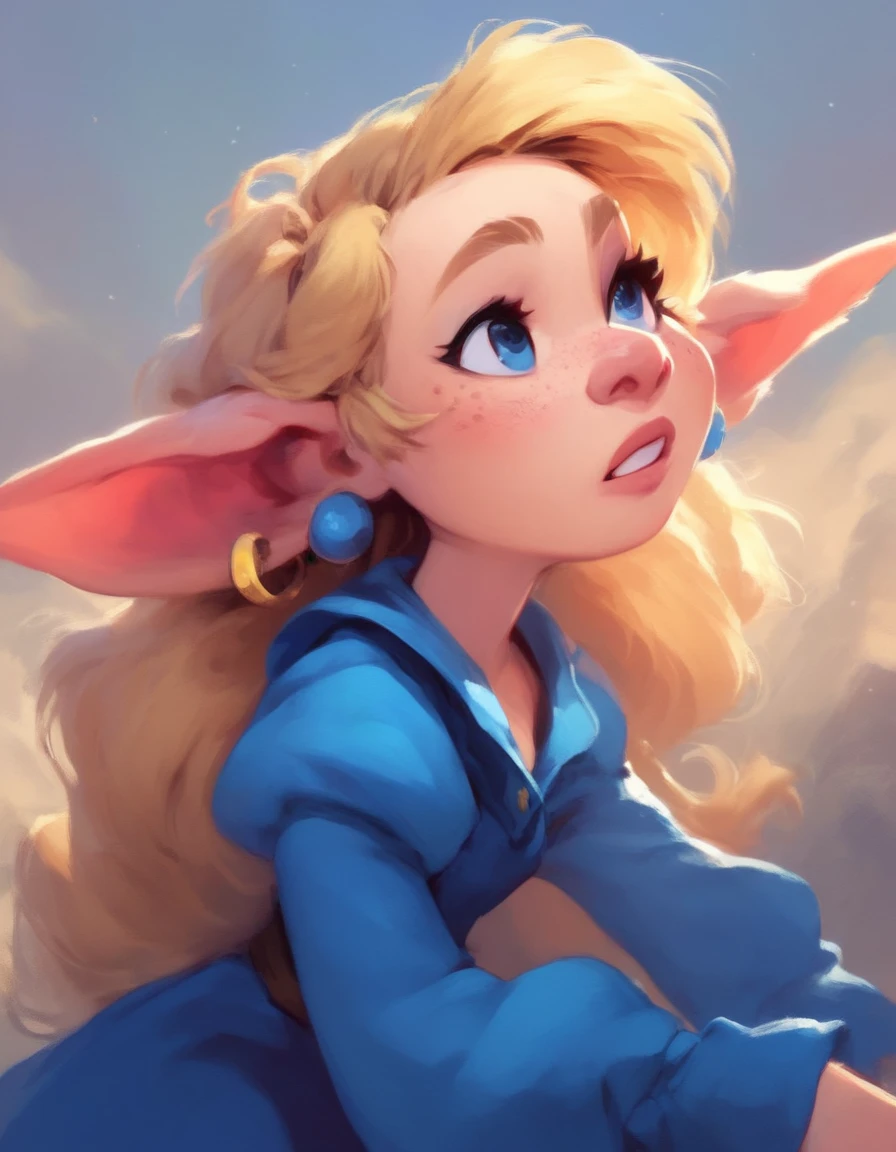 RosellaTroll, female, troll, short, big ears, freckles, long hair, blonde hair, blue eyes, jewelry, earrings, long sleeves, blue dress