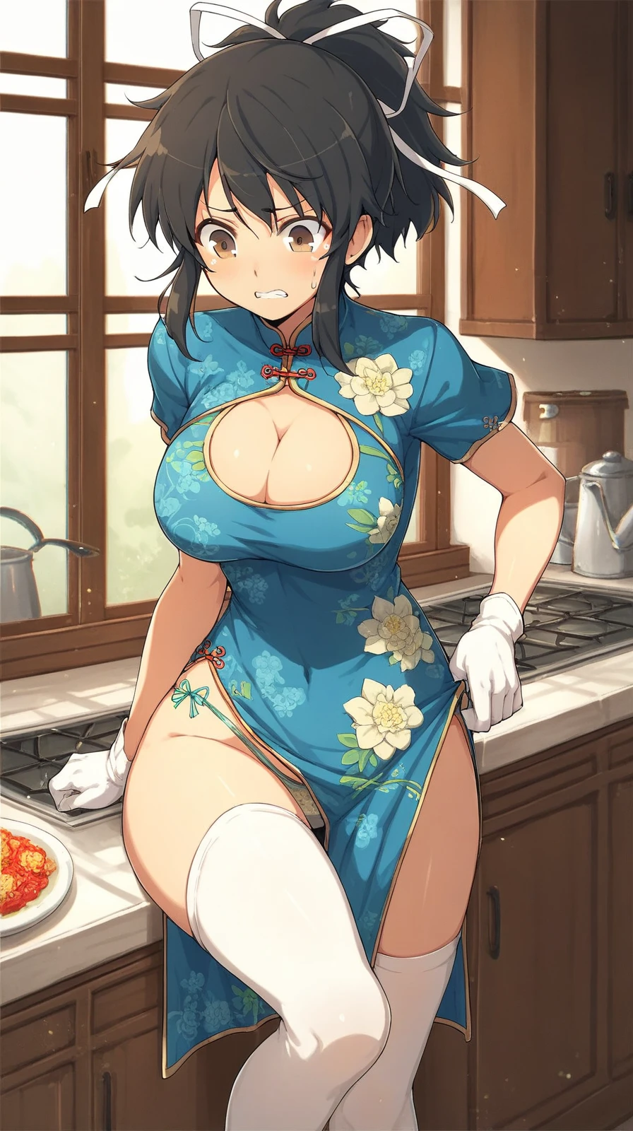asuka_81baku_1,thighhighs, dress, chinese clothes, china dress,cleavage cutout, clothing cutout, ribbon, white thighhighs, blue dress, gloves, hair ribbon,