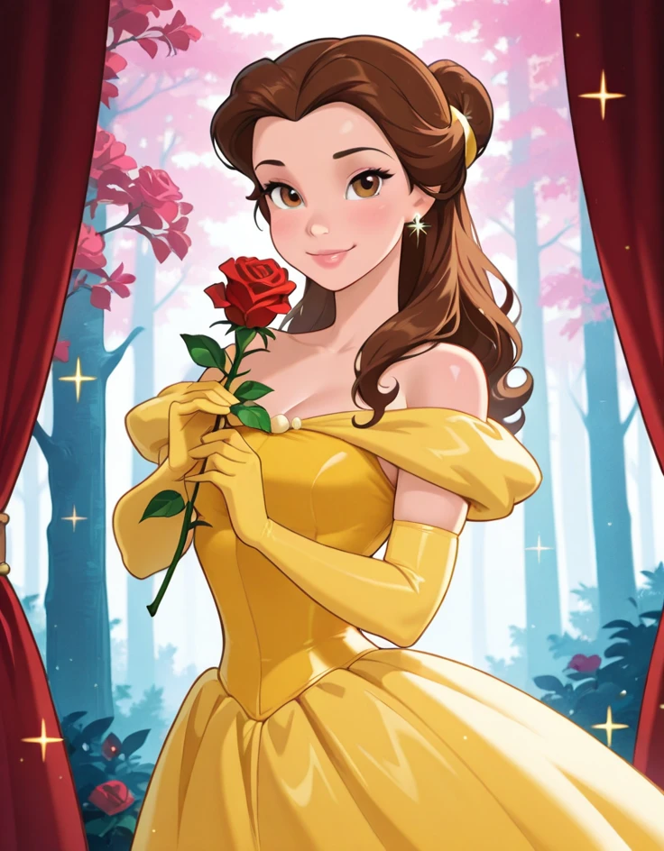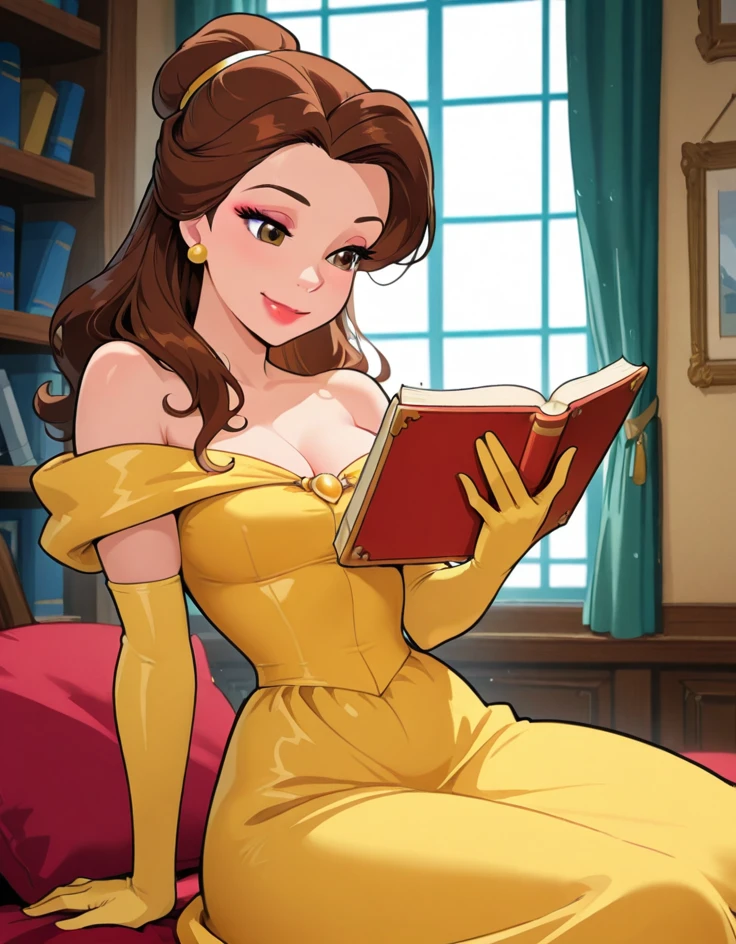 yellow dress, brown hair, long hair, earrings, elbow gloves, bare shoulders, hair bun, off-shoulder dress