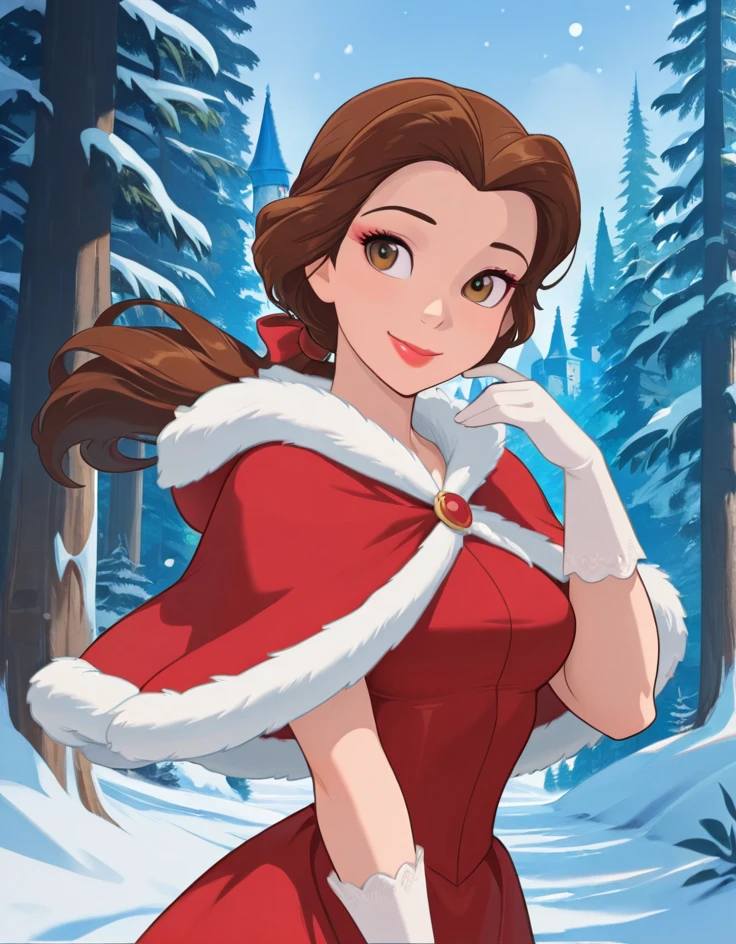 brown hair, long hair, ponytail, fur trim, gloves, red dress