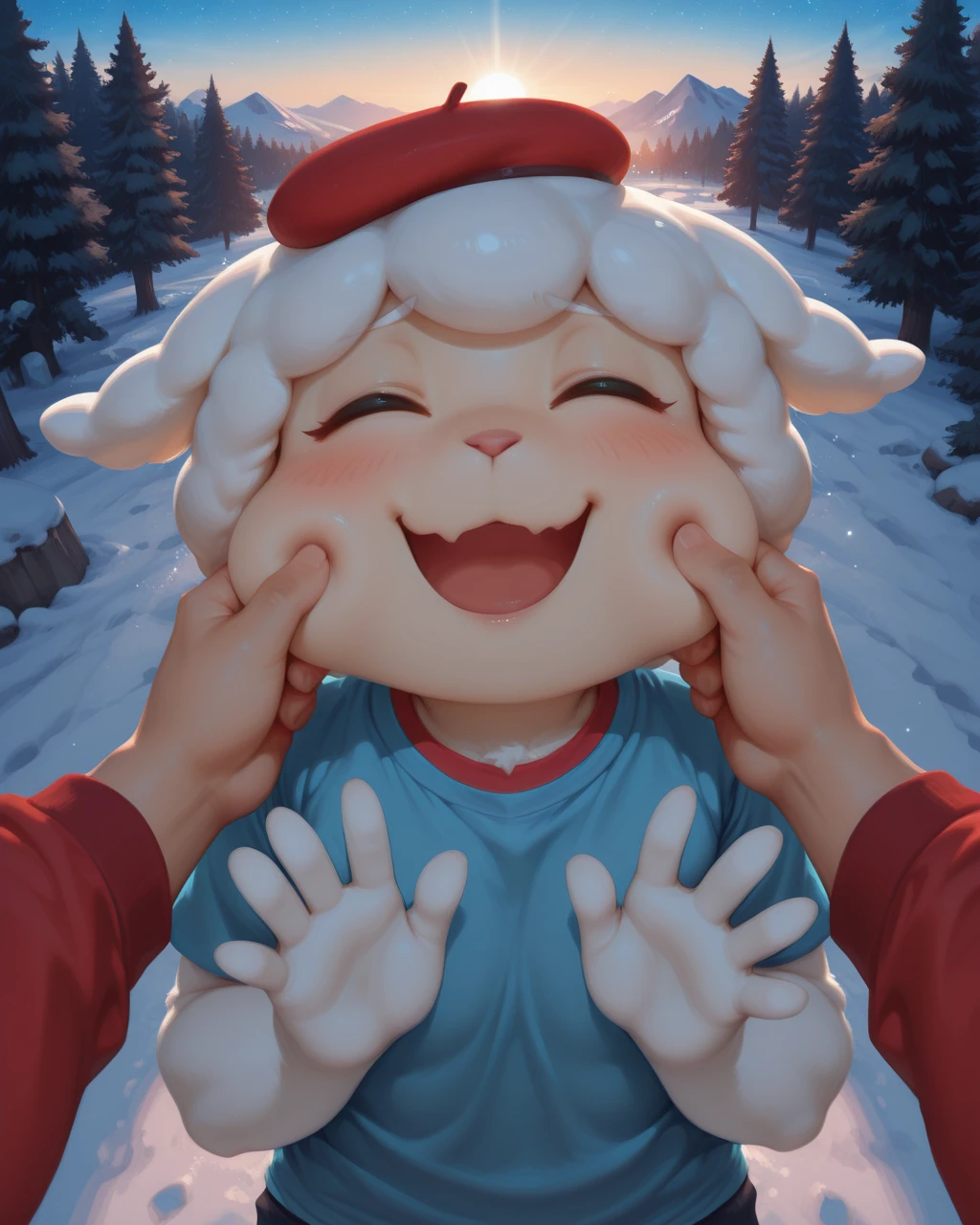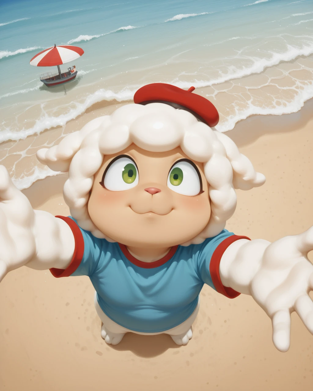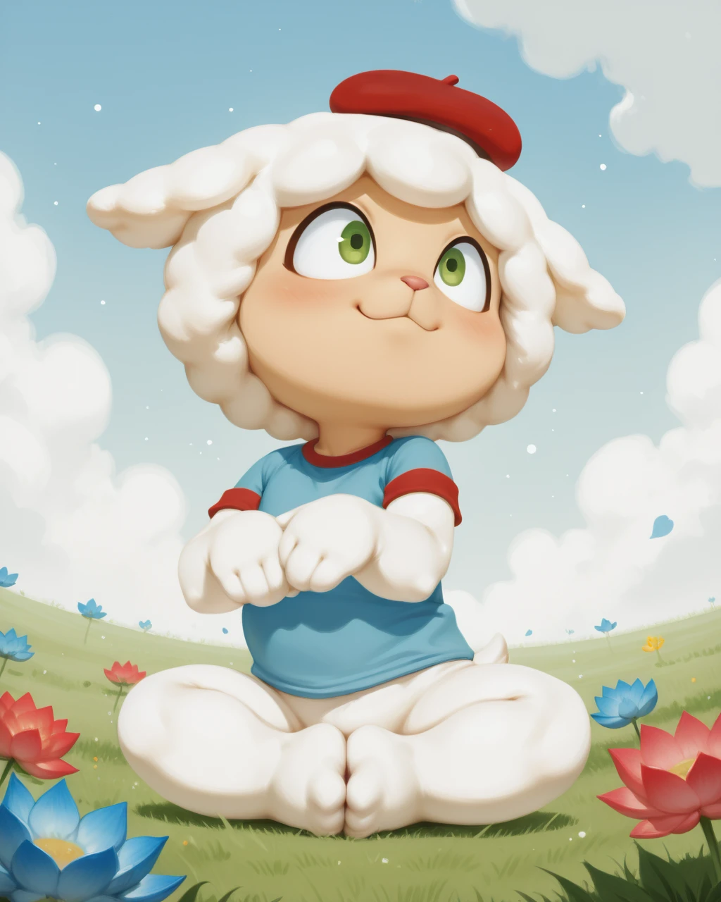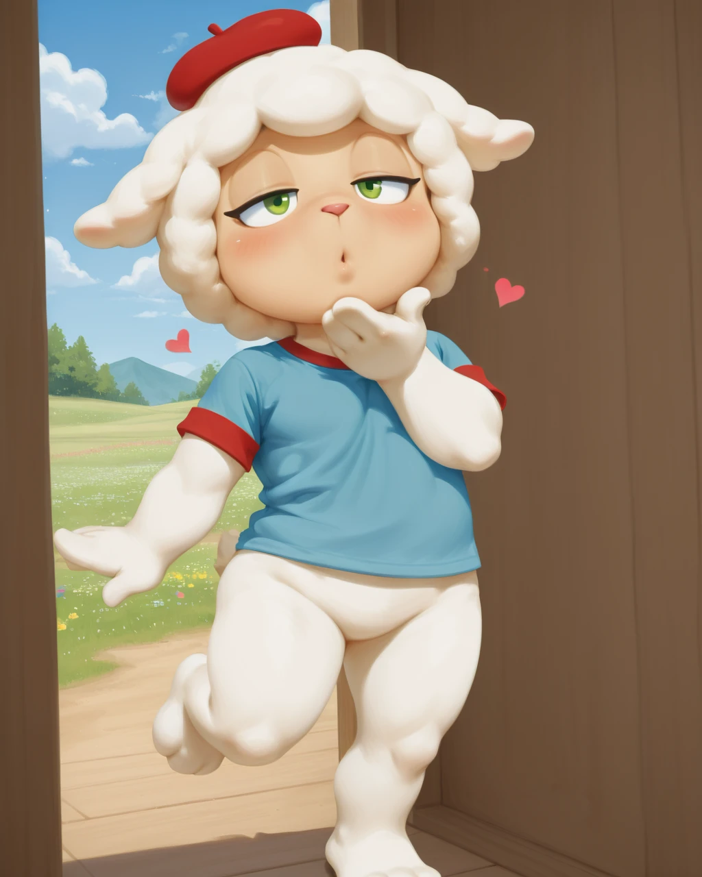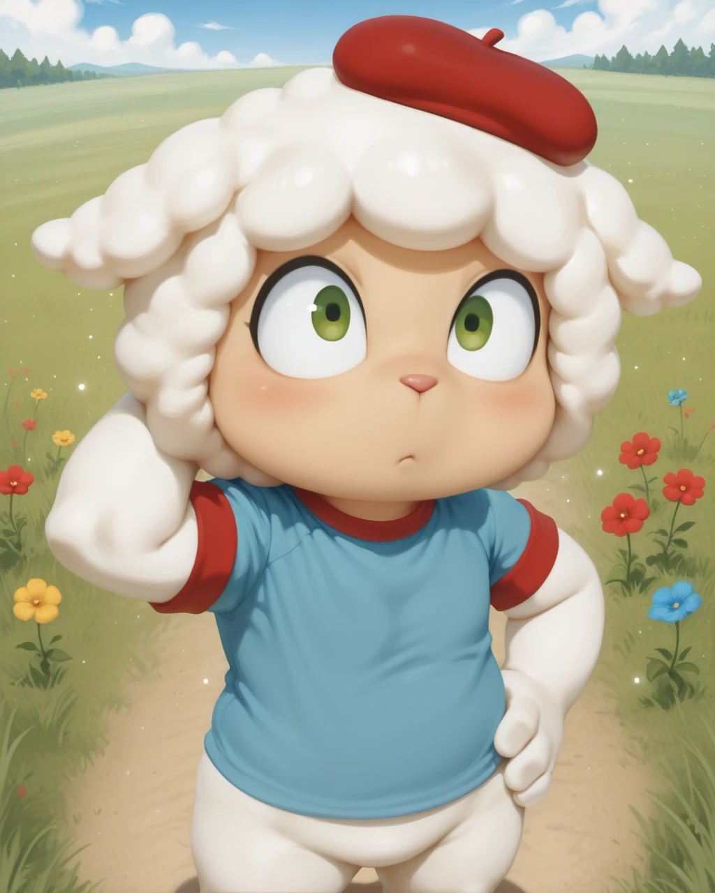 CloudMarshmallow TimesIL1, sheep, white wool, red beret hat, green eyes, Blue T-shirt with red sleeves, male,