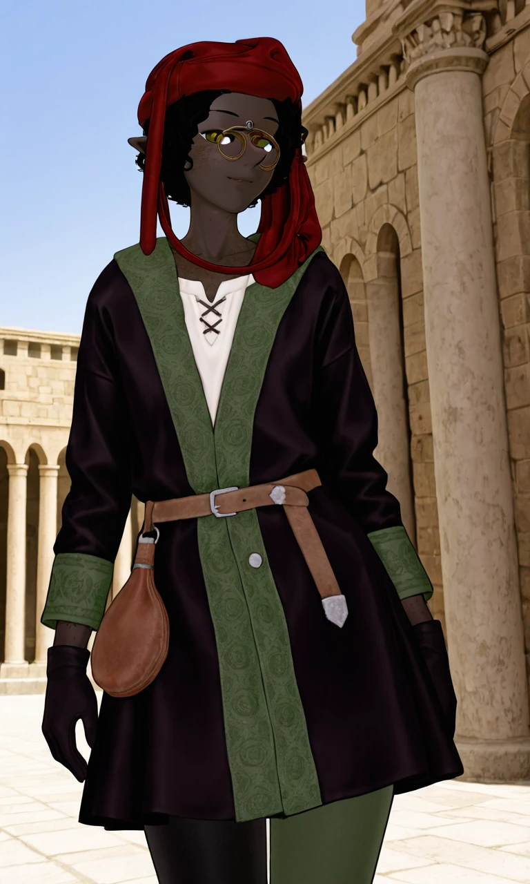 ruzgarzags, yellow eyes, black hair, slit pupils, grey skin, goblin, long nose, curly hair, freckles, body freckles, pointy ears, very dark skin, glasses, round eyewear, short hair