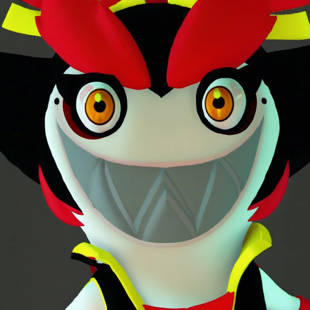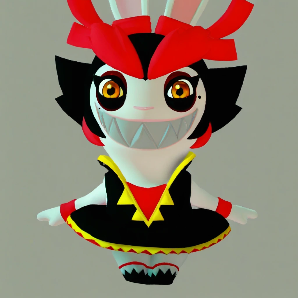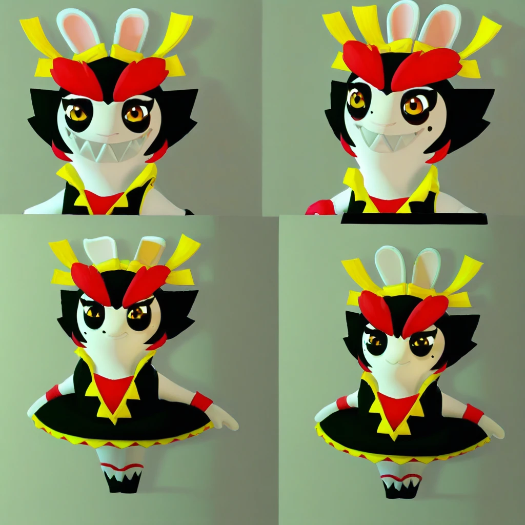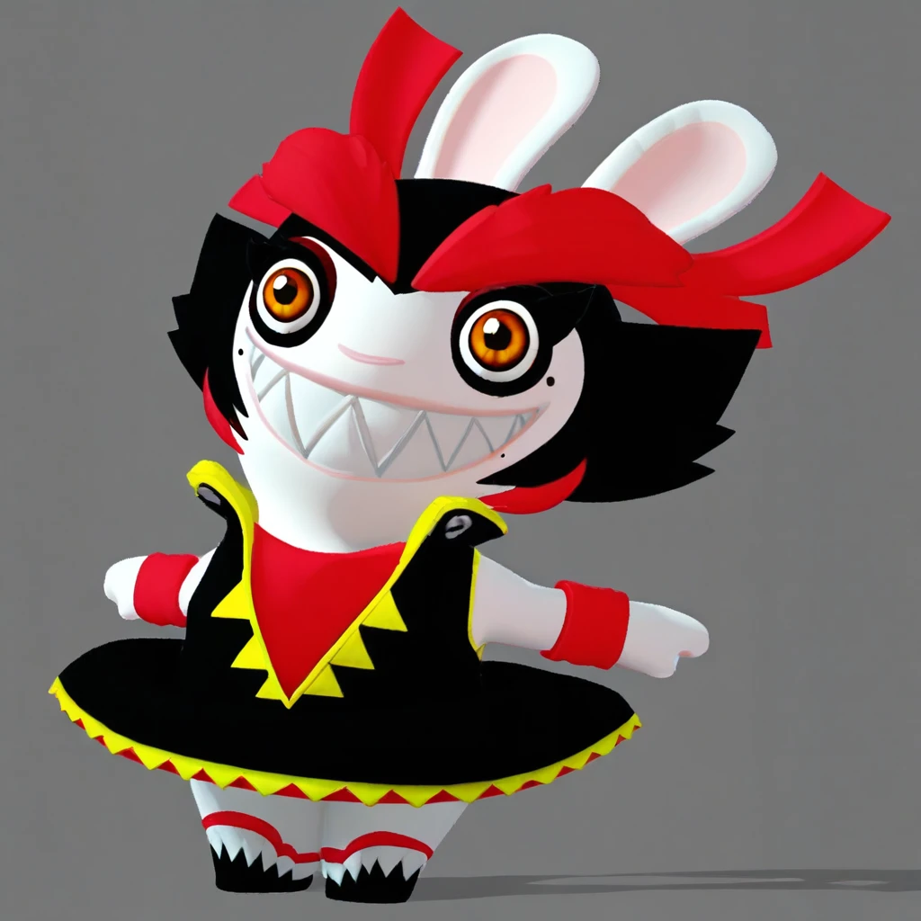 Kanya, anthro rabbit, shortstack, short black hair, big red eyebrows, orange eyes, ribbons on ears, yellow ribbons , red wristbands,black dress, miniskirt, black boots, sharp teeth