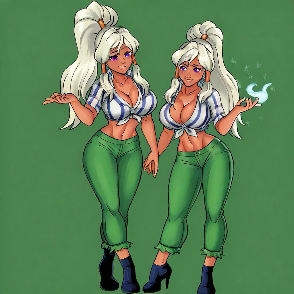 1girl, sara, purple eyes, black skin, white hair, ponytail, cropped shirt, cropped pants, yellow boots,