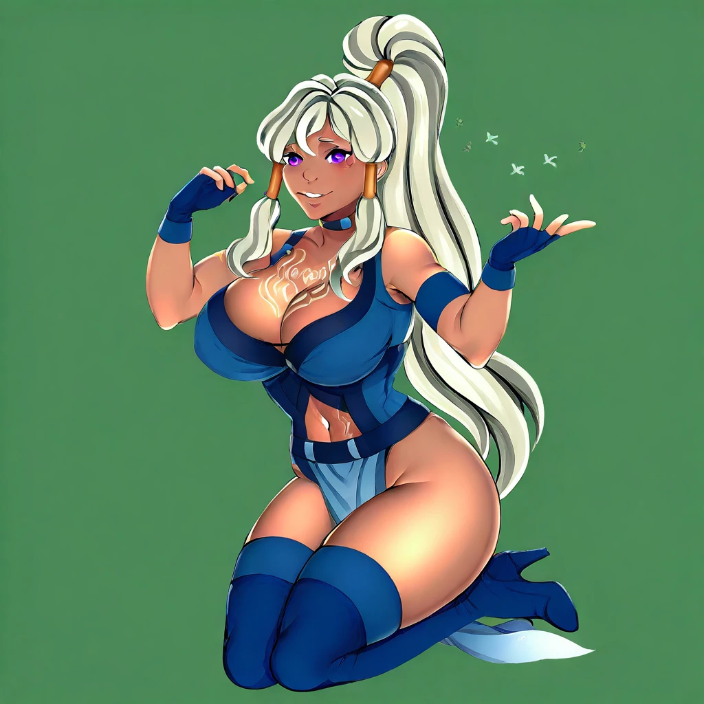 1girl, sara, purple eyes, black skin, white hair, ponytail, outfit, cleavage belly, thighhighs, thigh, boots,