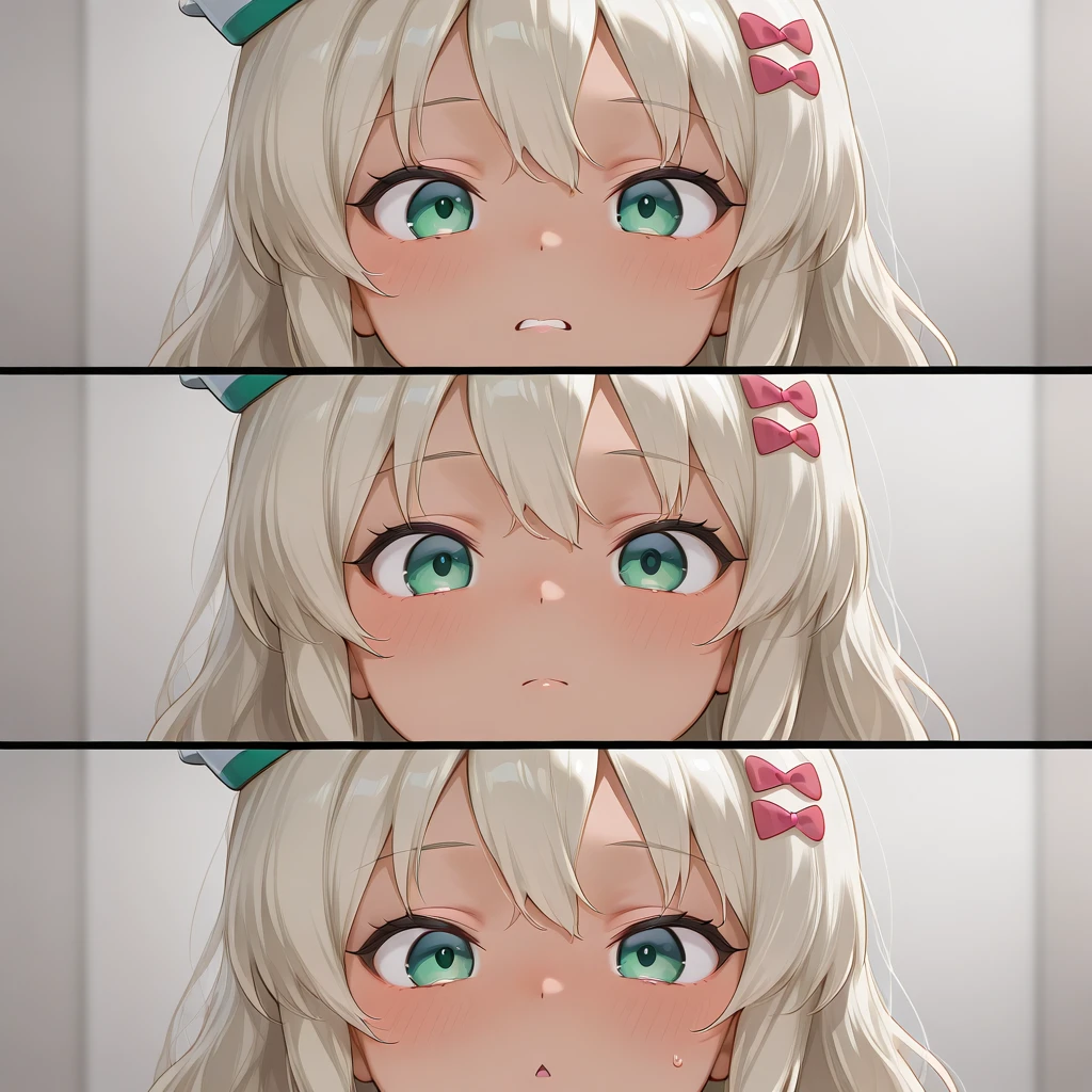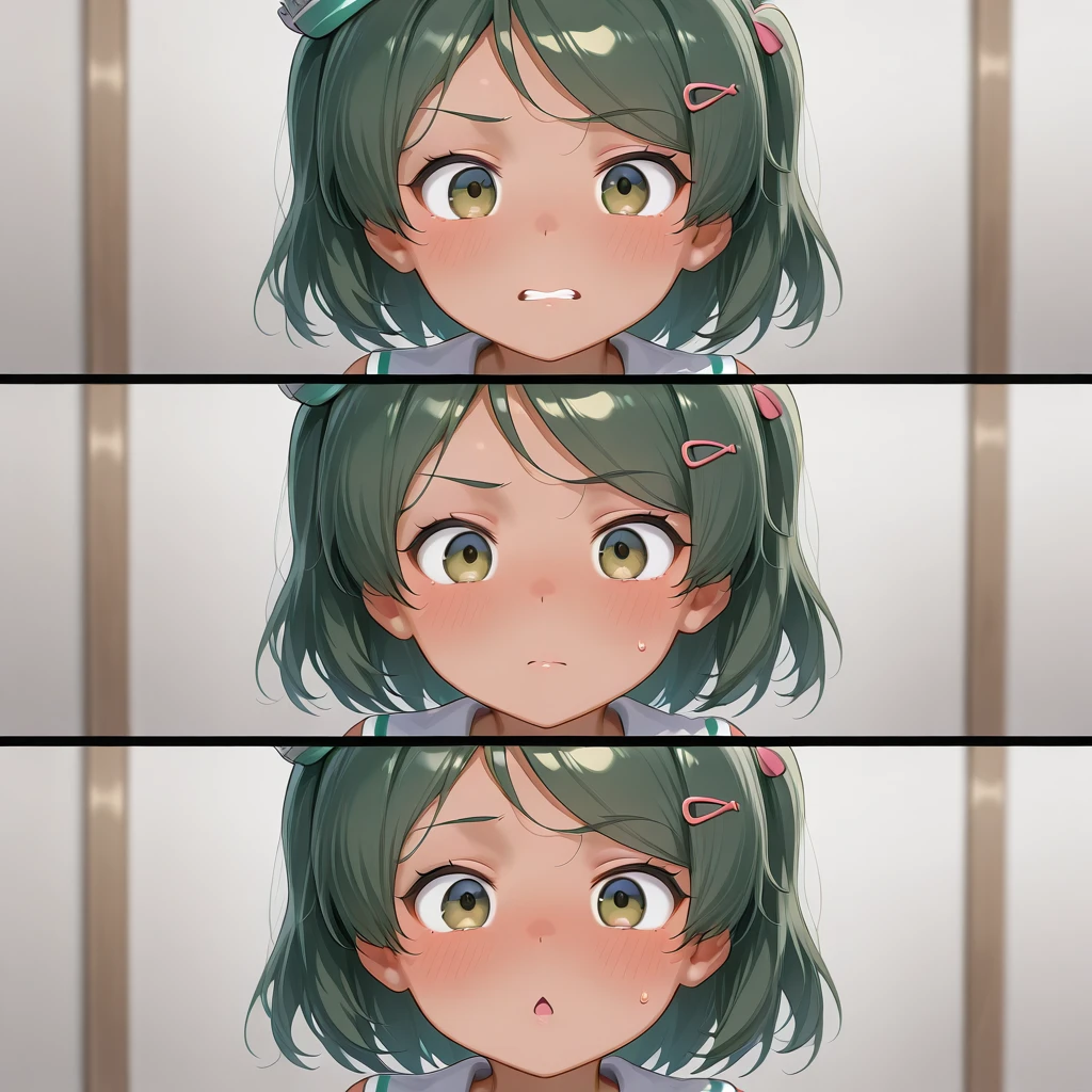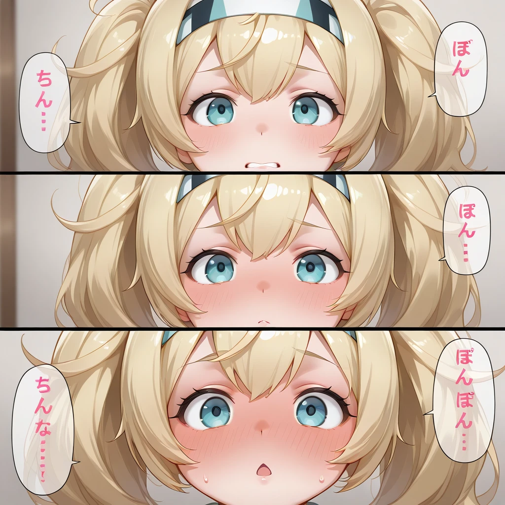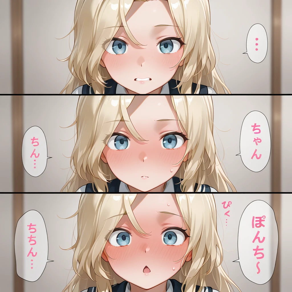 1girl,solo,tn_p,tunpoko\(meme\),3koma,clenched teeth,closed mouth,chestnut mouth,blush,speech bubble,Japanese text, "ち", "ん", "ぽ",