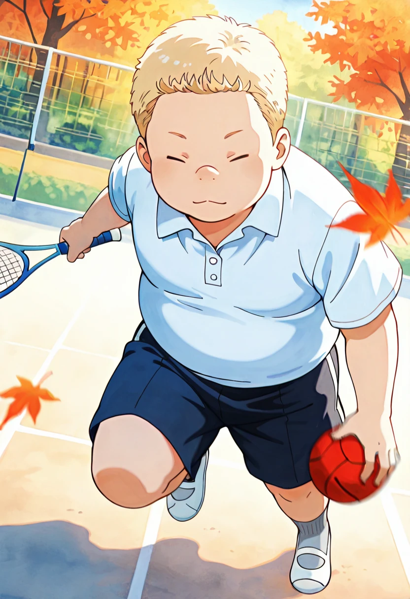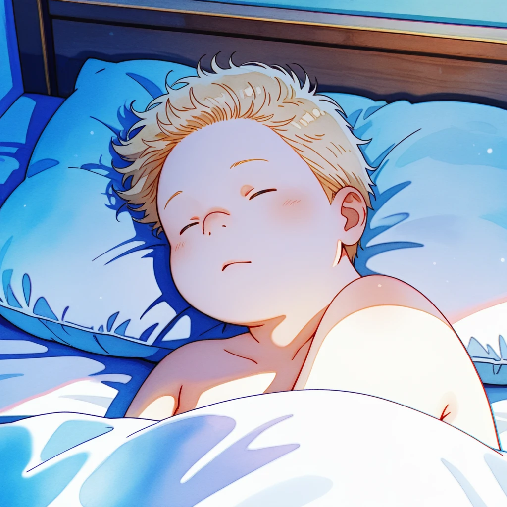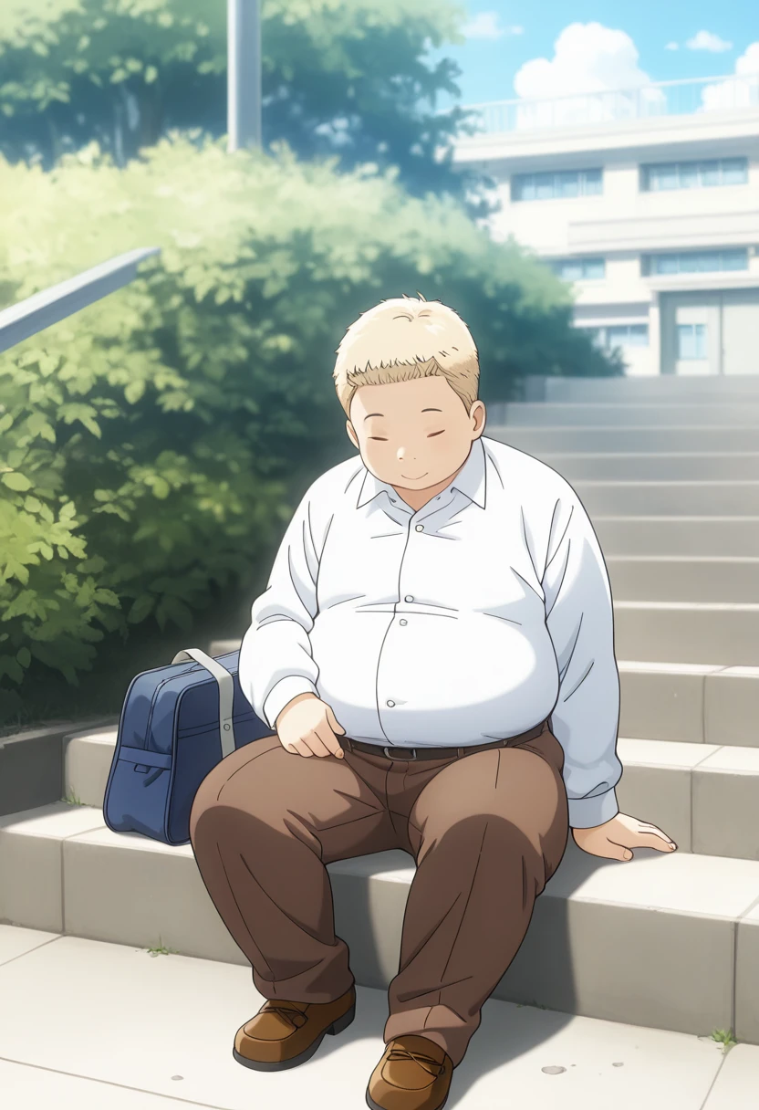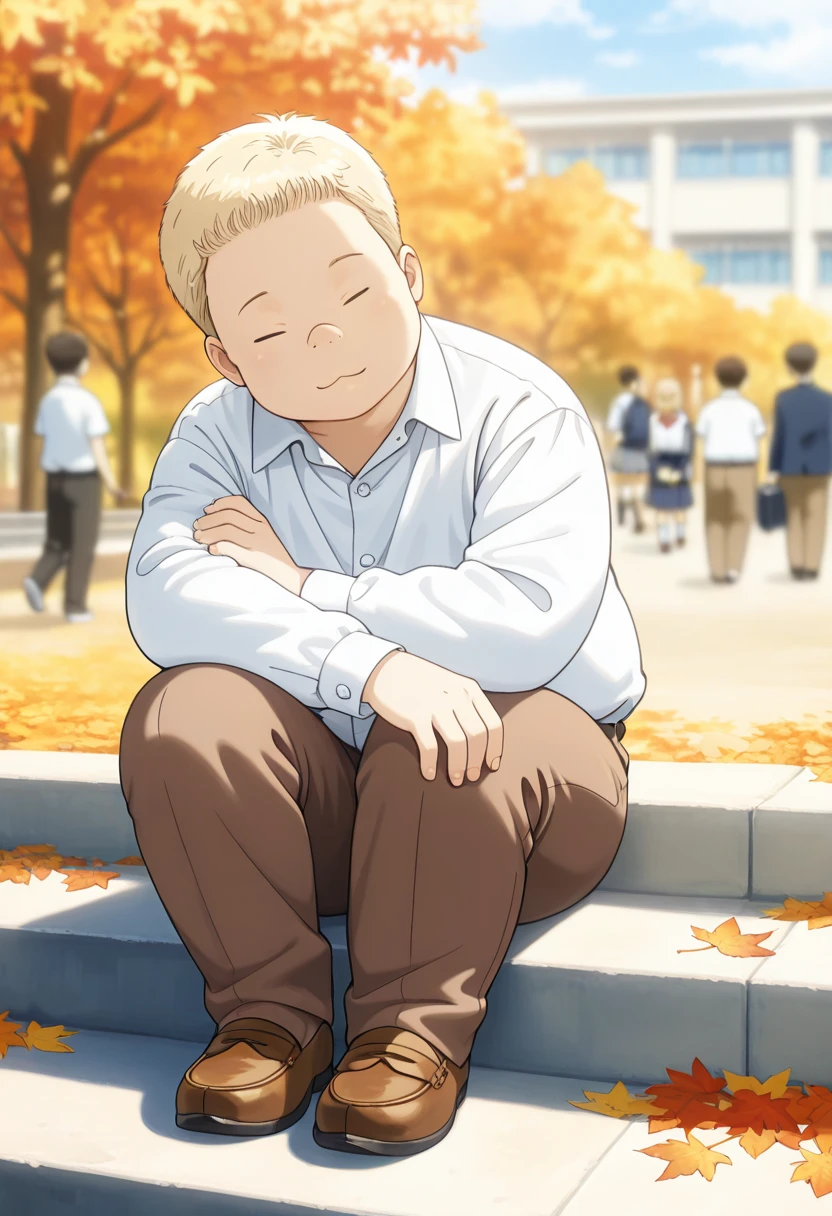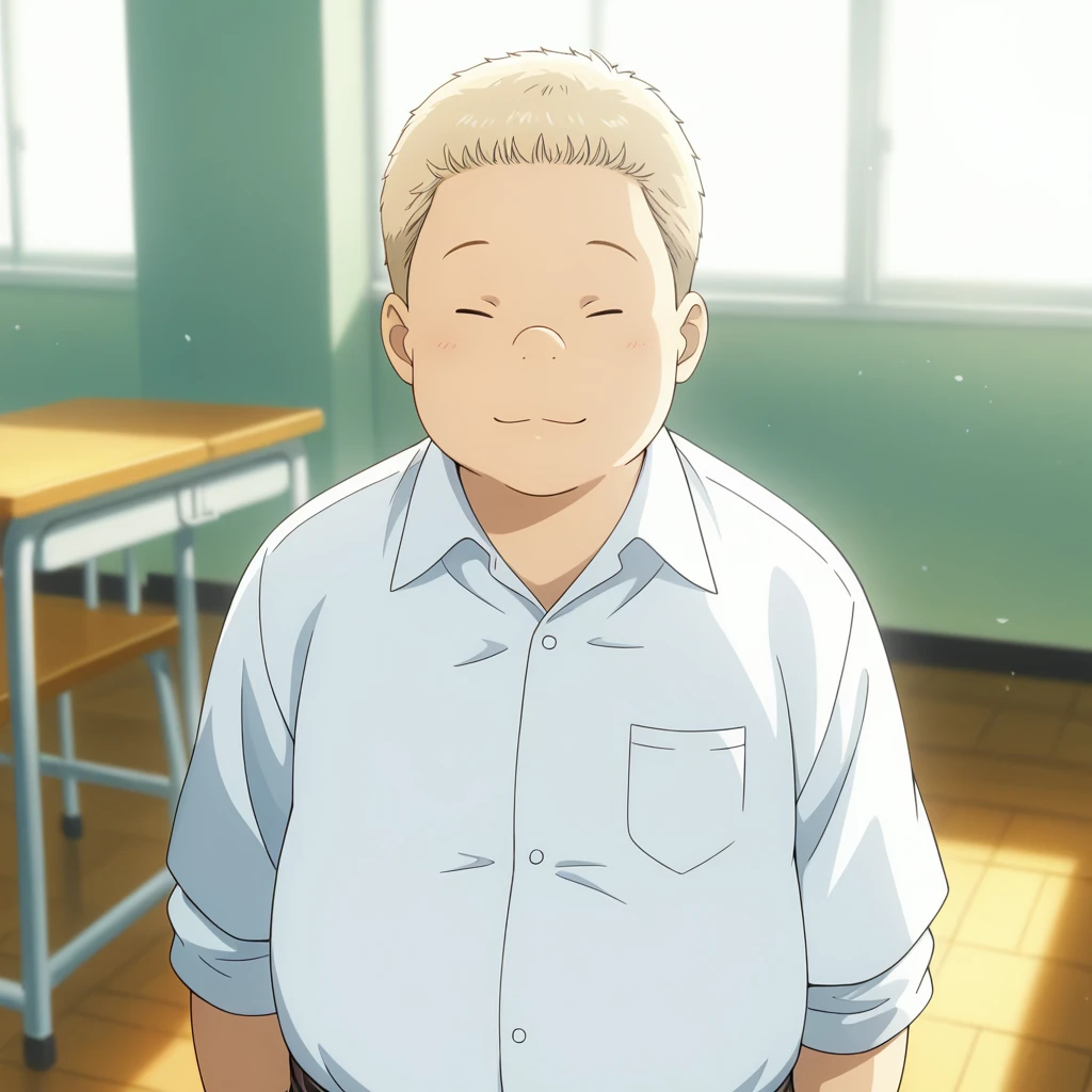 cyuseinb, 1boy, chubby, blonde hair, short hair, closed eyes,