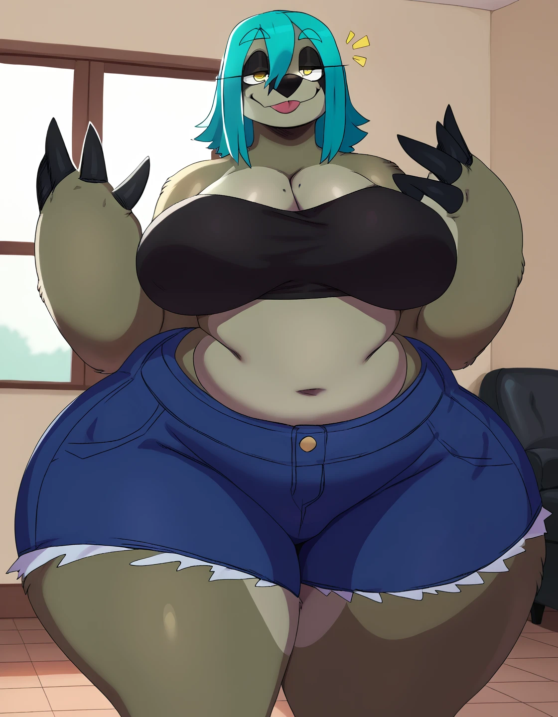 <lora:Nella_sssonic2:0.8>, n3lla, furry sloth:1.2, long sloth claws, blue hair, grey fur, grey body, markings, curvy, slightly chubby, big breasts, wide hips, huge female, negative