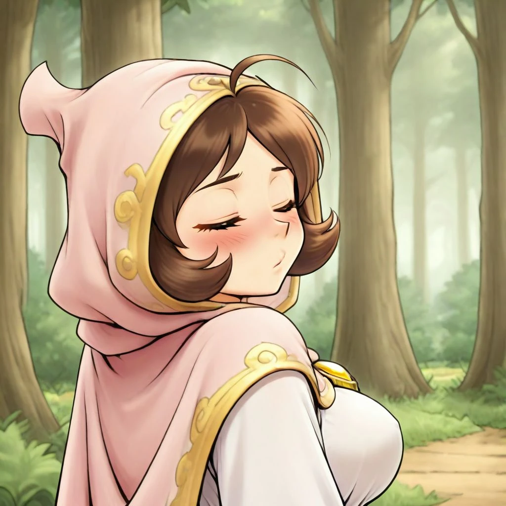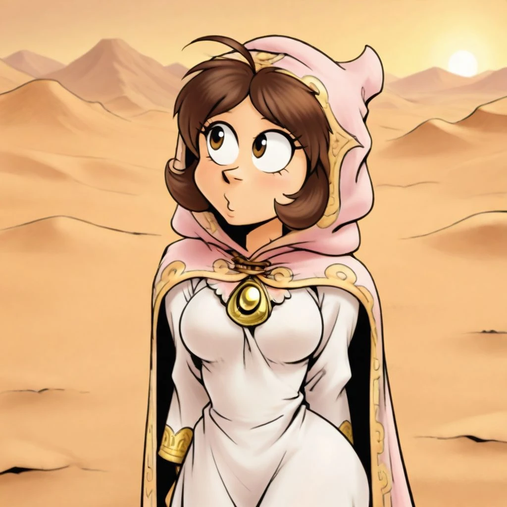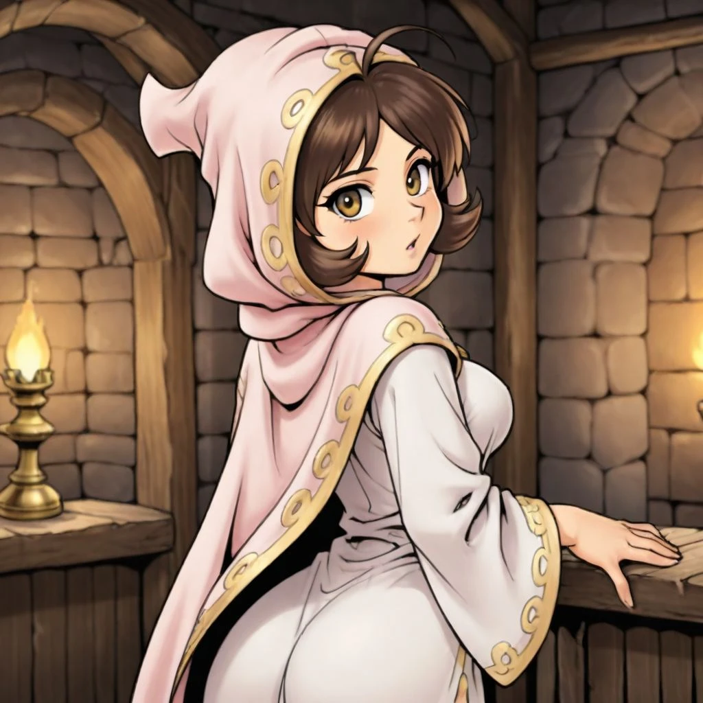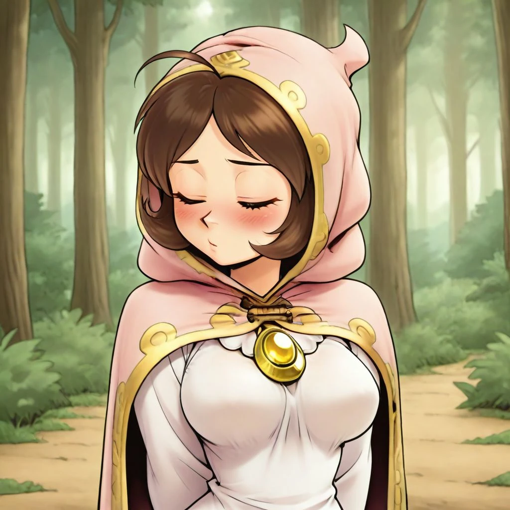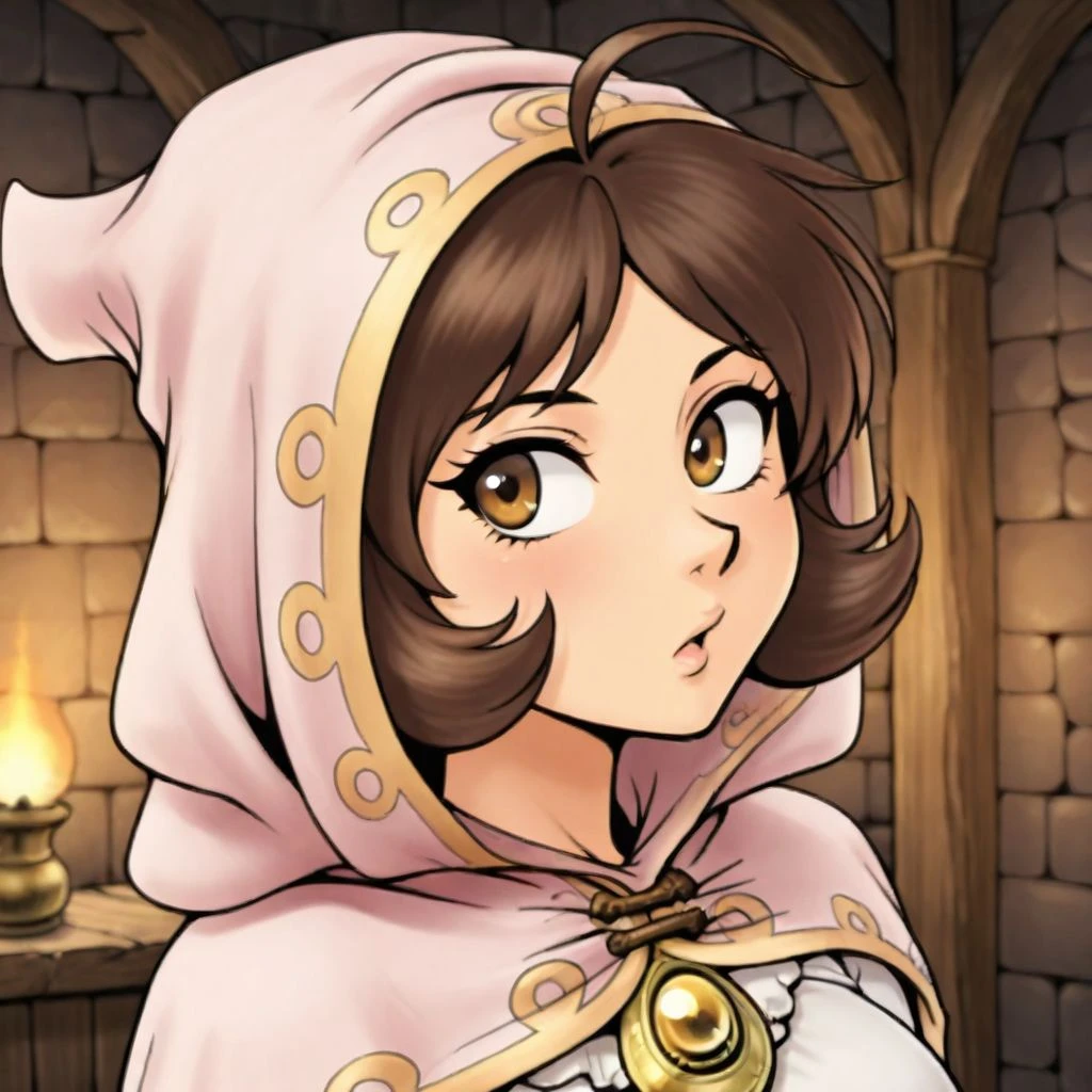 sonjaska_naheulbeuk, light pink cloak, white robes, golden trims, large sleeves, brown hair, golden jewel,