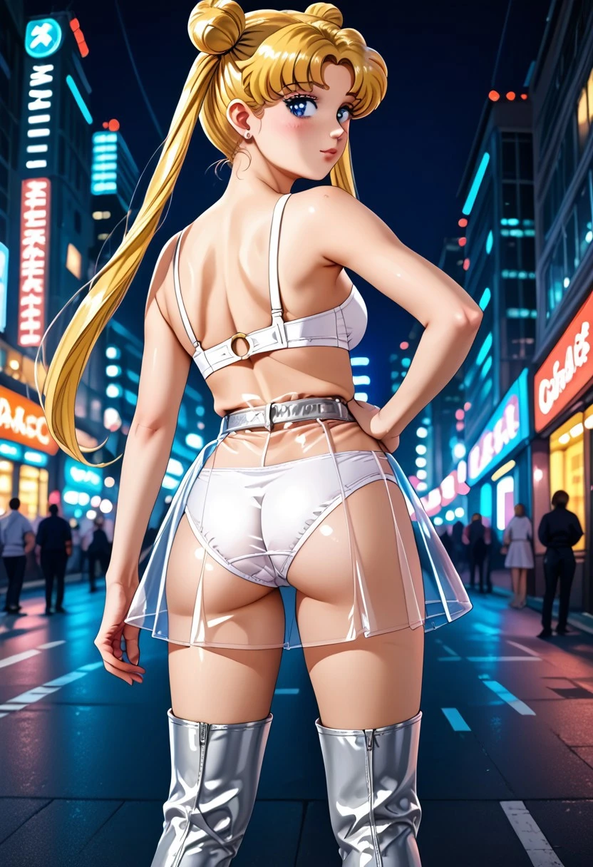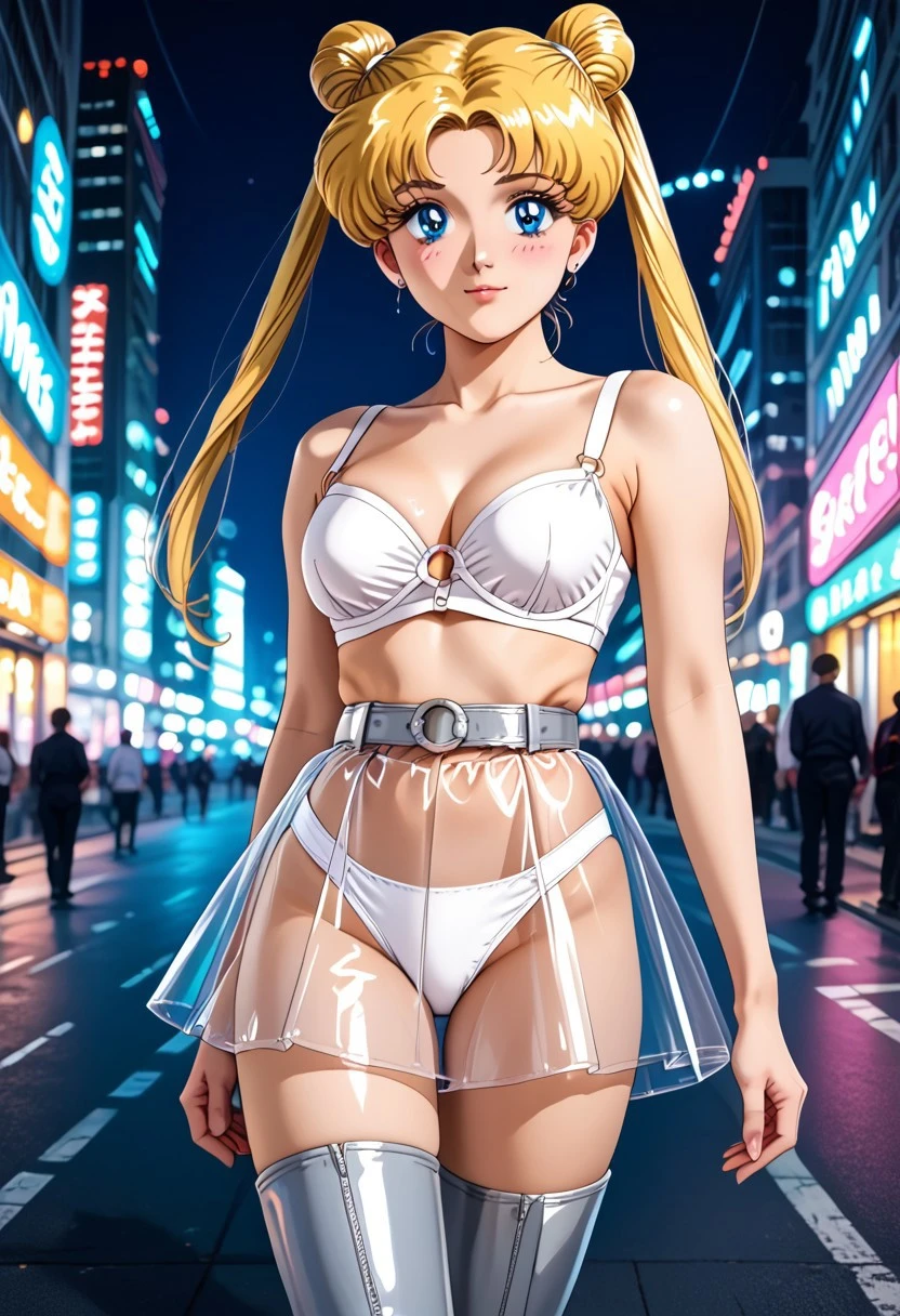 (Plastic Skirt, Sheer Skirt, Visible Underwear, Short Skirt, Pleated Skirt, Silver Waistband, Underwear, White Panties, Latex Panties, High Leg Panties, Latex Bra, White Bra, O-Ring, Strapless Bra, Silver Boots, Thigh High Boots)
