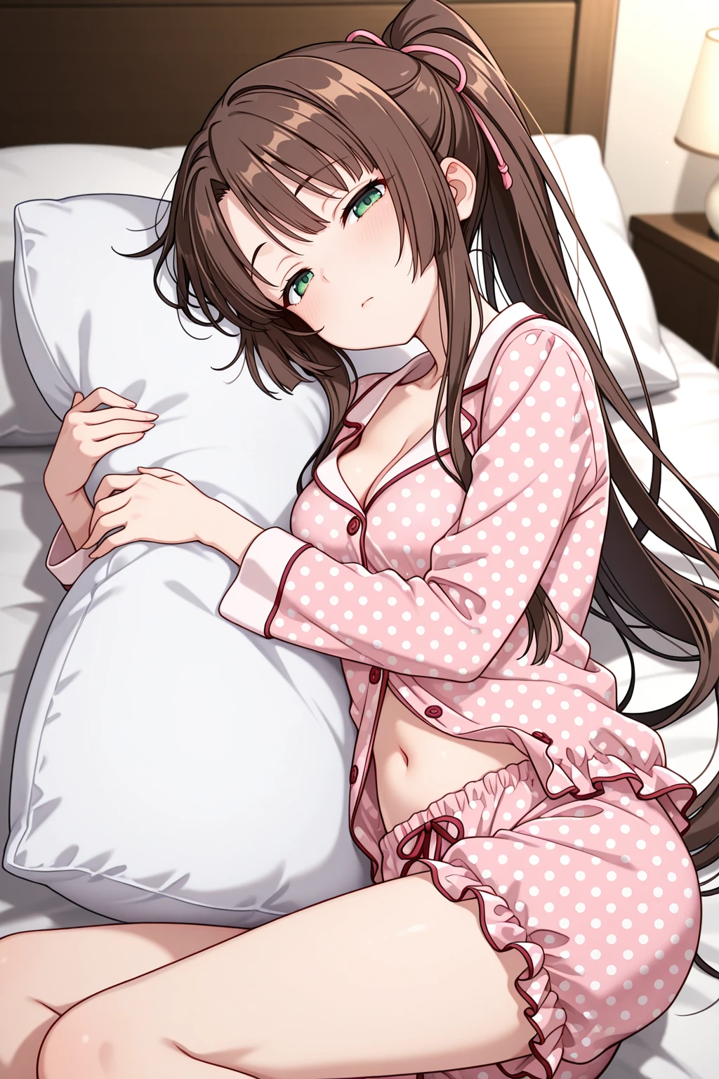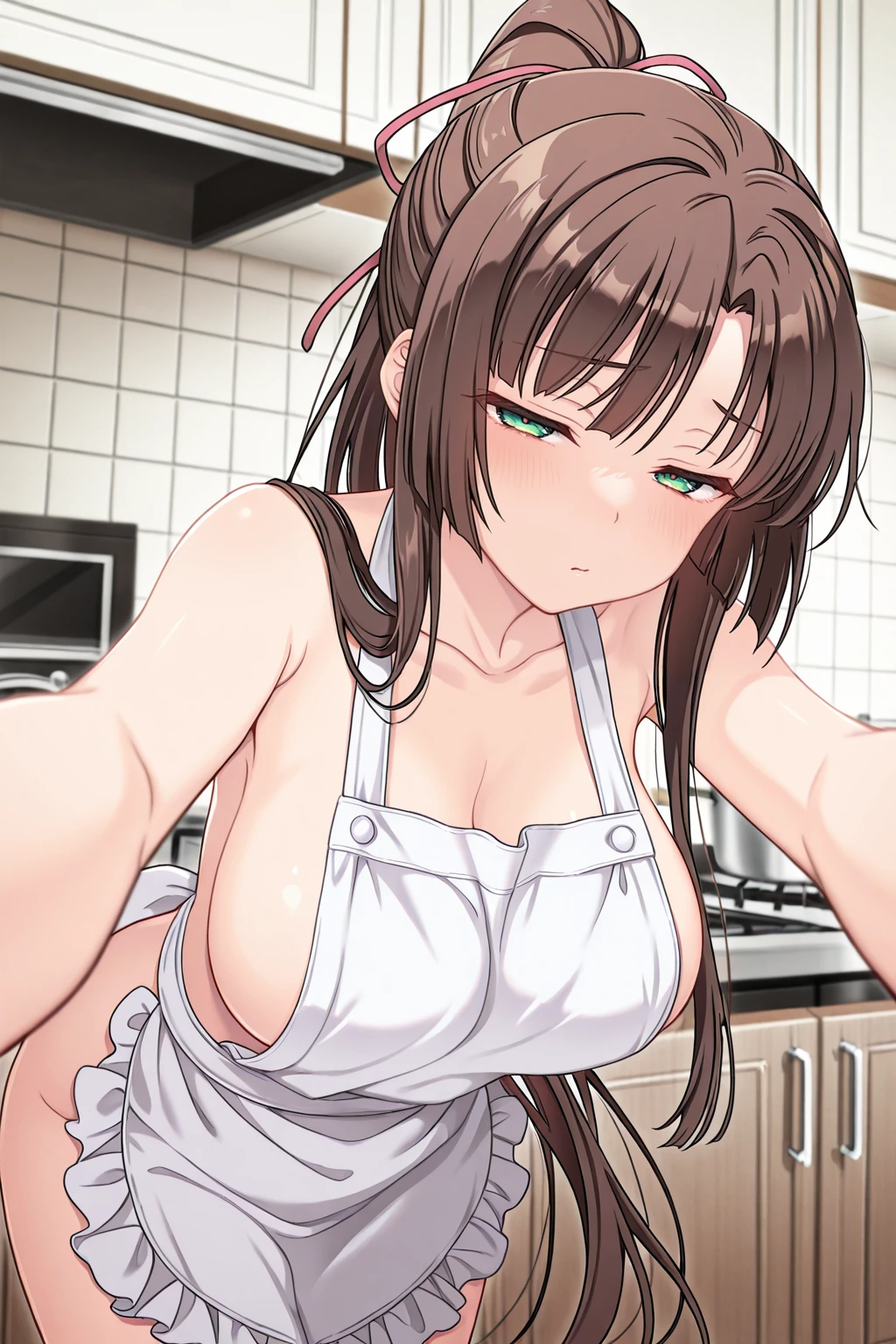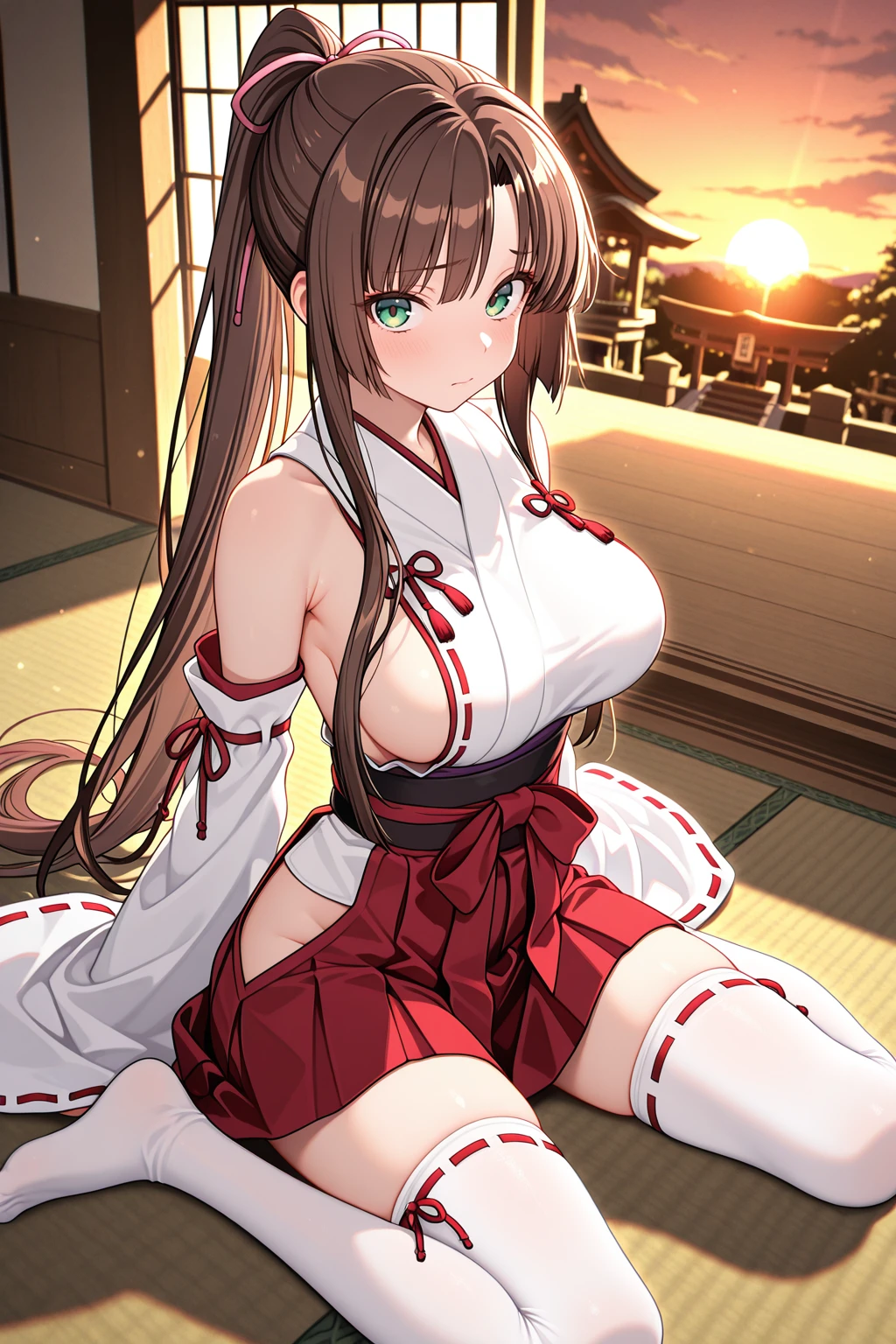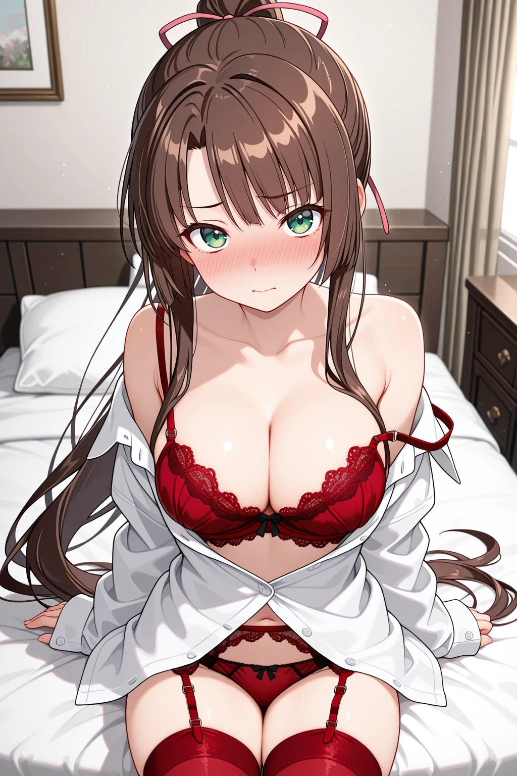 kirasaka sayaka, green eyes, very long hair, ponytail, sidelocks, high ponytail, brown hair