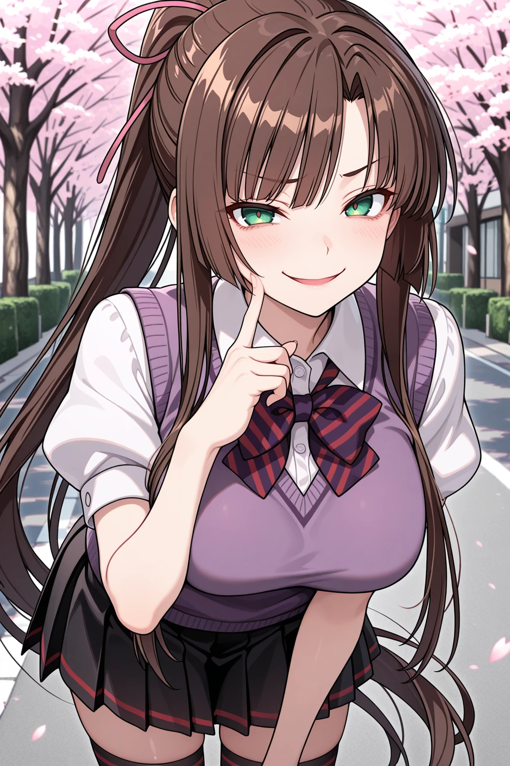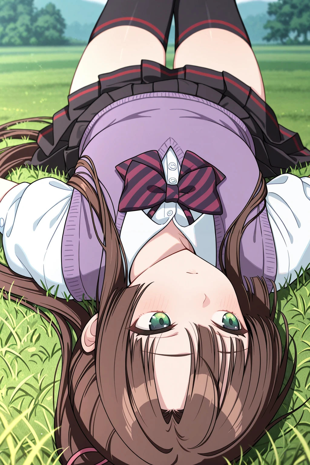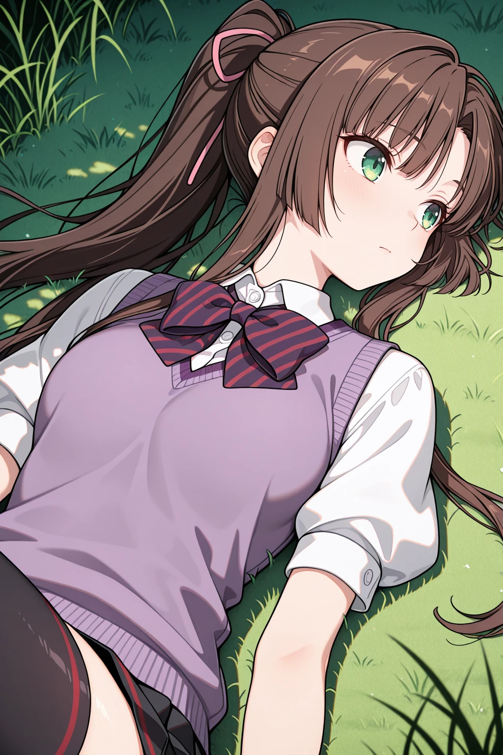 collared shirt, puffy short sleeves, purple vest, sweater vest, striped bowtie, black skirt, pleated skirt, black thighhighs Description