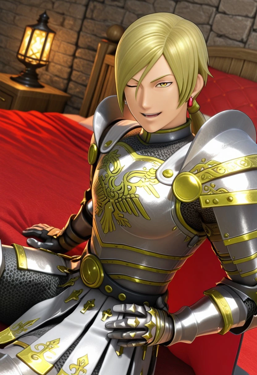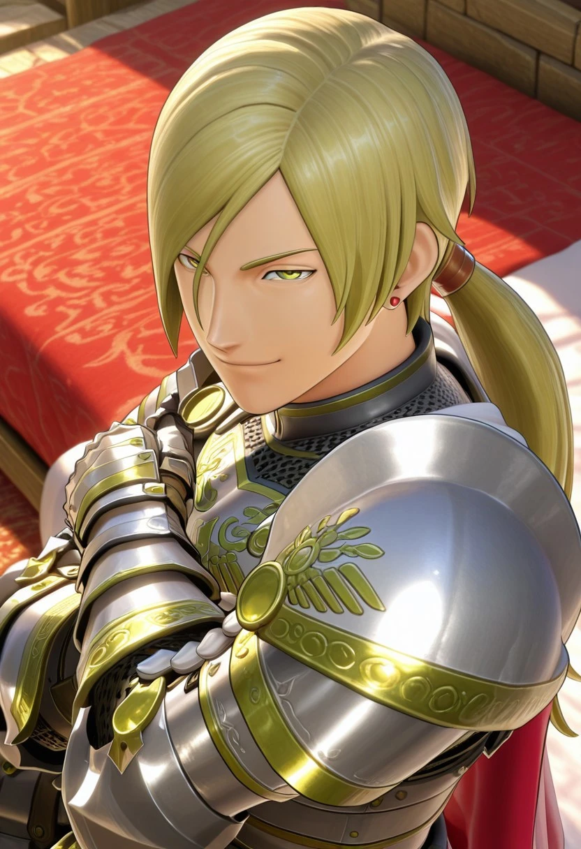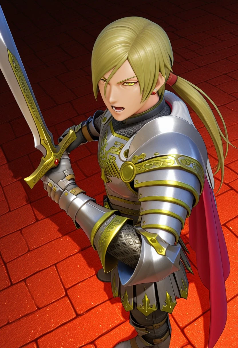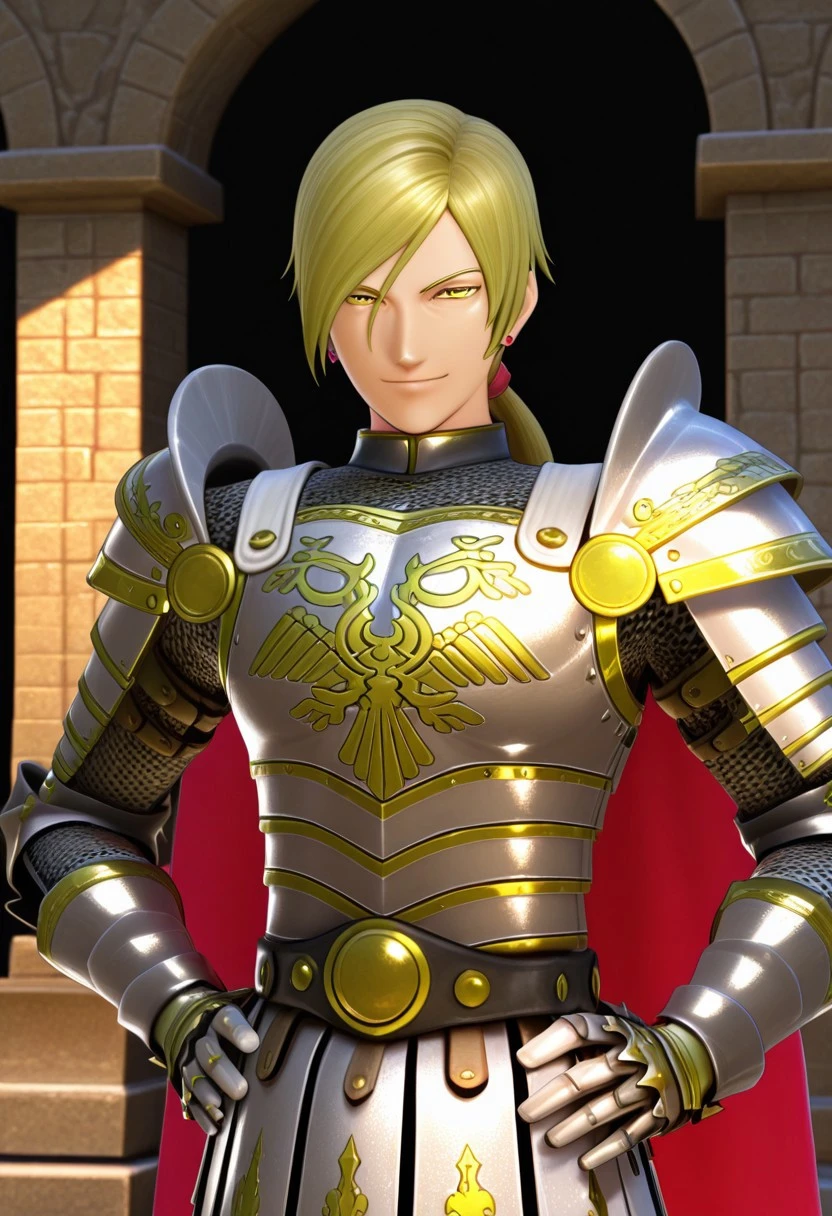 Jasper,blonde hair,ponytail,yellow eyes,earrings,armor,shoulder armor,gauntlets,cape,boots,