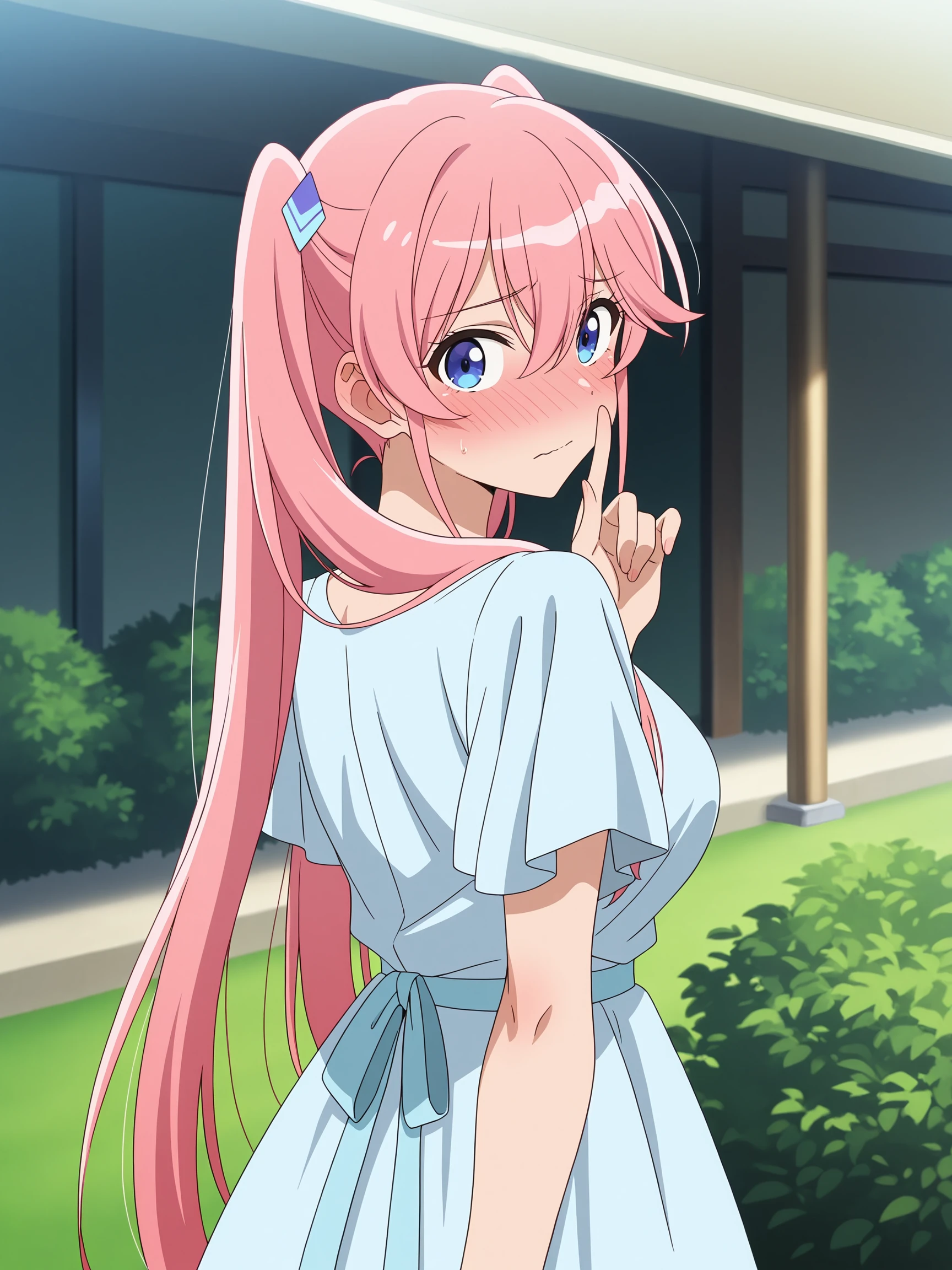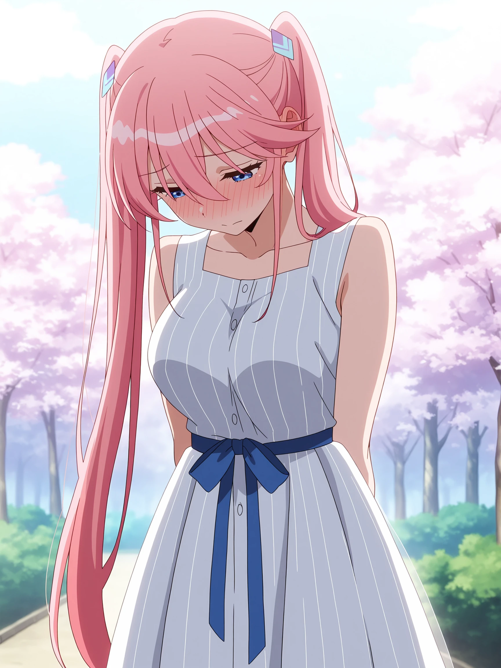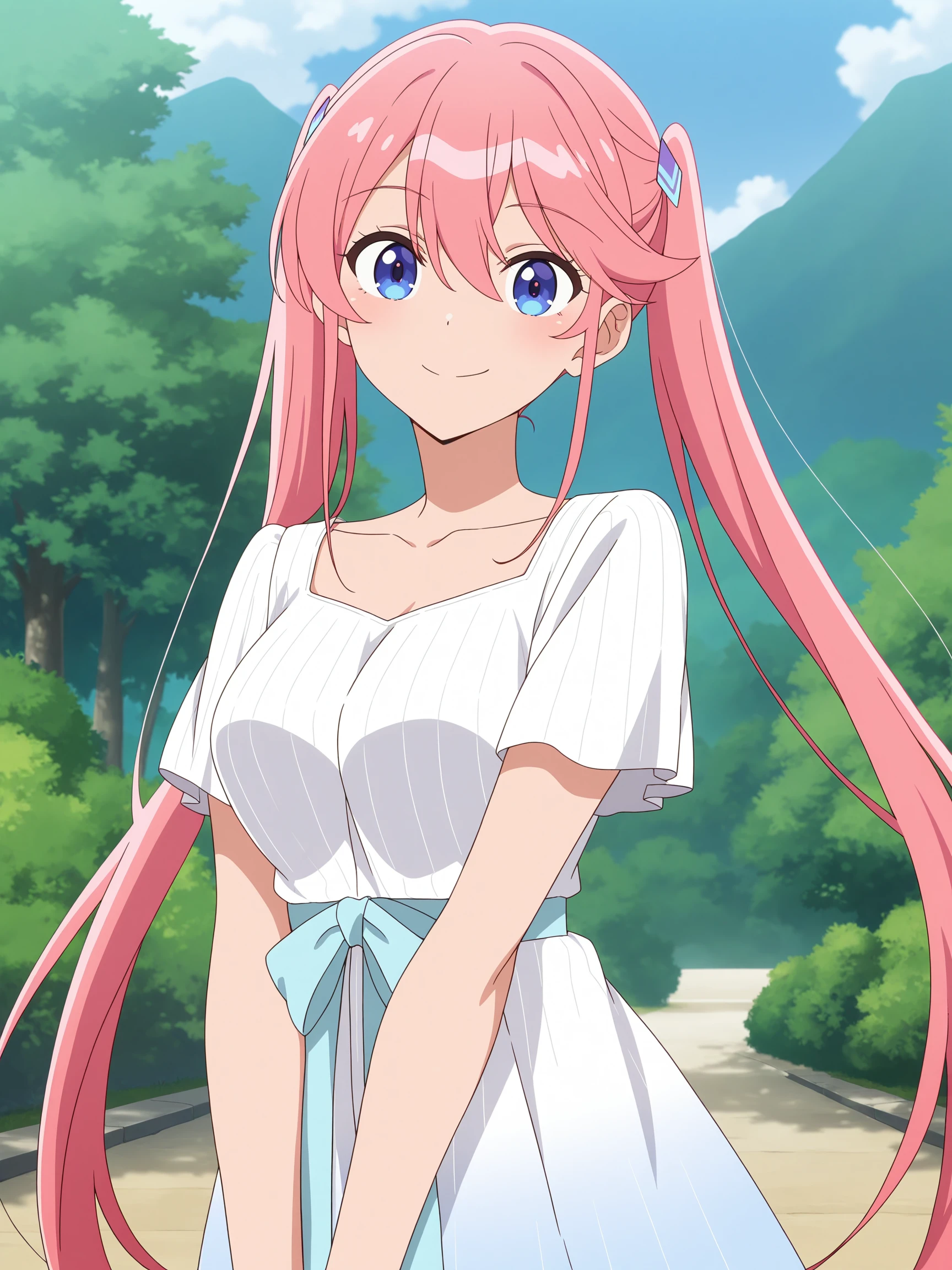 1girl, long hair, bangs, blue eyes, hair ornament, hair between eyes, twintails, pink hair, oka_shiunji