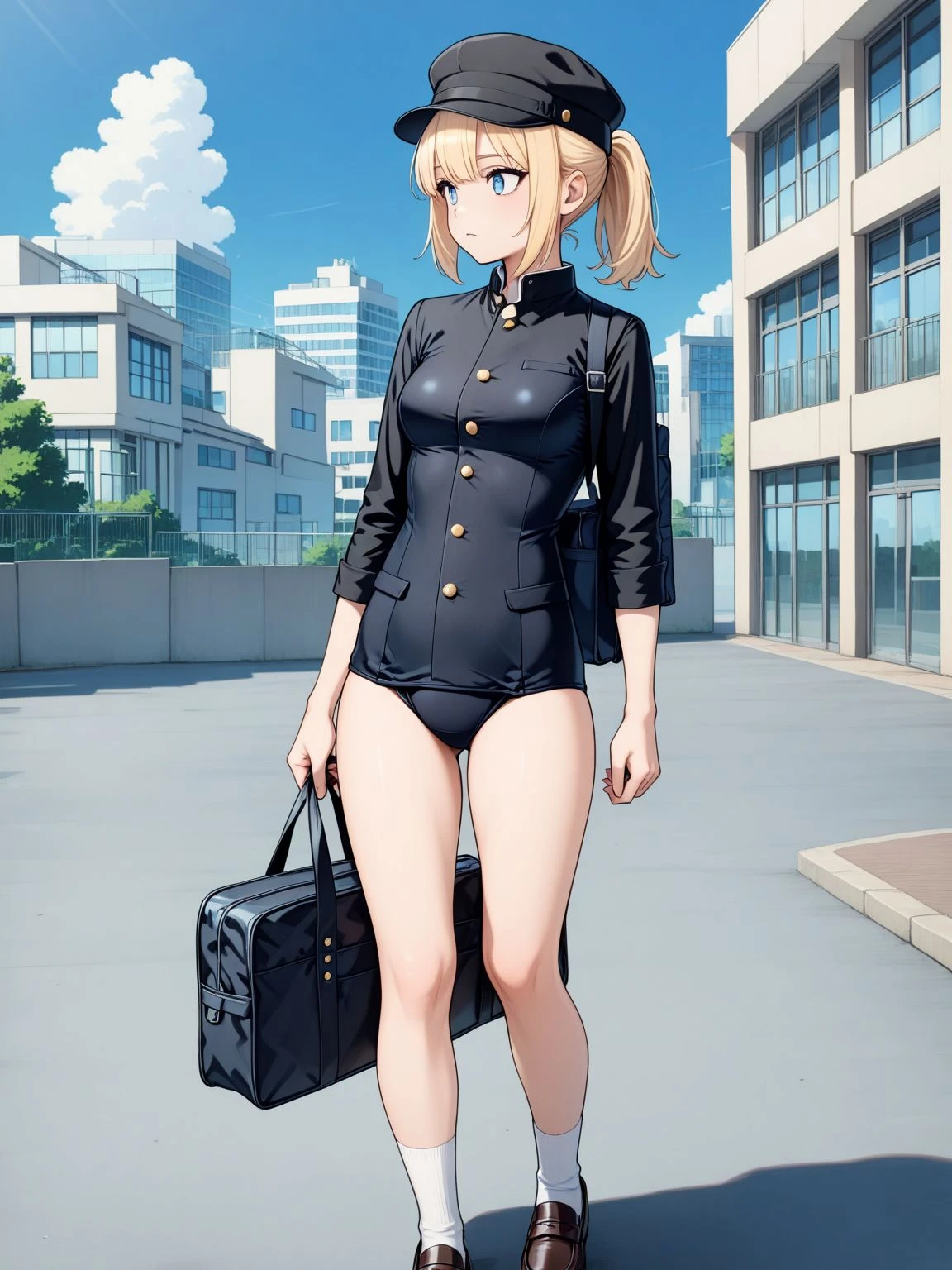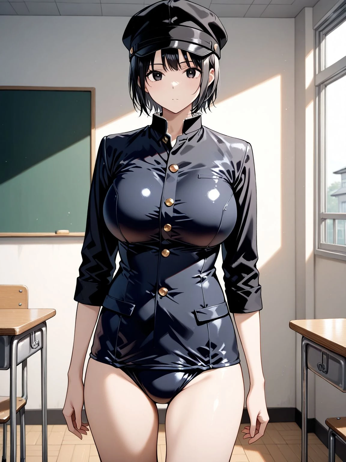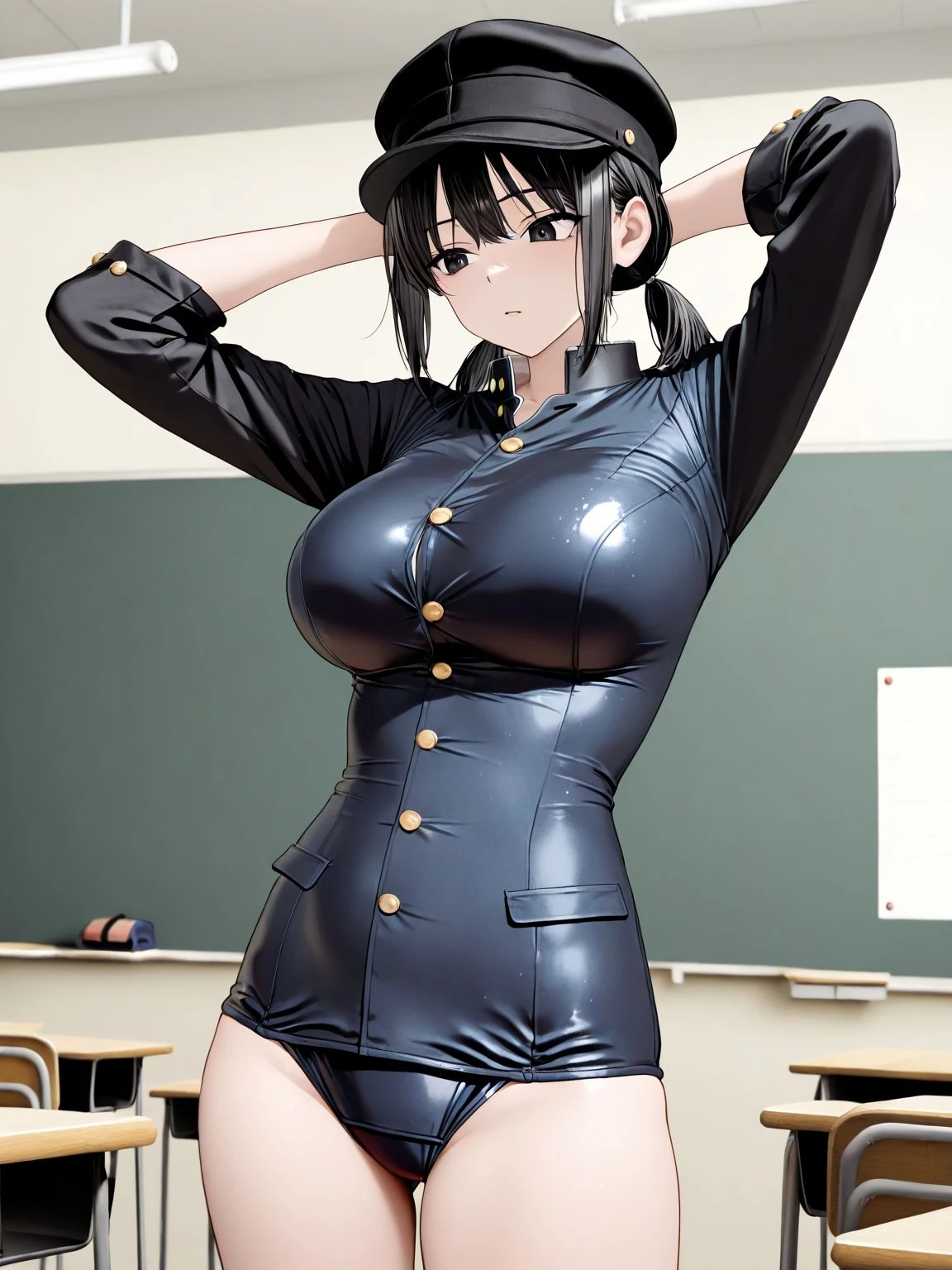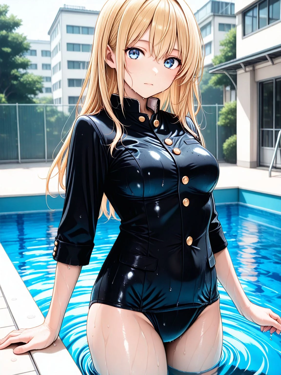one-piece swimsuit,black one-piece swimsuit,gakuran,school swimsuit,buttons,long sleeves,black sleeves,sleeves rolled up