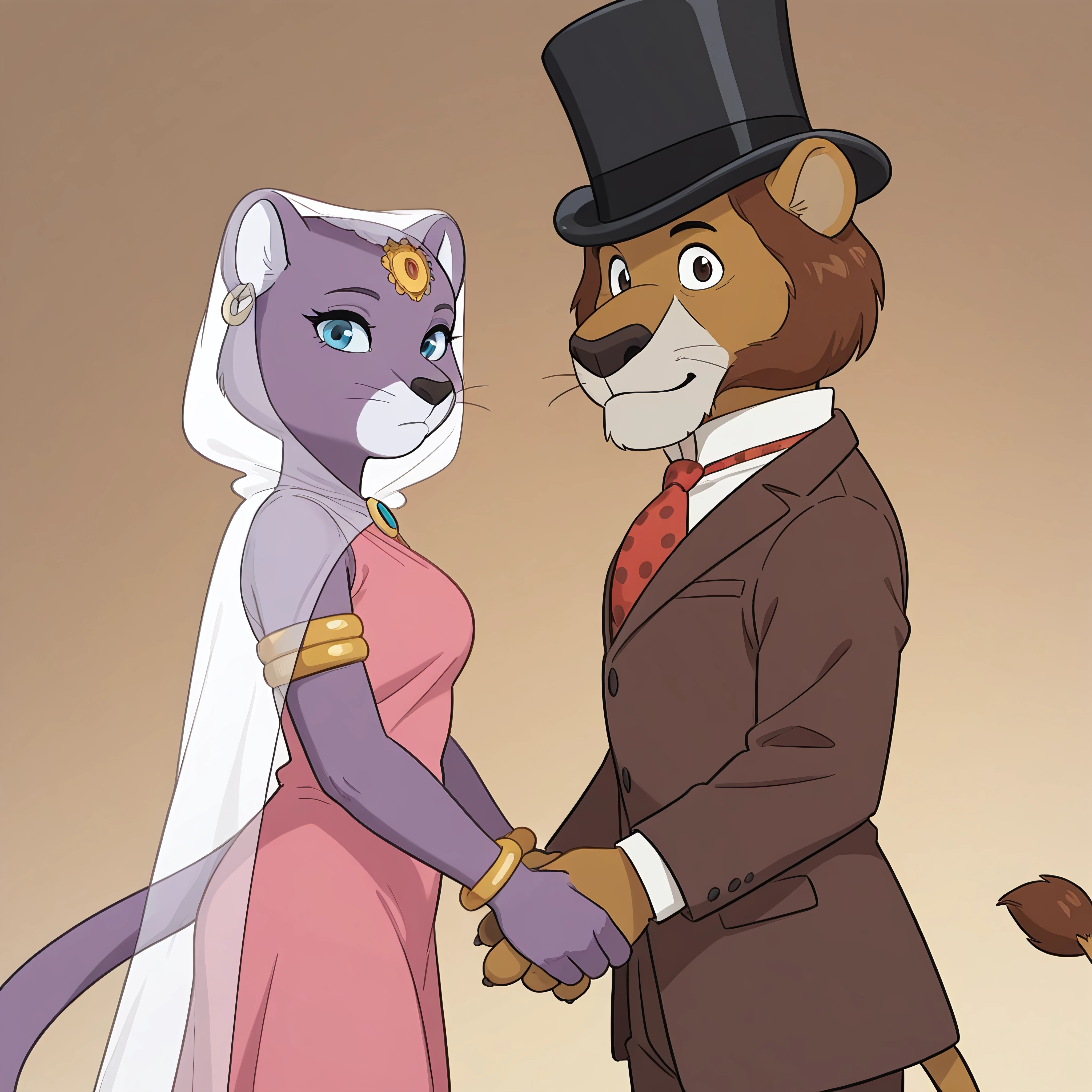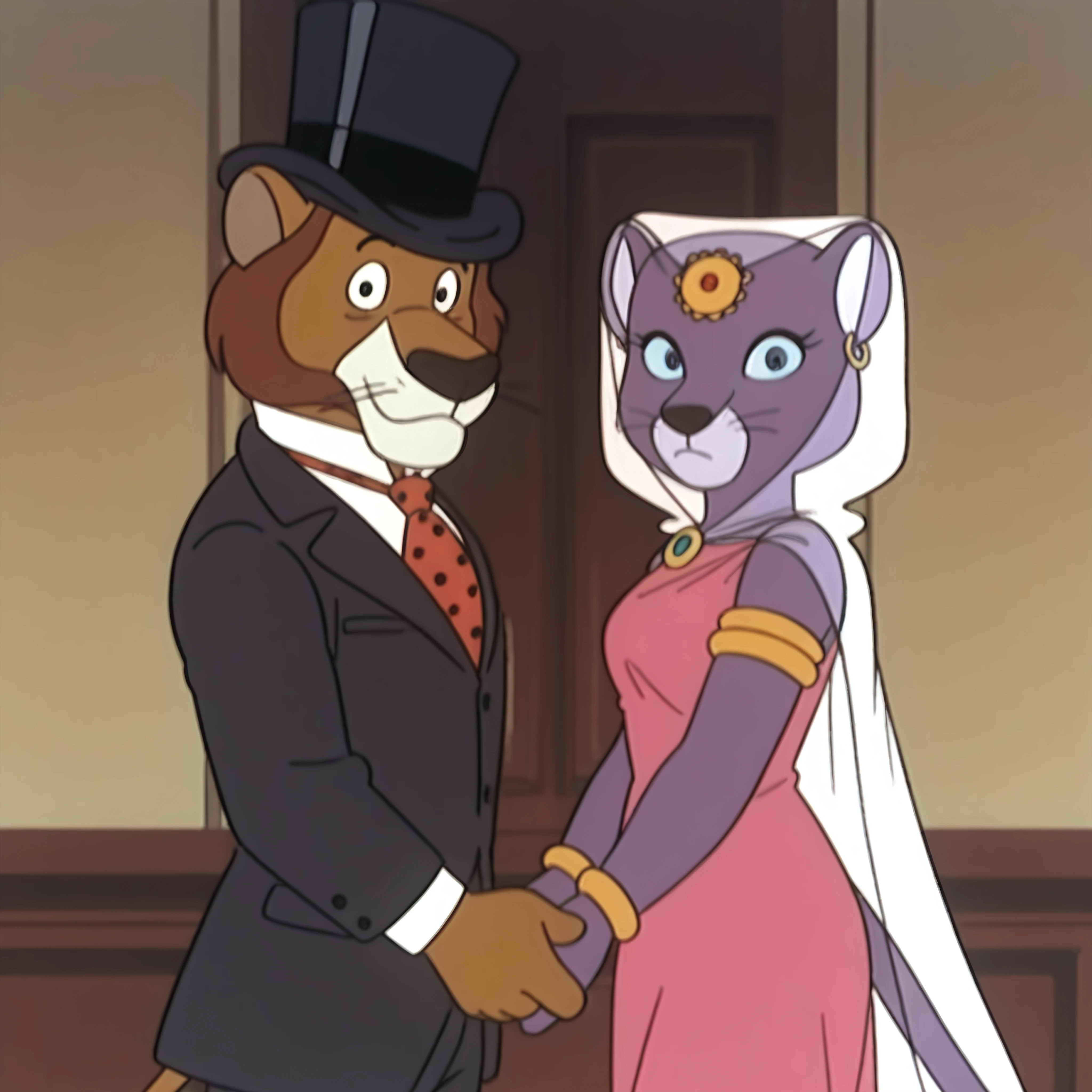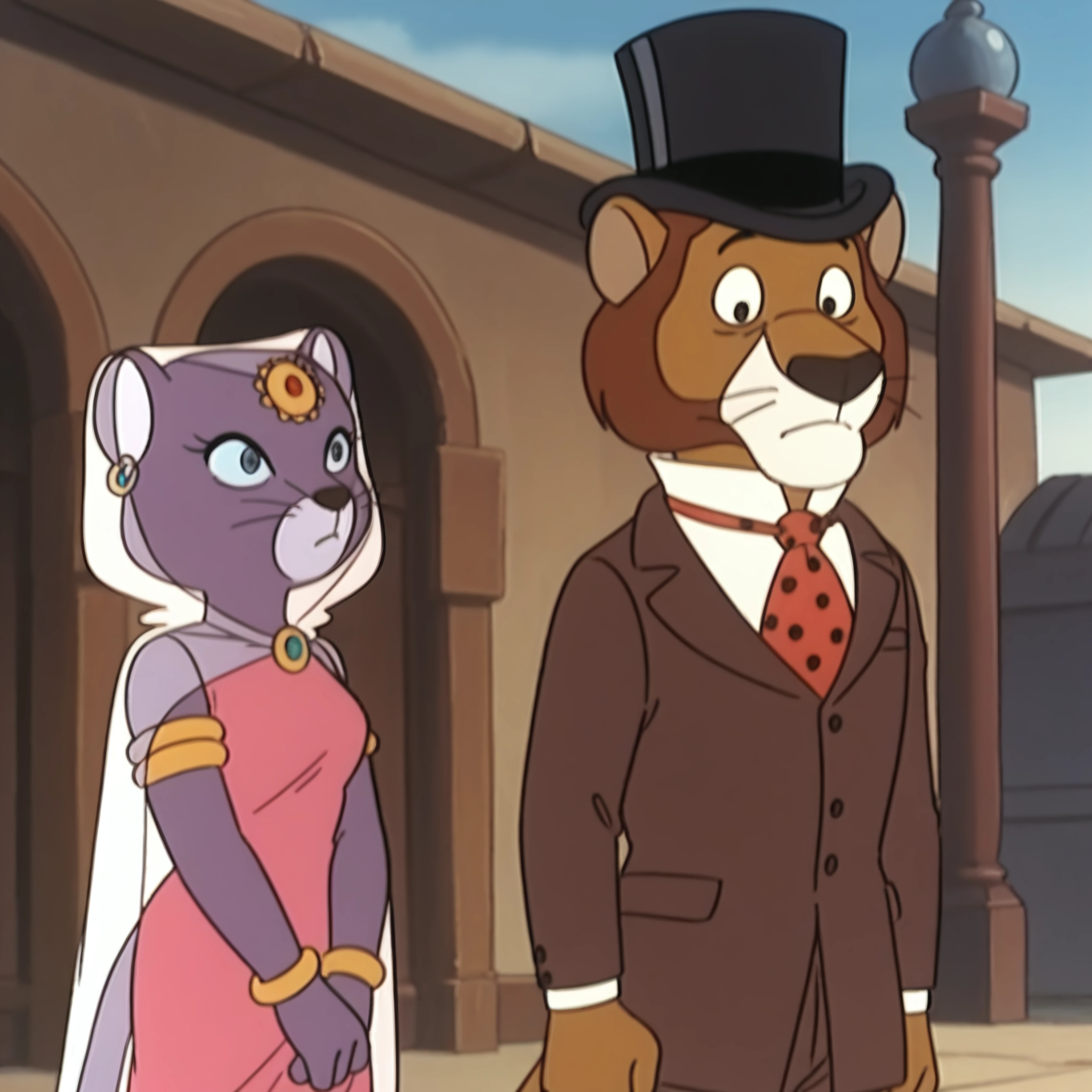 solo, originalstyle, Willy_fogatwwwf, male, suit, brown_suit, formal_wear, white_shirt, necktie, red_tie, polka_dot_tie, brown_trousers, black_hat, formal_hat,solo, originalstyle, Princess_Romyatwwwf, female, ornament forehead, gold earrings, veil, dress, gold bracelet, cape, for duo (unstable!):