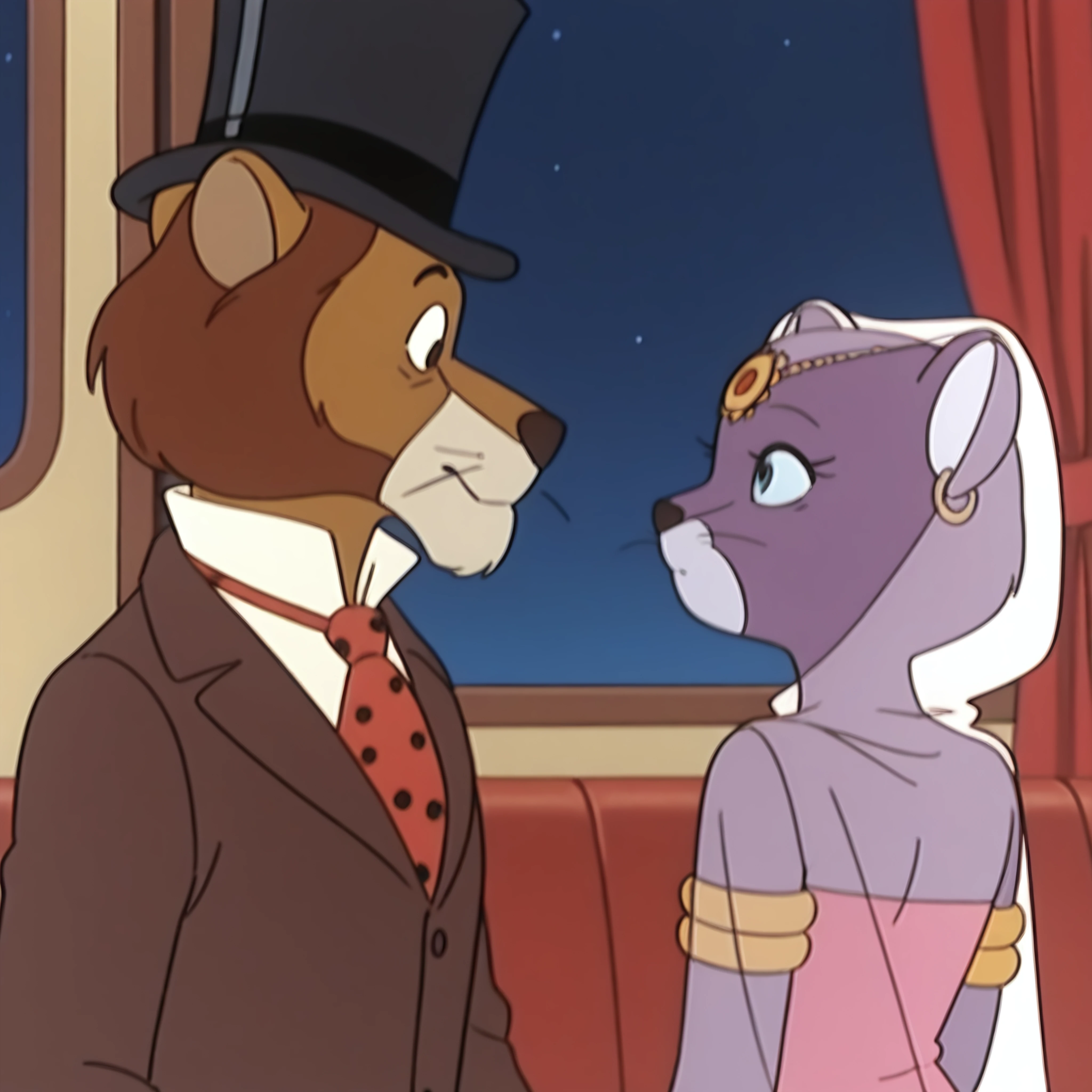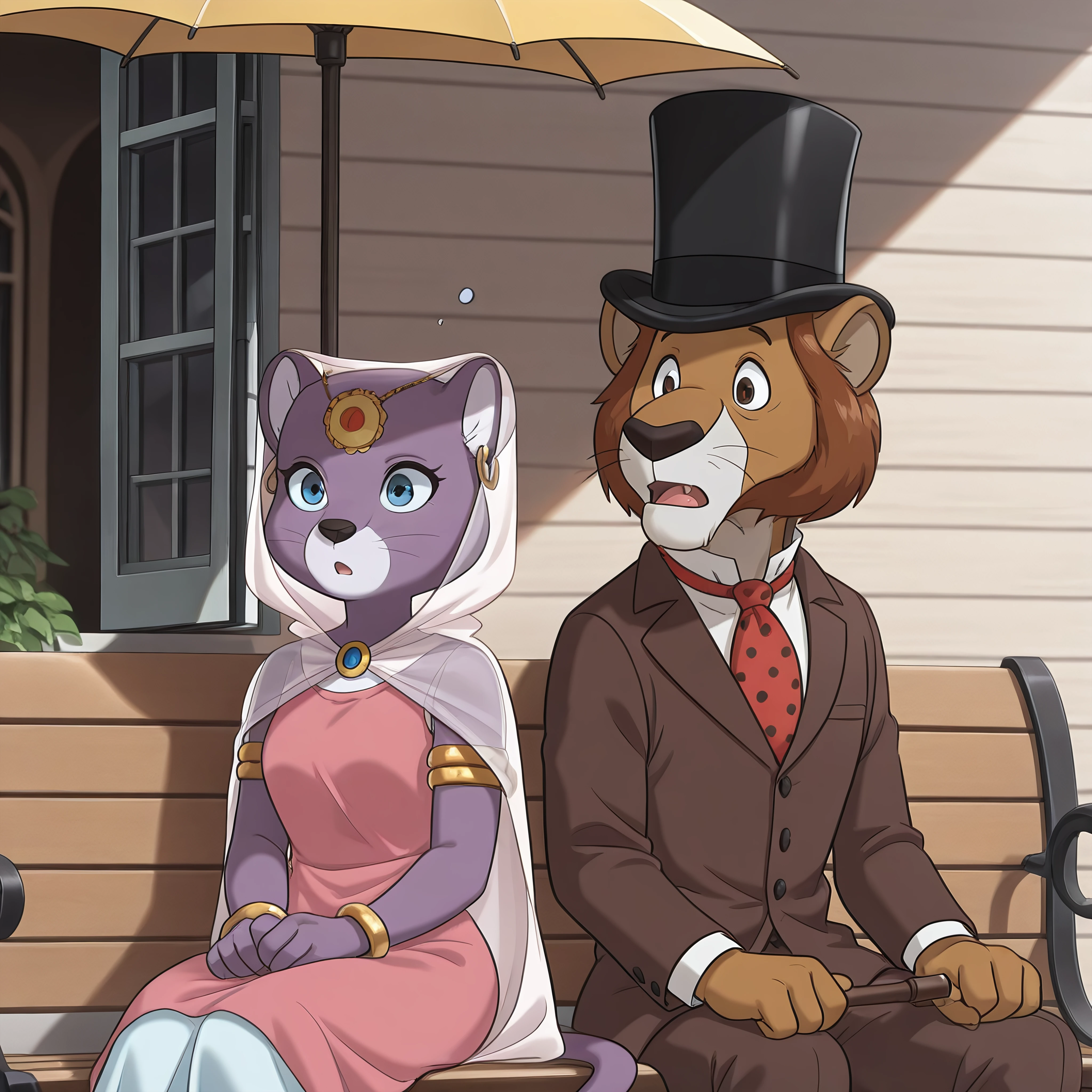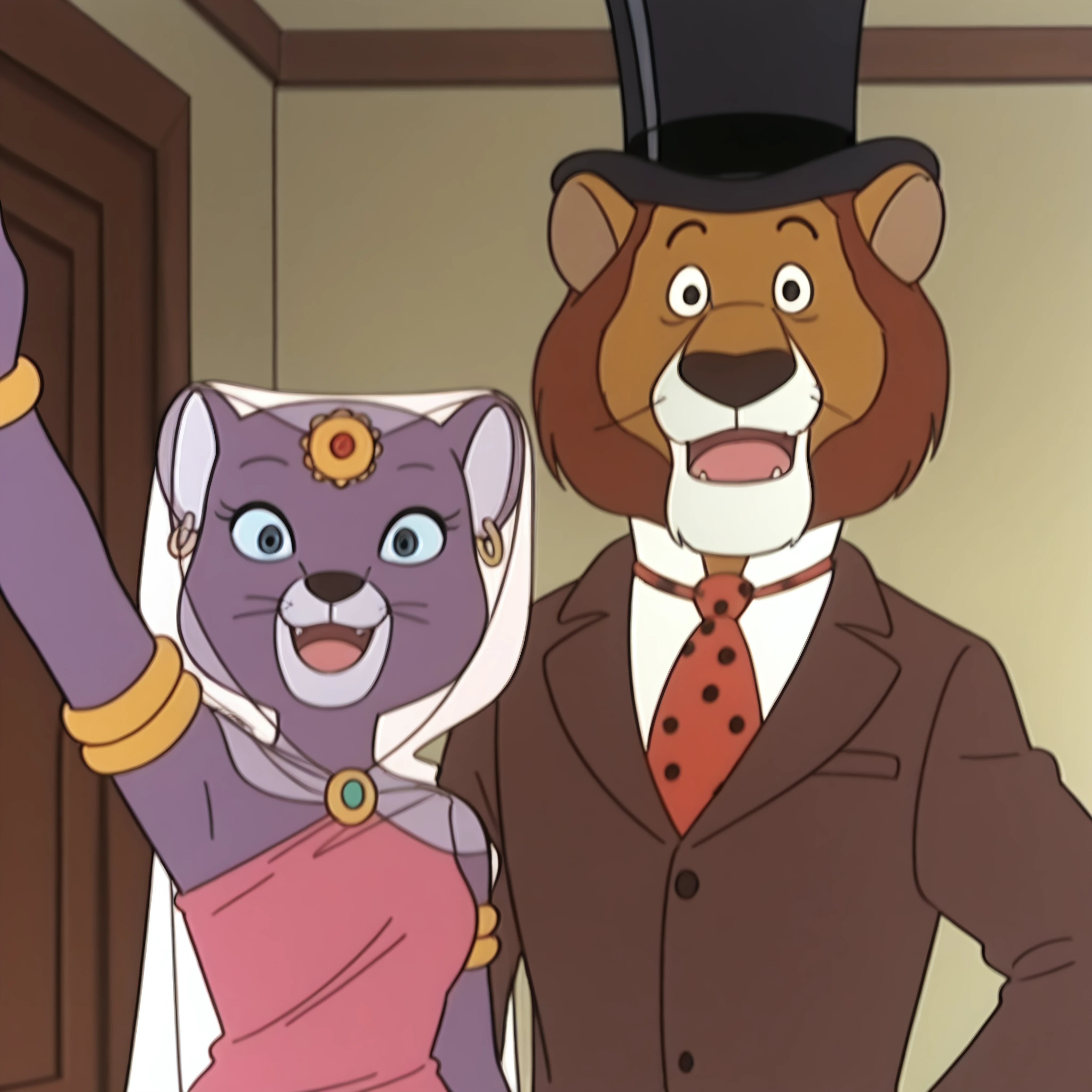 solo, originalstyle, Willy_fogatwwwf, male, suit, brown_suit, formal_wear, white_shirt, necktie, red_tie, polka_dot_tie, brown_trousers, black_hat, formal_hat,solo, originalstyle, Princess_Romyatwwwf, female, ornament forehead, gold earrings, veil, dress, gold bracelet, cape, for duo (unstable!):