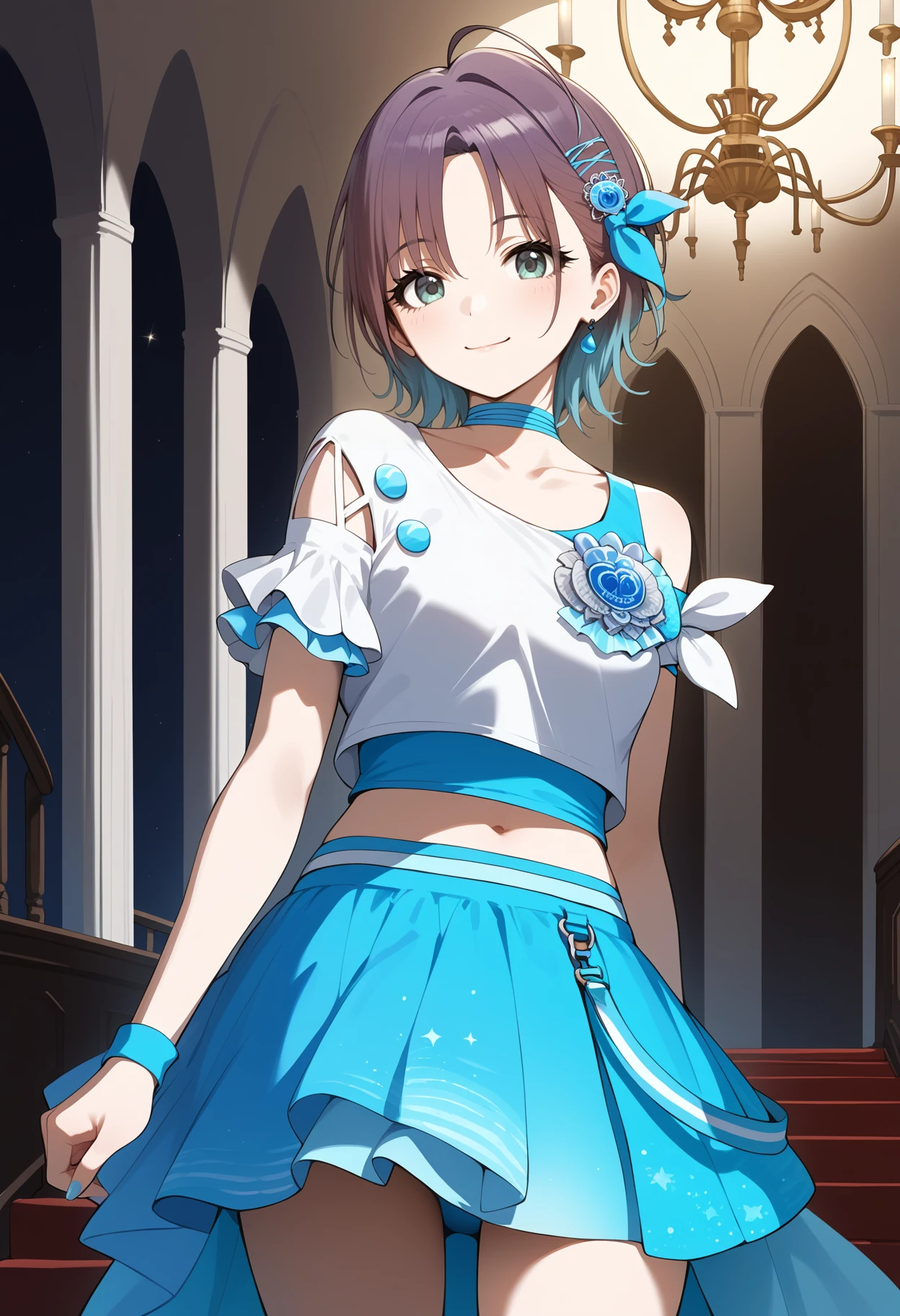 bbtoru, short hair, gradient hair, ahoge, hair ornament, hair ribbon, blue choker, collarbone, idol clothes, white shirt, shoulder cutout, short sleeves, midriff, blue skirt
