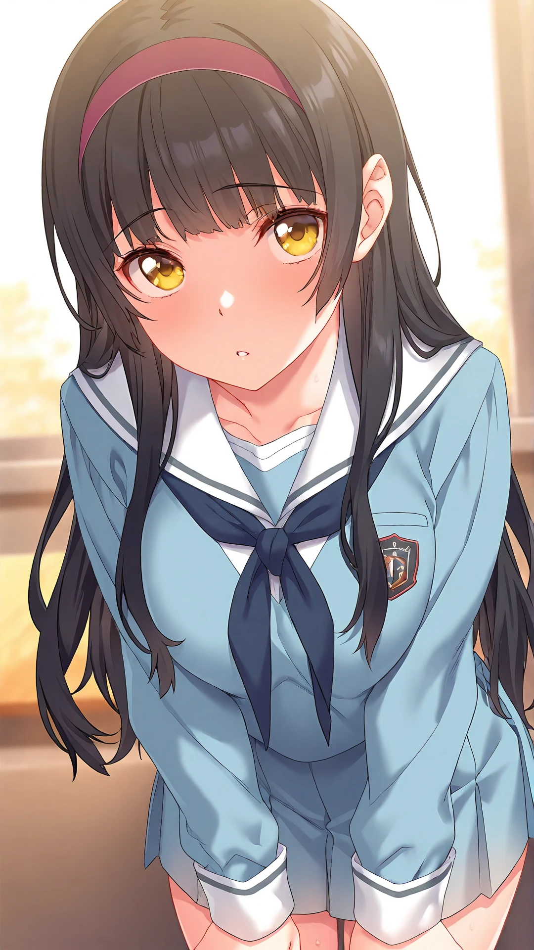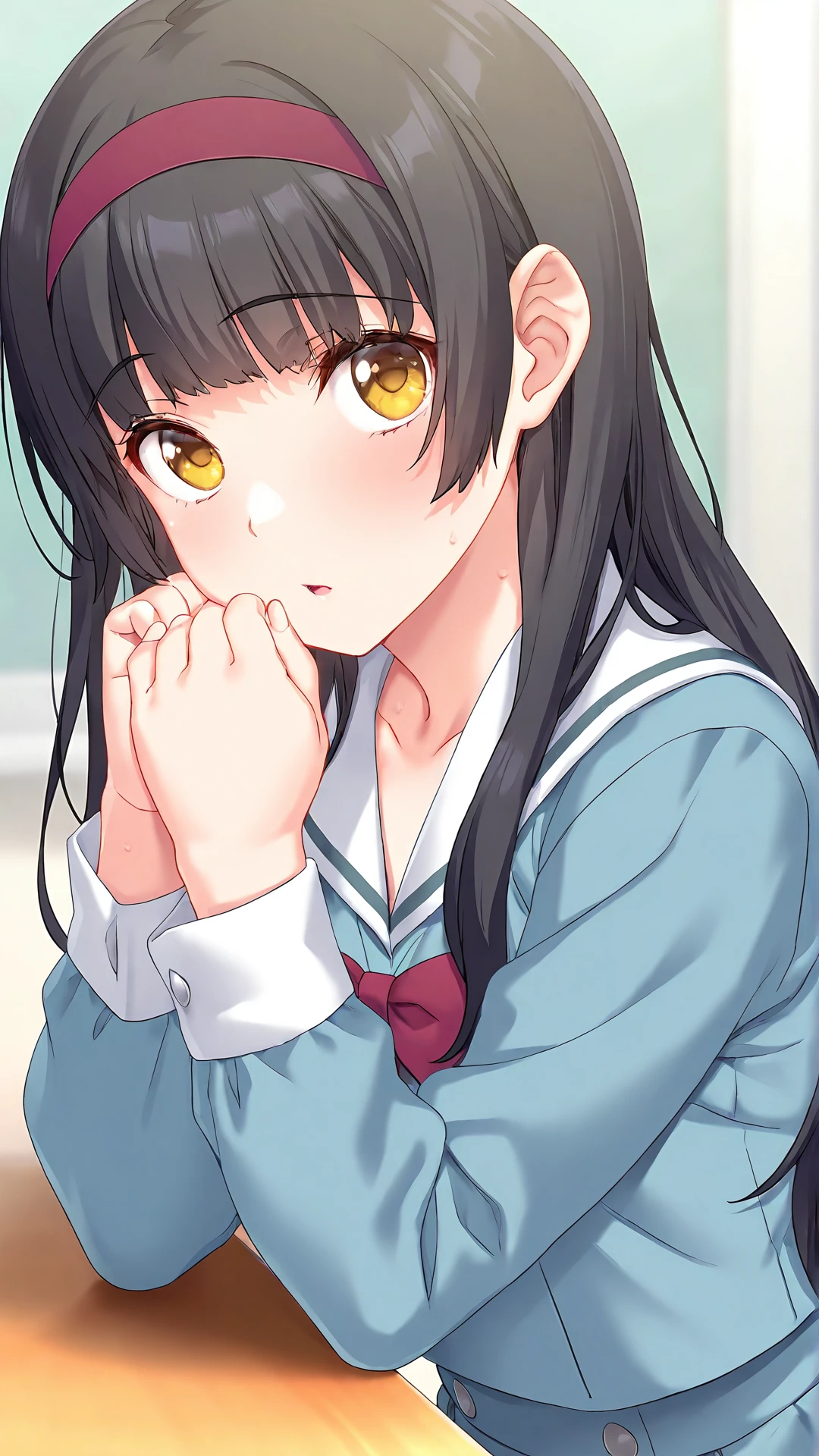 ,yaegashi aya,1girl,solo,black hair,long hair,hairband,yellow eyes,school uniform,