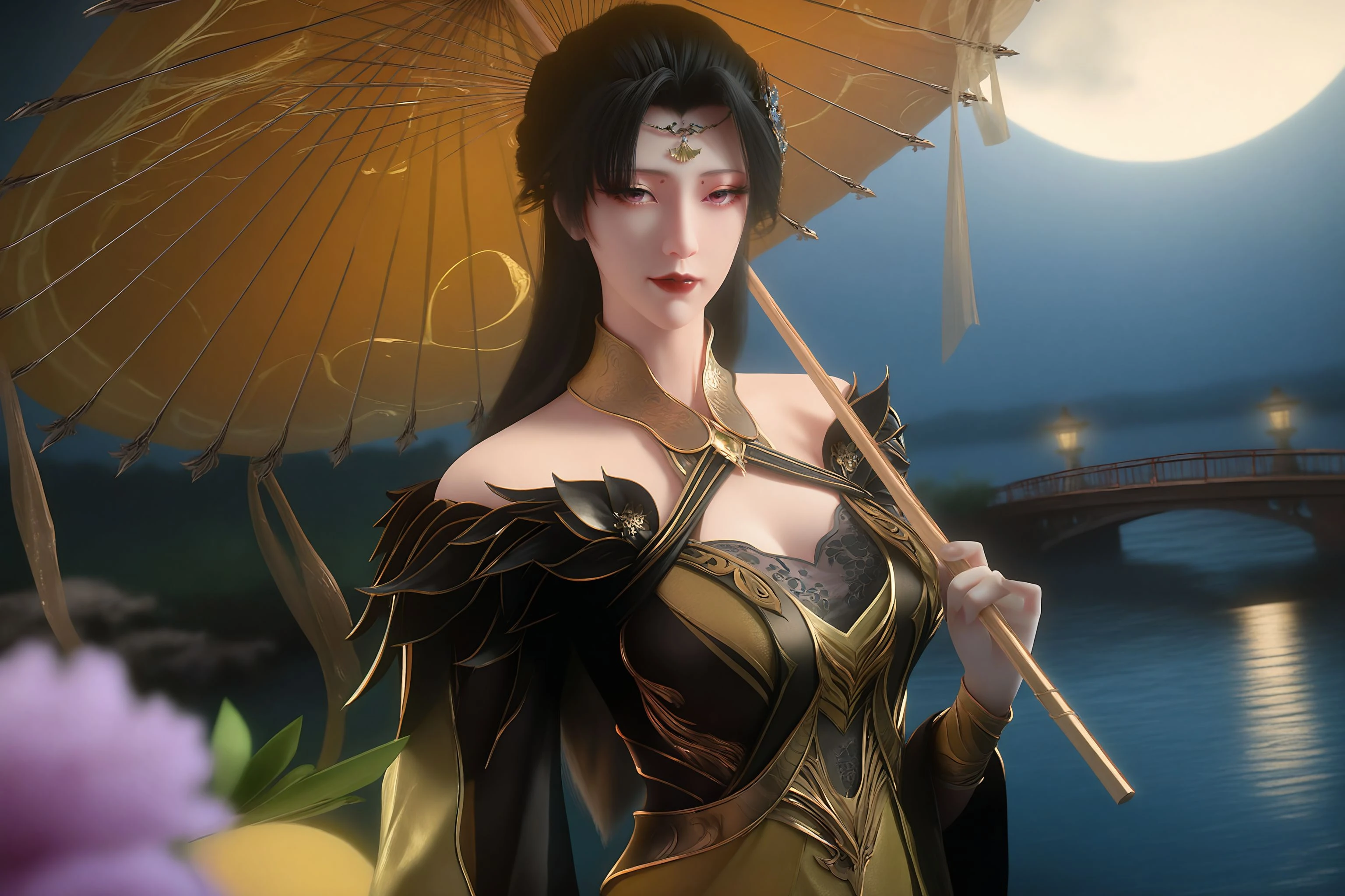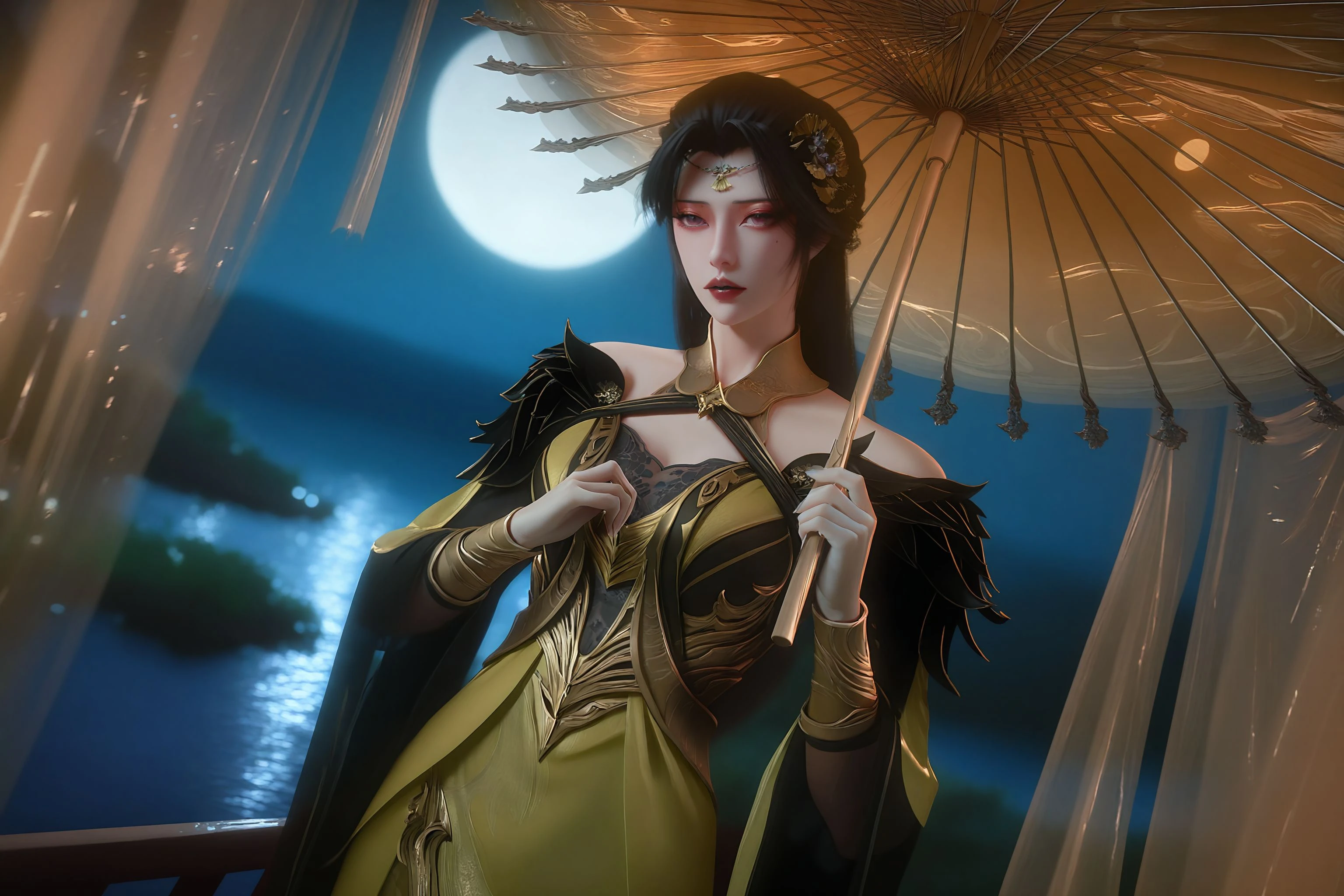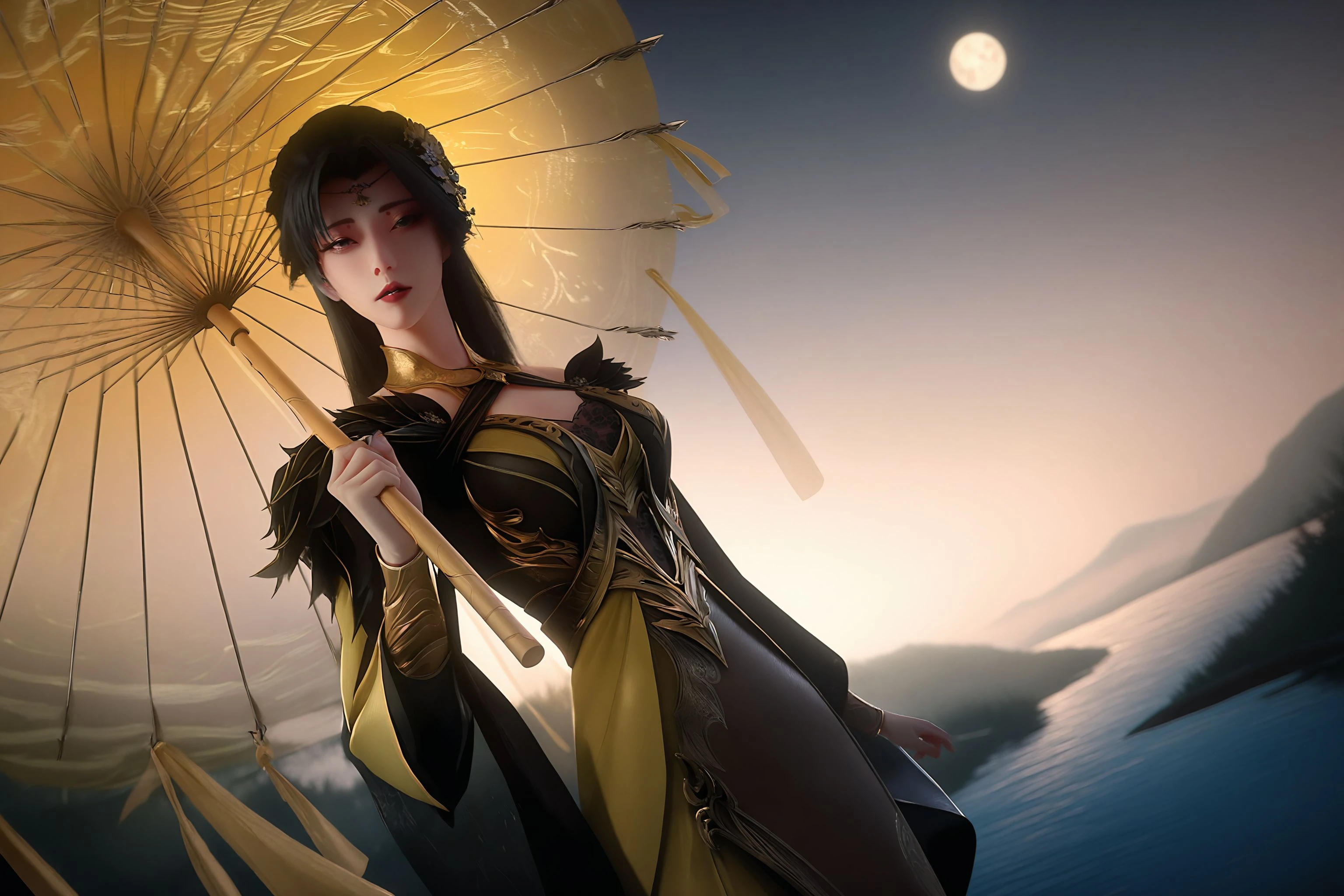 1girl,solo,hair ornament,dress,long hair,black hair,blonde dress,long sleeves,bare shoulders,parted lips,