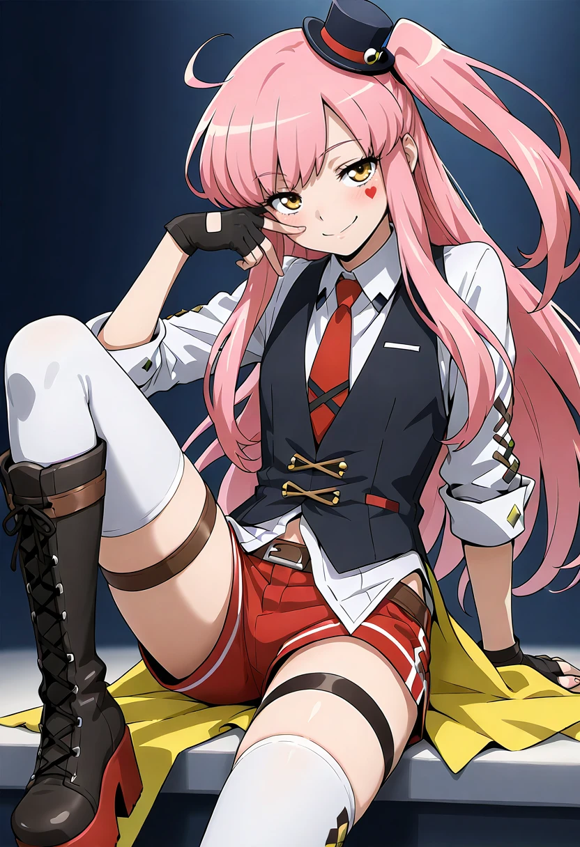 tetora_lh, glctc_idol, pink hair, ahoge, long hair, sidelocks, one side up, yellow eyes, facial tattoos, mini hat, black hat, red necktie, black waistcoat, white shirt, three-quarter sleeves, untucked shirt, black gloves, fingerless gloves, red shorts, yellow waist cape, white thighhighs, thigh strap, black boots, platform boots