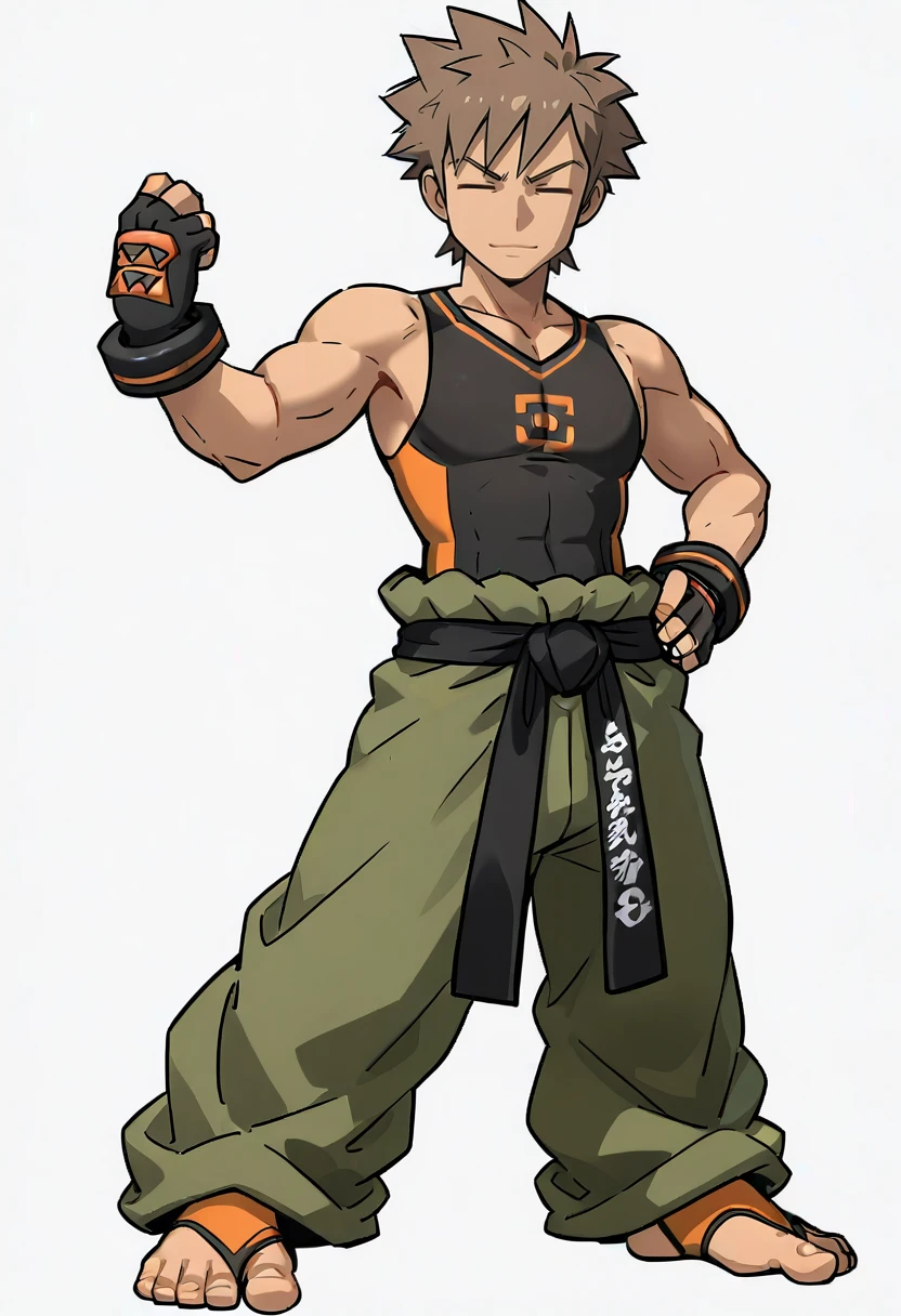 BrockPKMN, BrockSygna, 1boy, solo, closed_eyes, brown_hair, spiked_hair, short_hair, green_pants, baggy_pants, black_obi, fingerless_gloves, black_gloves, orange_patch, black_triangle_pattern_gloves, black_tank_top, orange_logo_on_shirt, orange_accent_on_gloves, orange_forefoot_socks_black_trim, exposed_toes, dark-skinned_male,