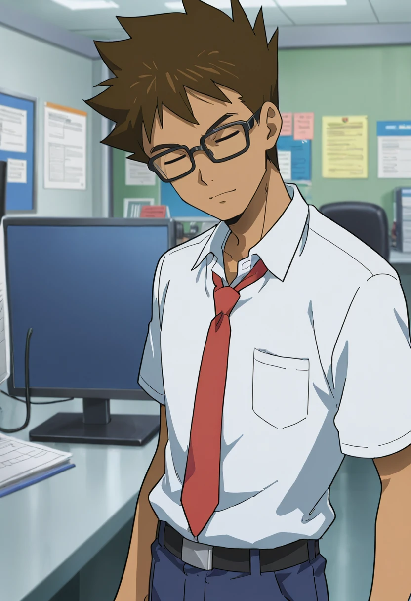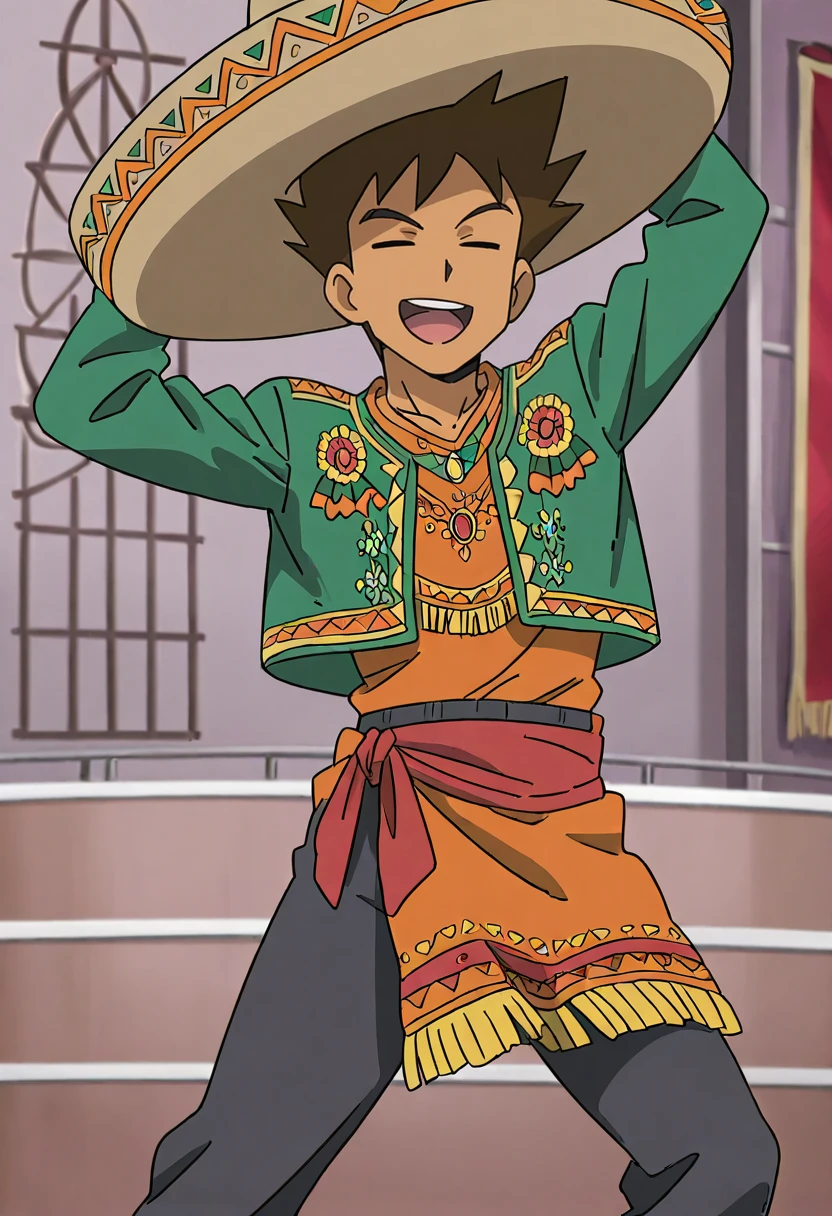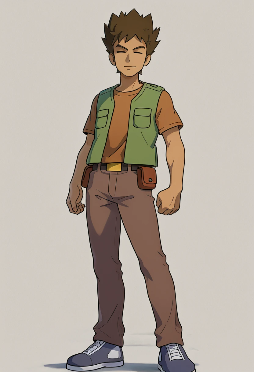 BrockPKMN, BrockSM, 1boy, solo, brown_shirt, green_sleeveless_jacket, closed_eyes, brown_pants, dark_blue_shoes, brown_belt_pouches, black_belt, gold_buckle, brown_hair, short_hair, spiked_hair, dark-skinned_male, straight_bar_lacing