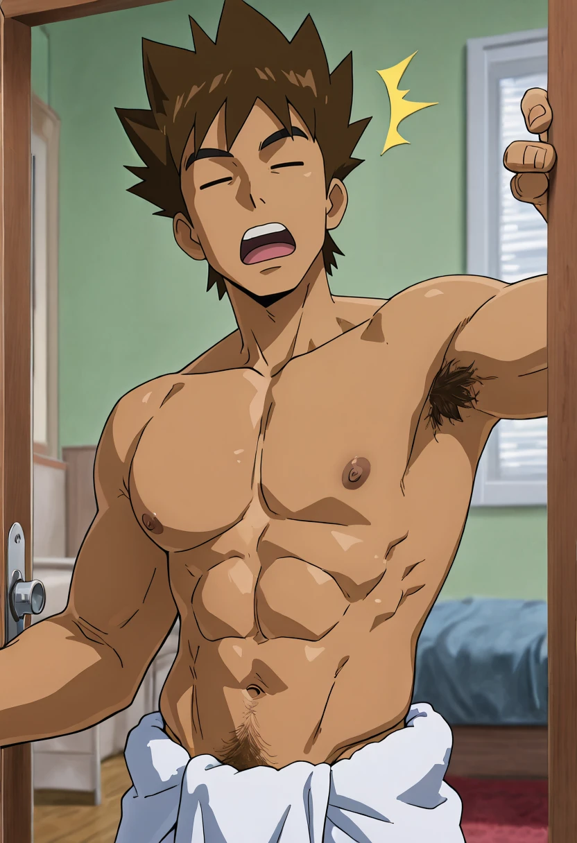 BrockPKMN, 1boy, solo, closed_eyes, brown_hair, spiked_hair, short_hair, dark-skinned_male