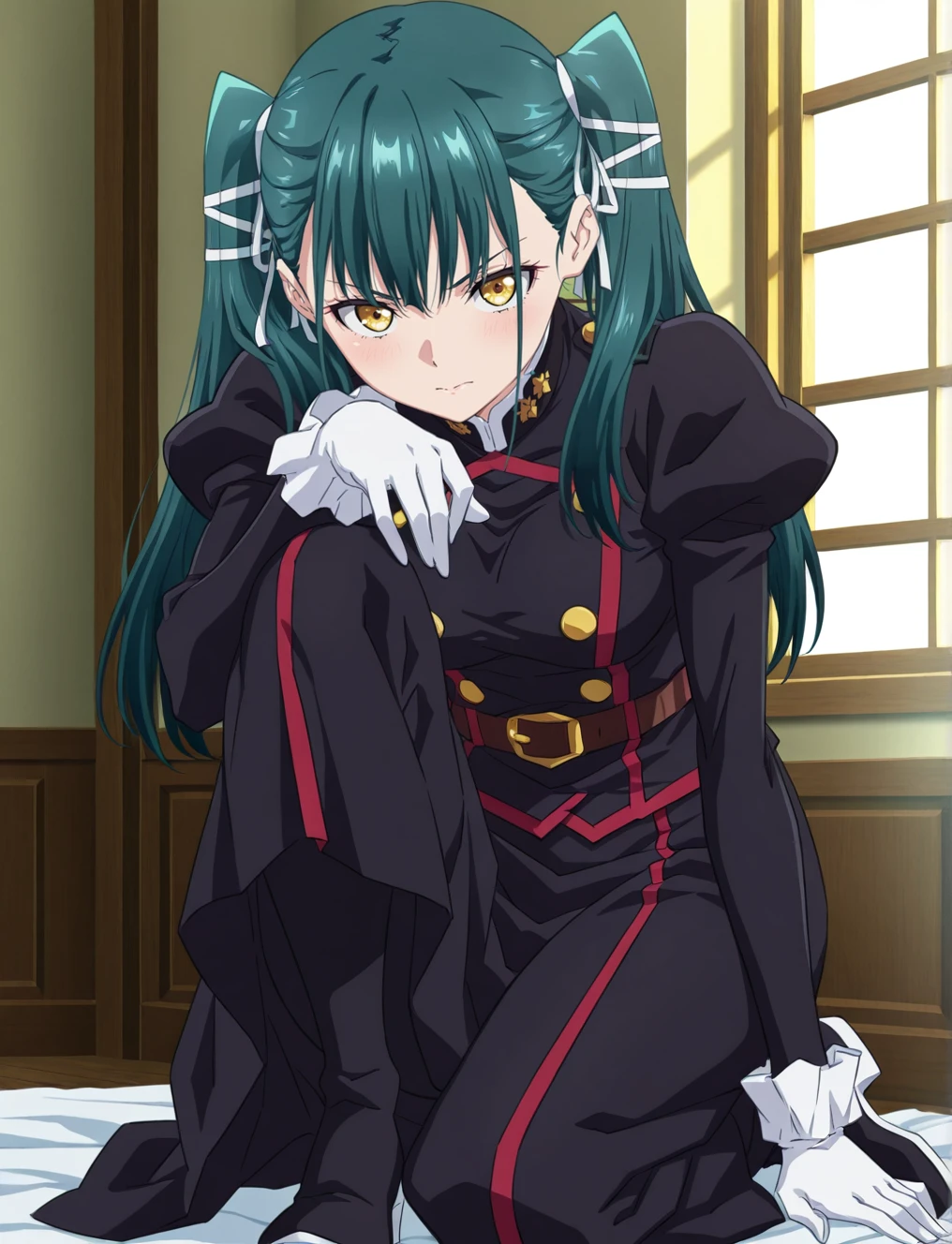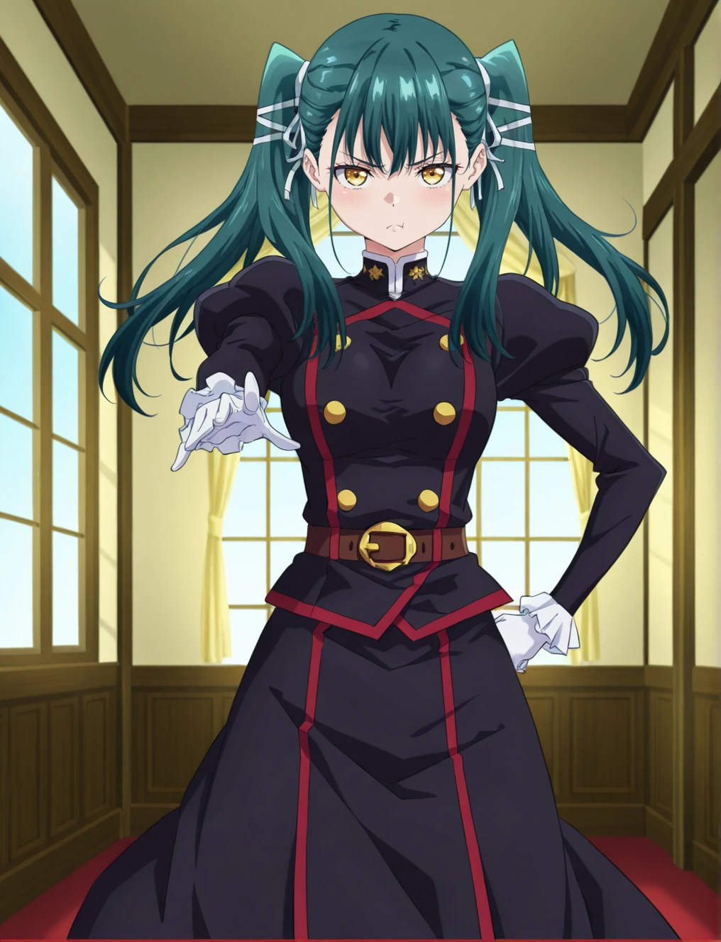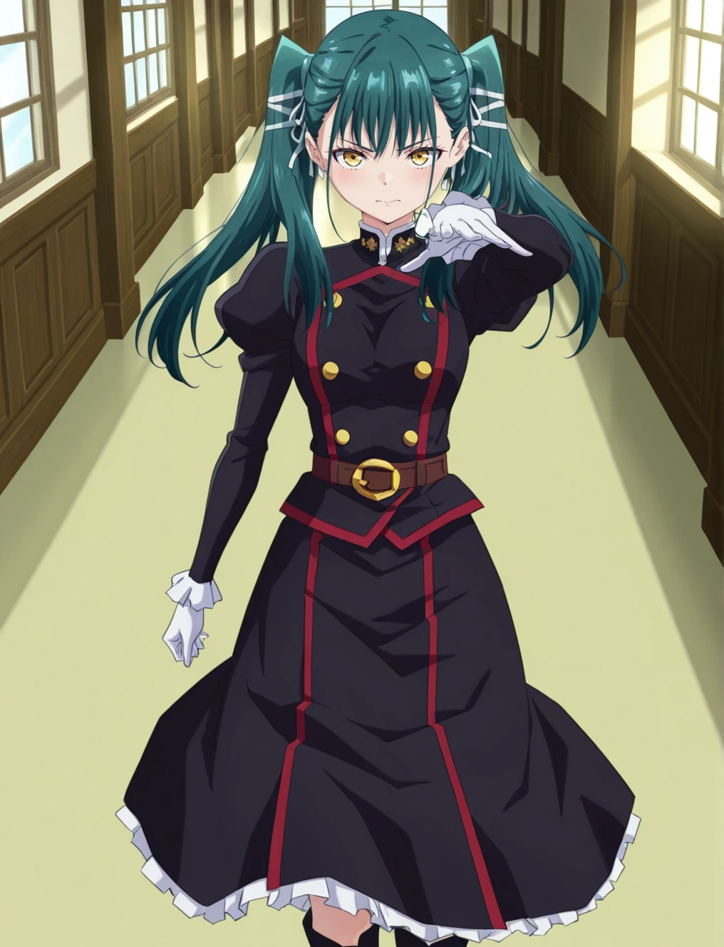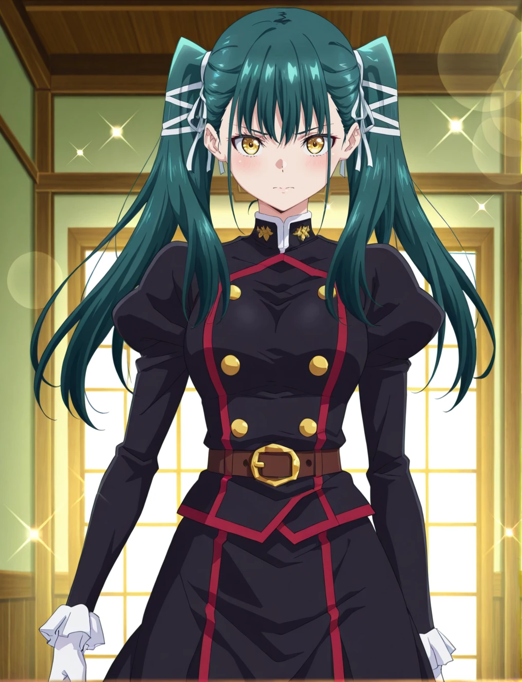 yachiho azuma (mato seihei no slave), 1girl, long hair, twintails, green hair, yellow eyes