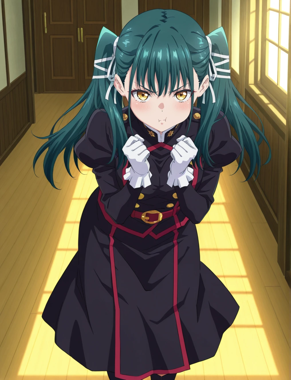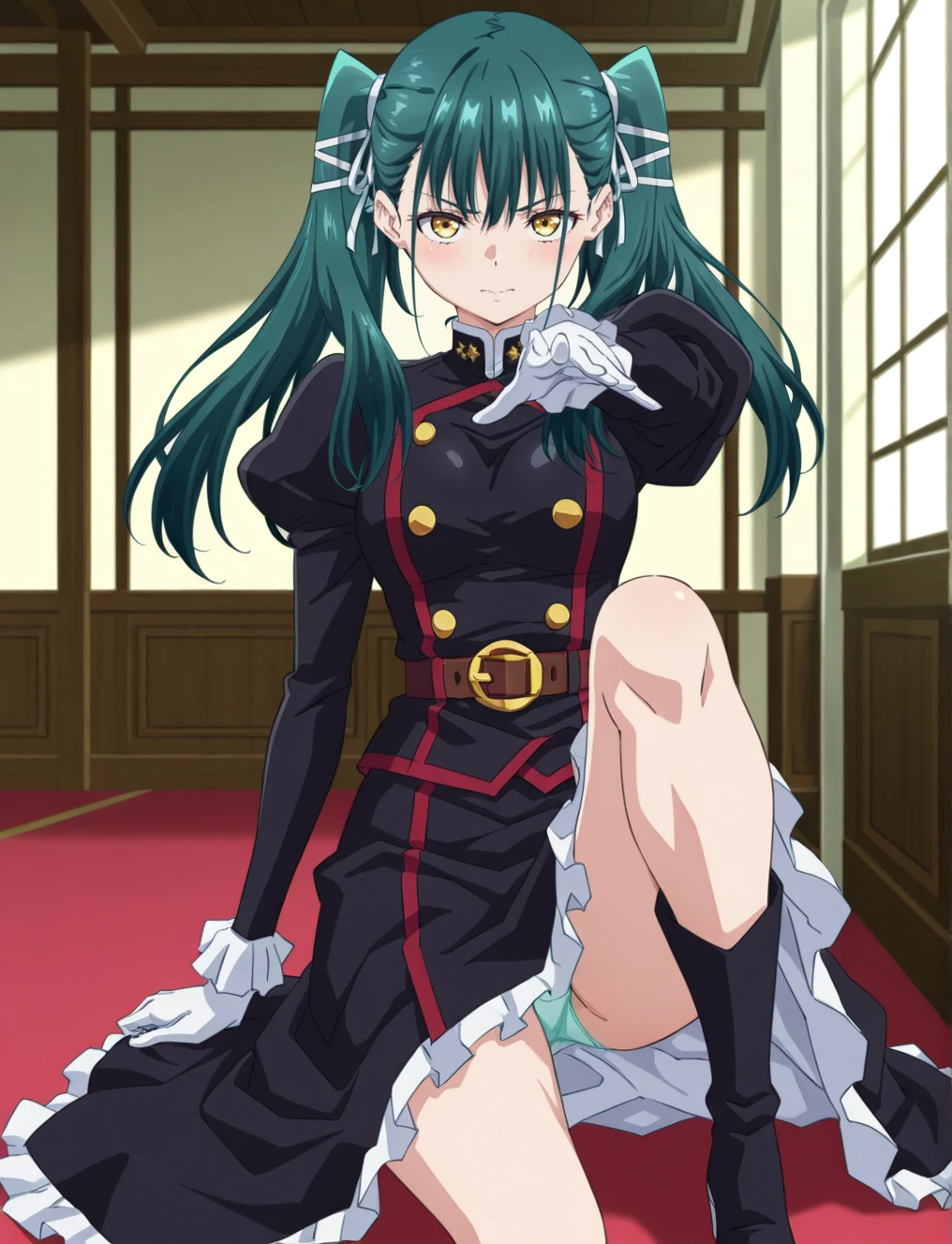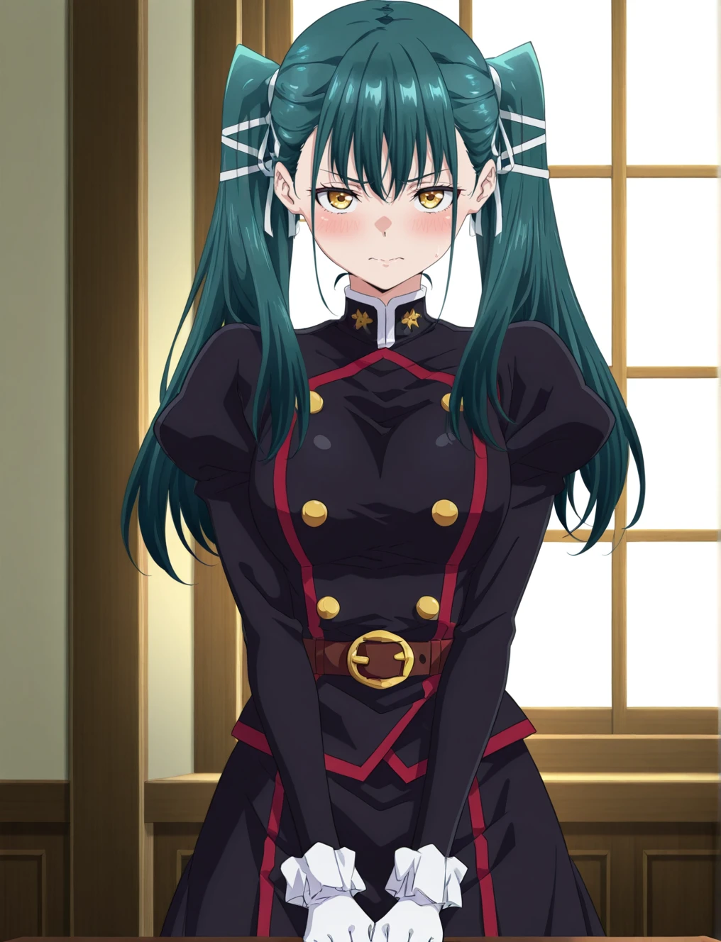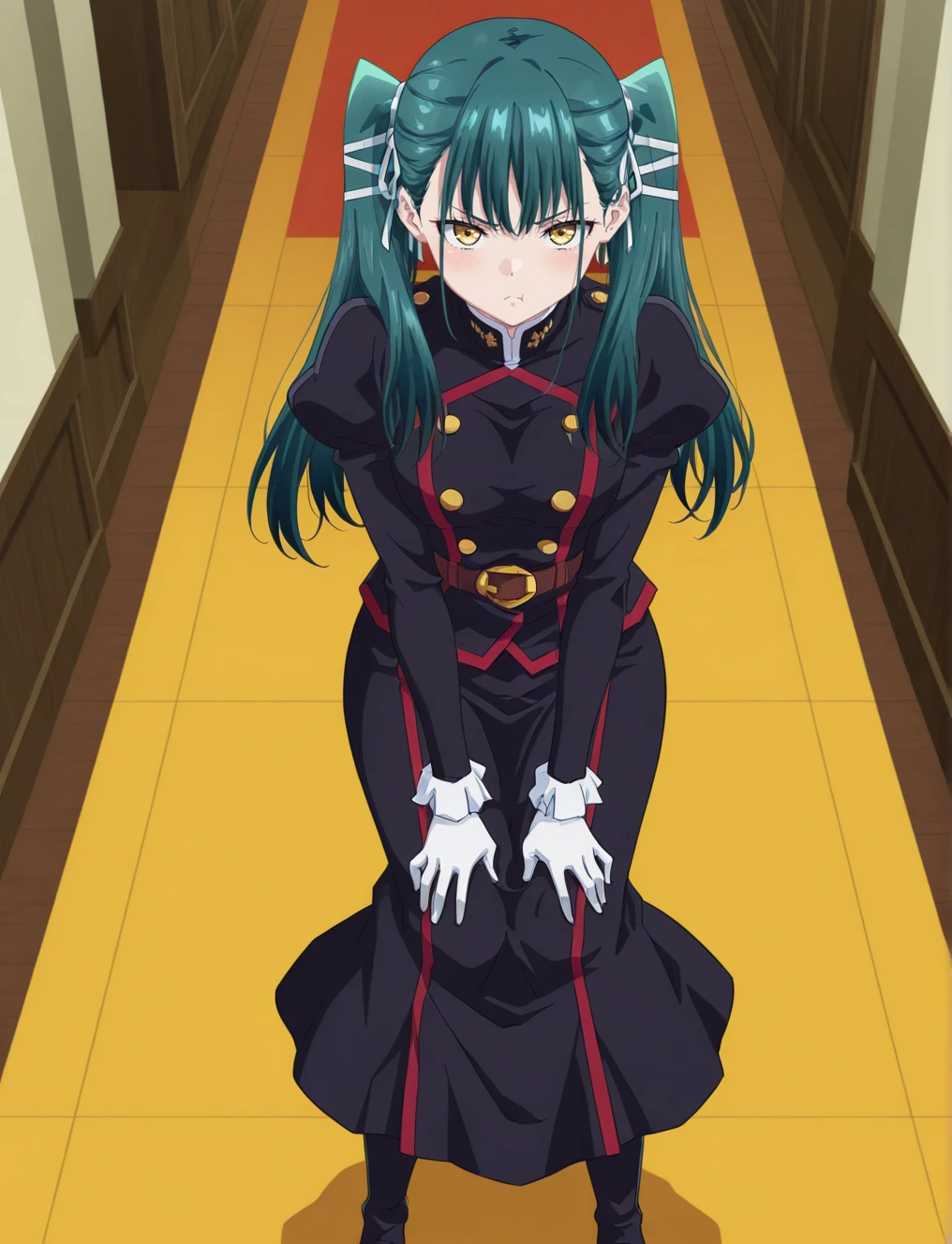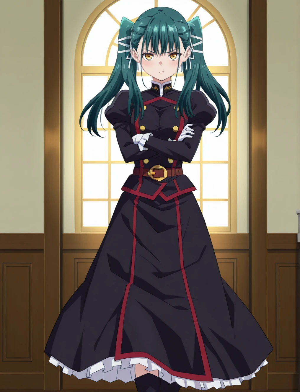 yachiho azuma (mato seihei no slave), 1girl, long hair, twintails, green hair, yellow eyes