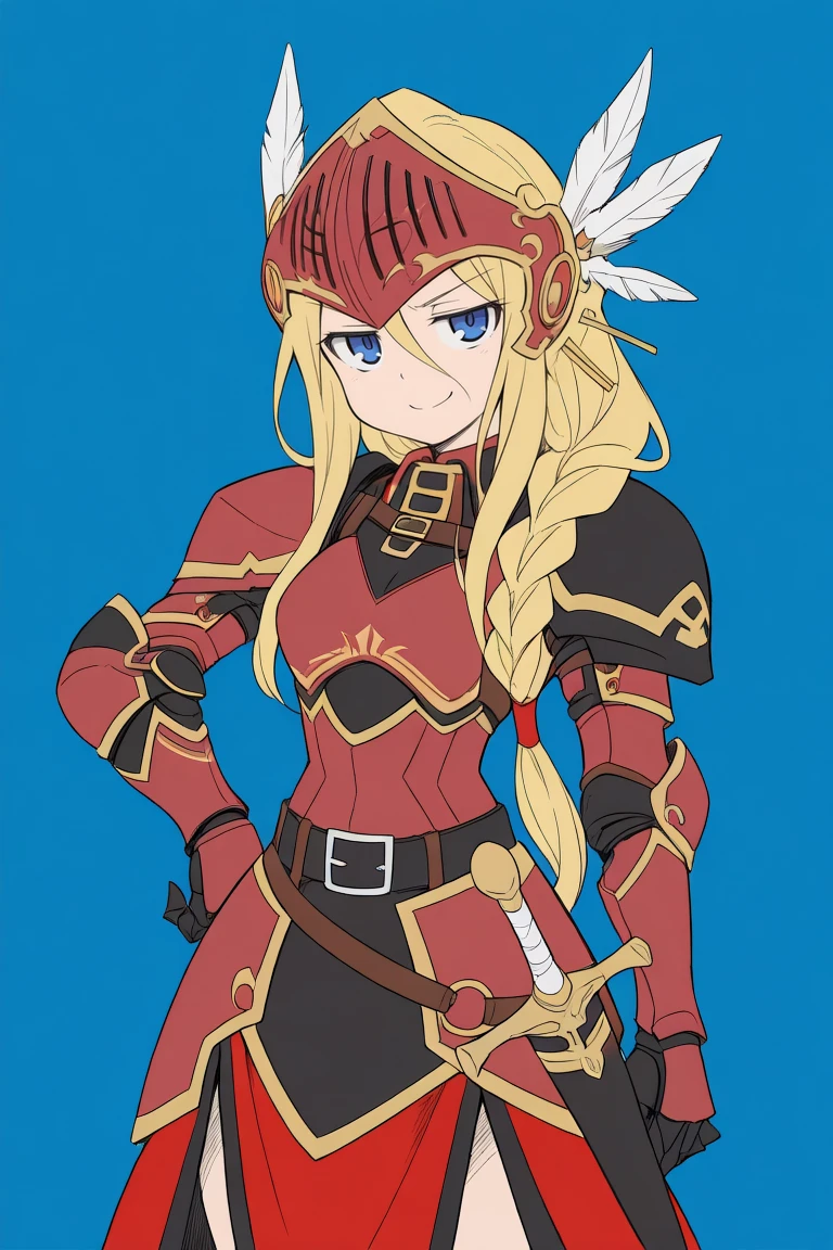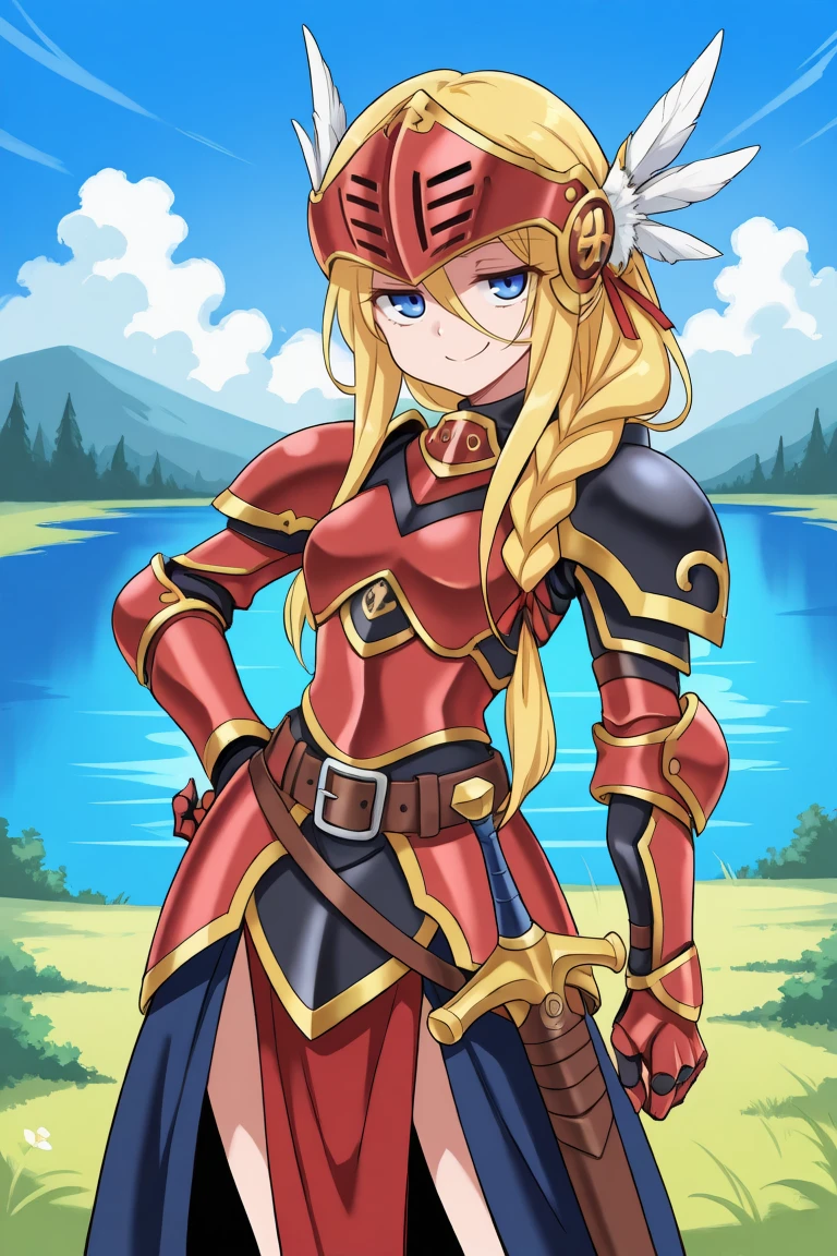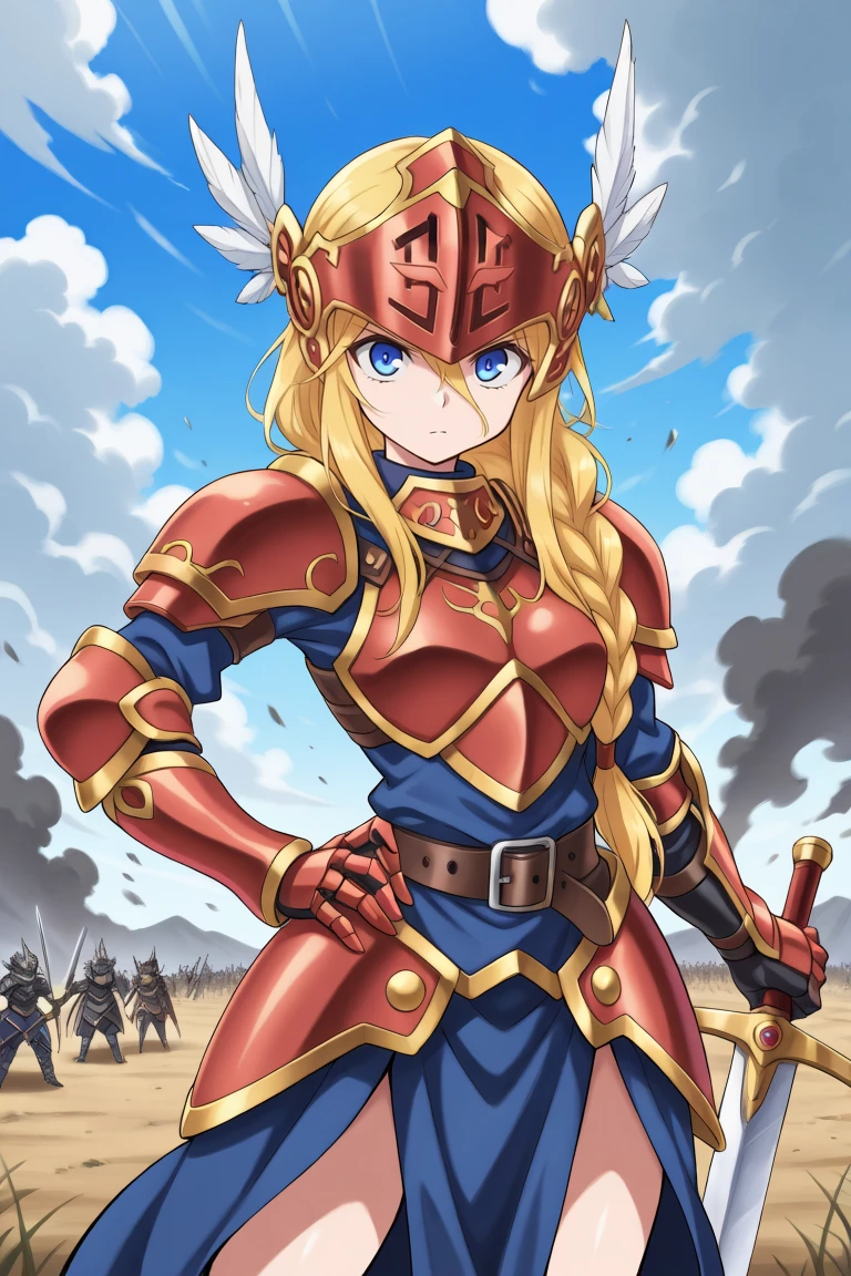 Helpful Tags: 1girl, blonde hair, long hair, braid, blue eyes, valkyrie, visor (armor), winged helmet, armored dress, armor, gauntlets, boots,