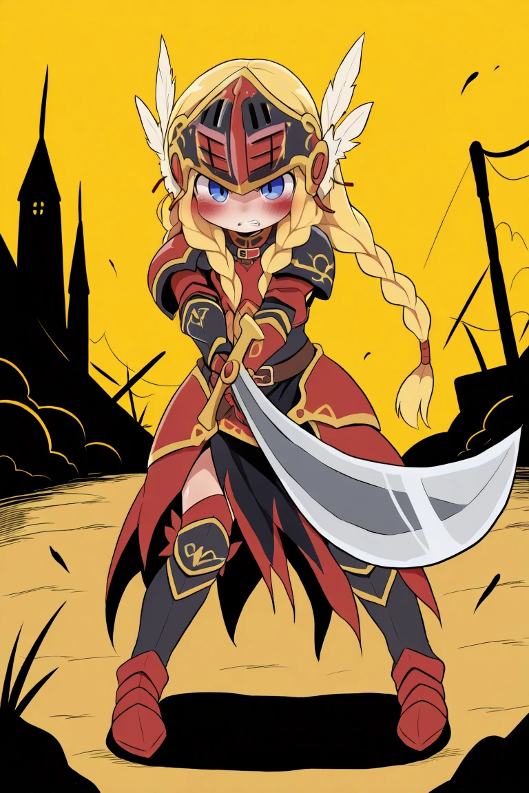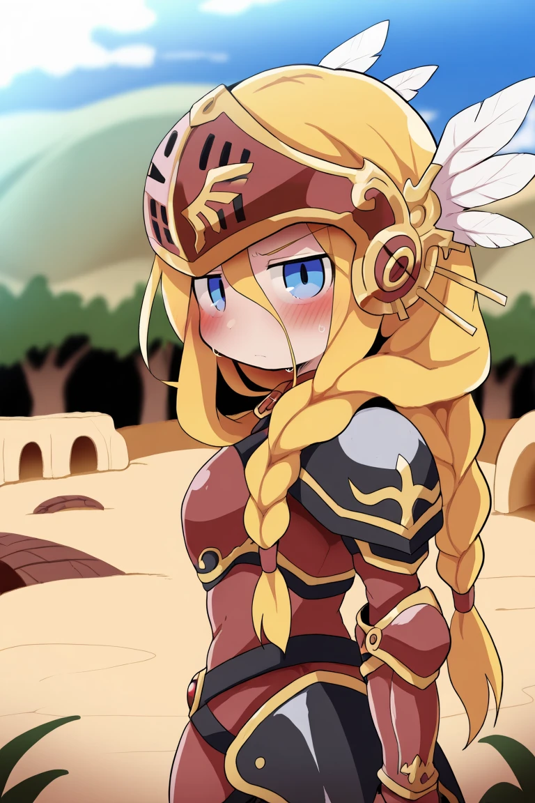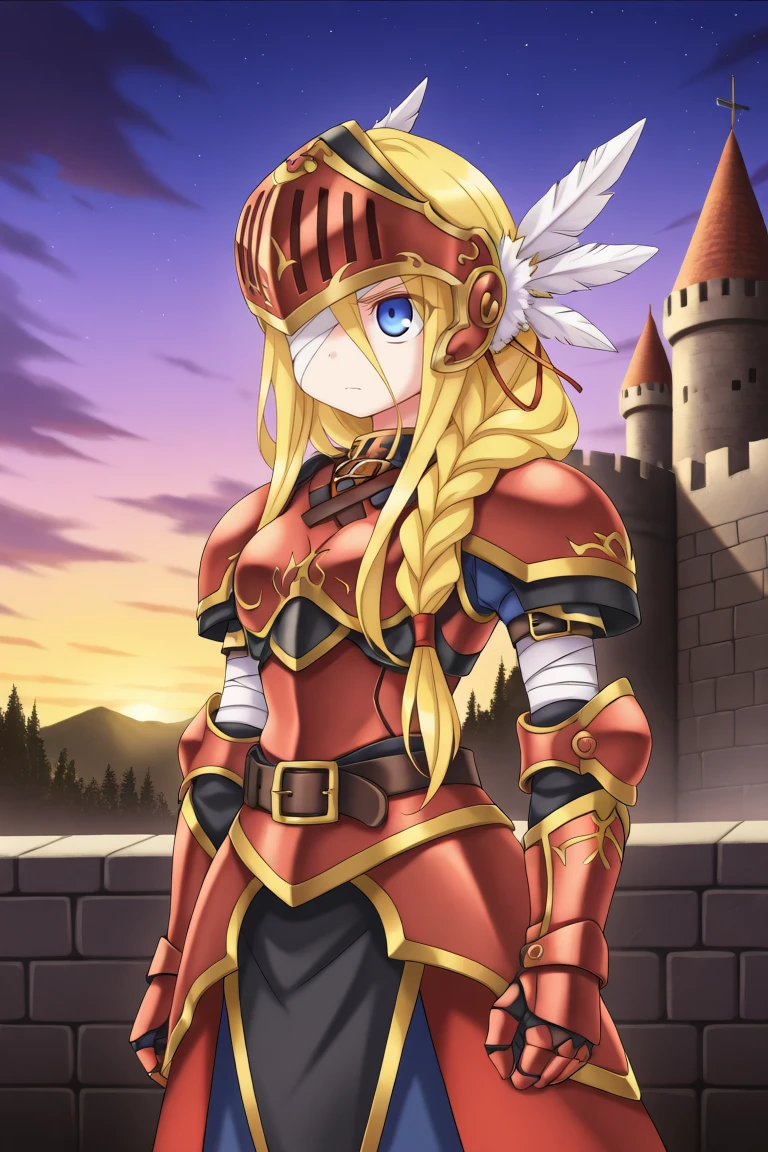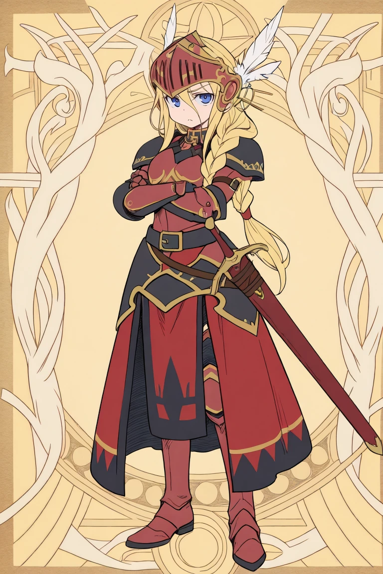 Helpful Tags: 1girl, blonde hair, long hair, braid, blue eyes, valkyrie, visor (armor), winged helmet, armored dress, armor, gauntlets, boots,